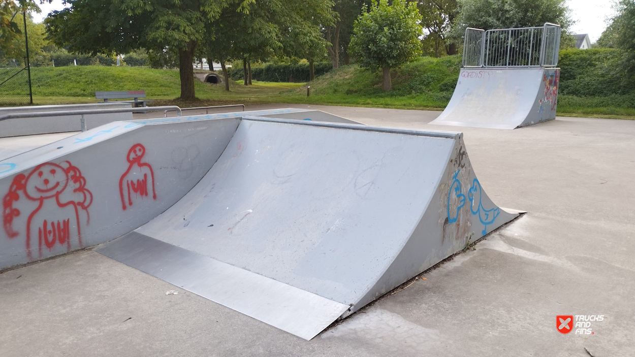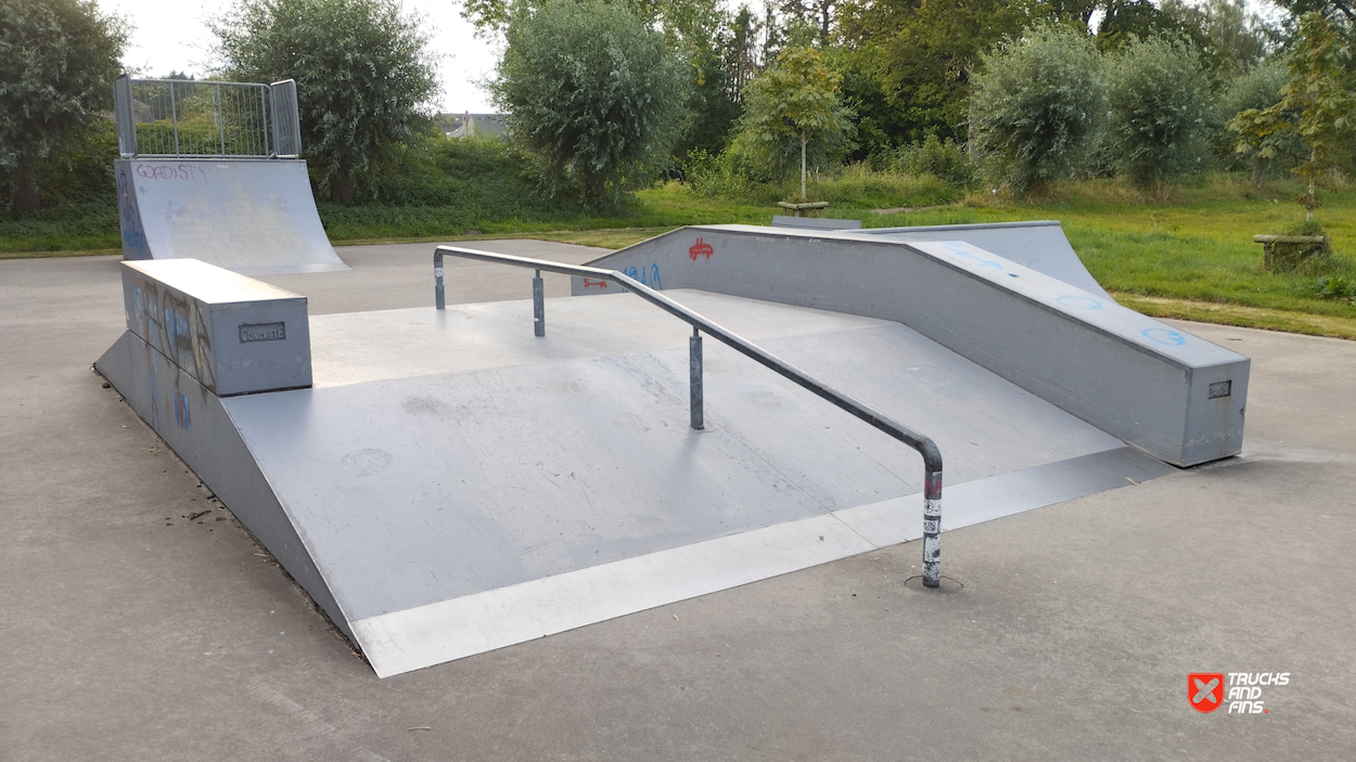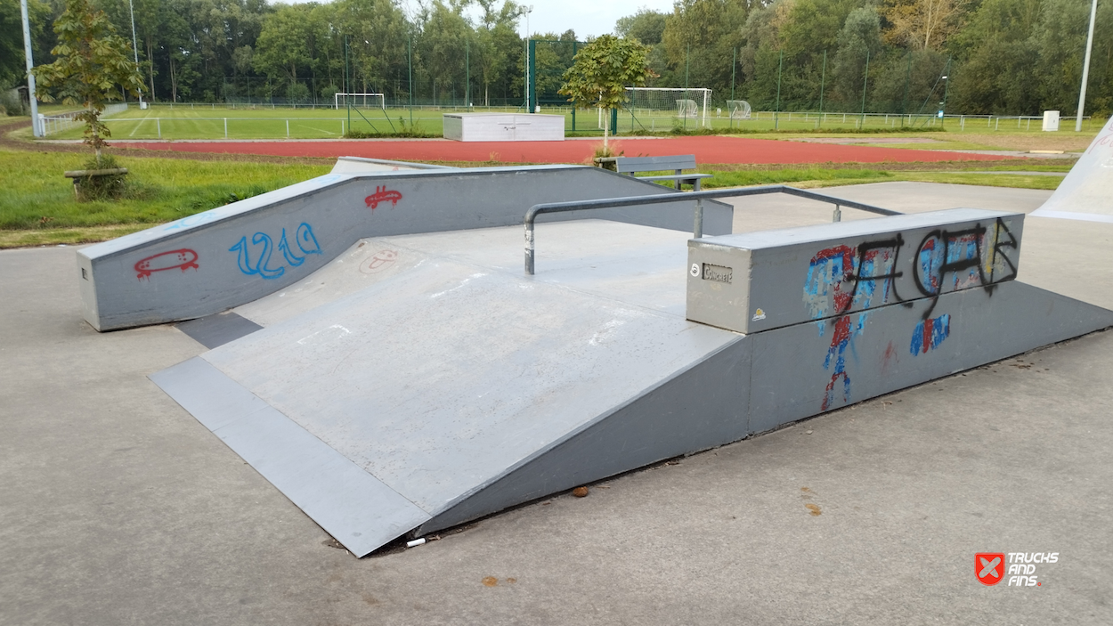 Oostkamp skatepark is made up of a back and forth run with a quarter pipe and flat bank on either side of a funbox. The skatepark was built by Concrete Rudolph.