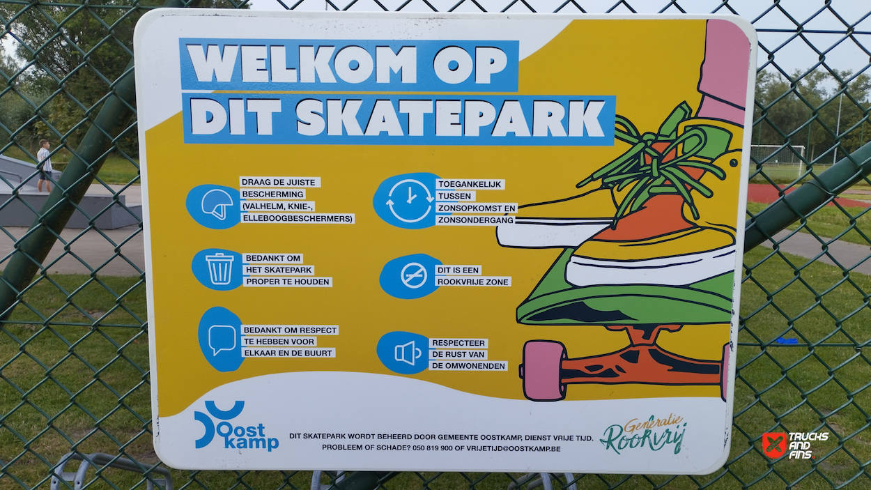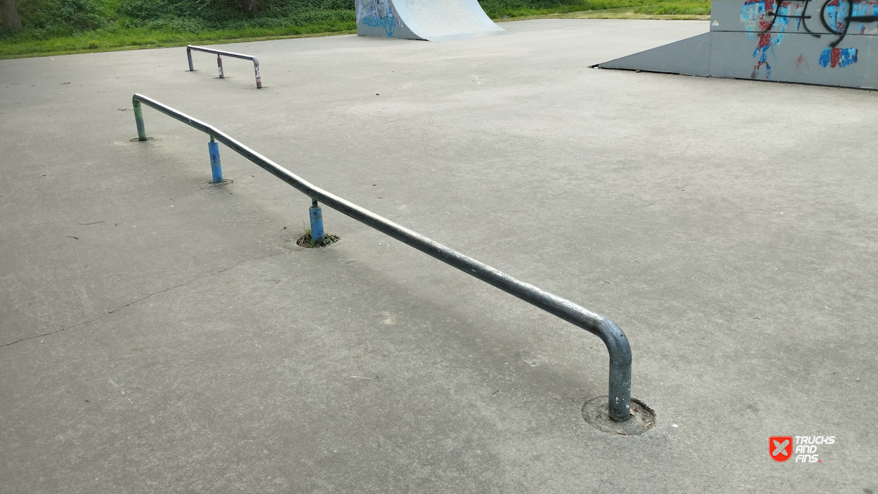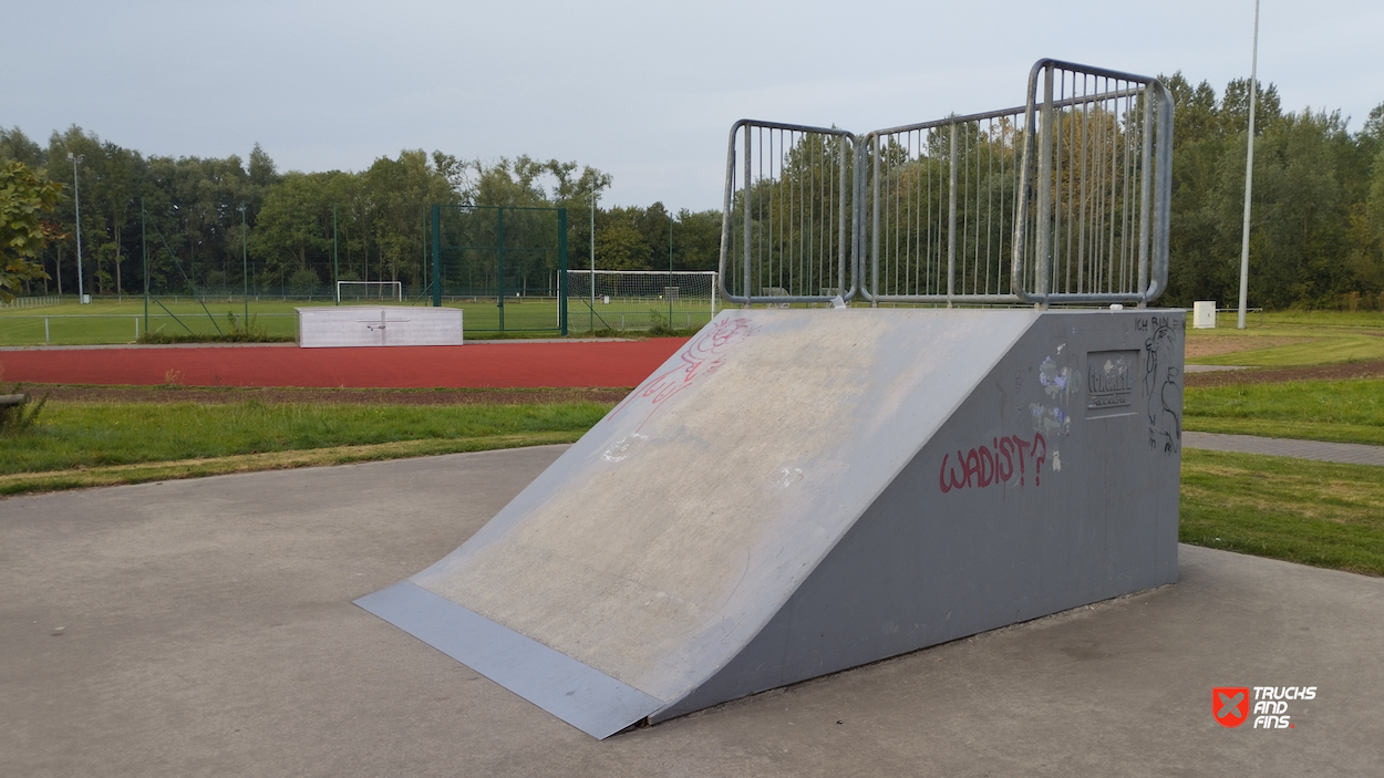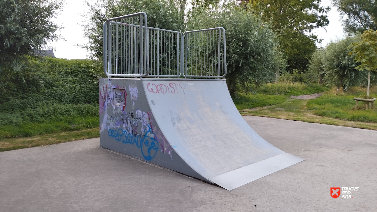 Oostkamp skatepark is made up of a back and forth run with a quarter pipe and flat bank on either side of a funbox. The skatepark was built by Concrete Rudolph.
