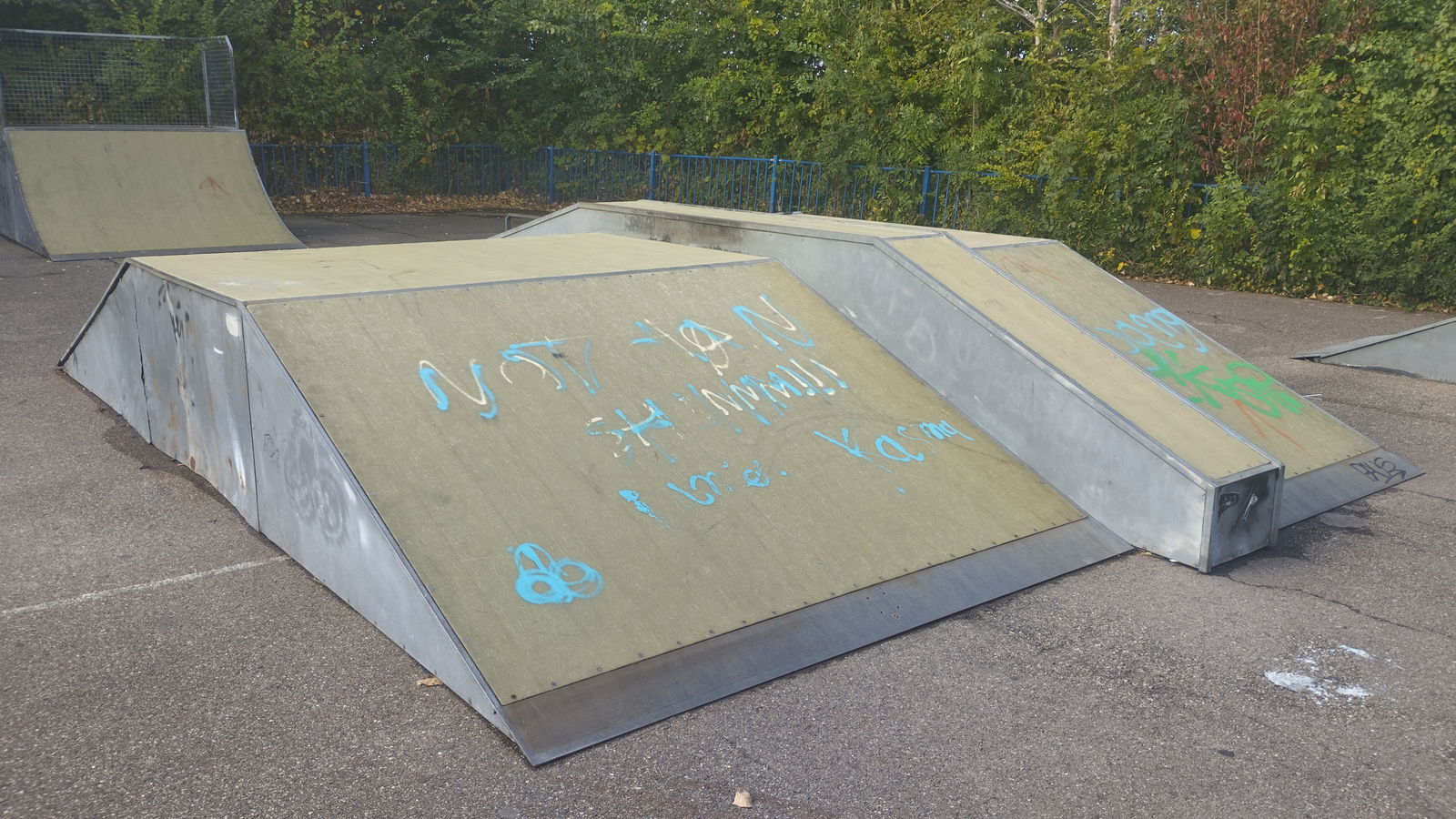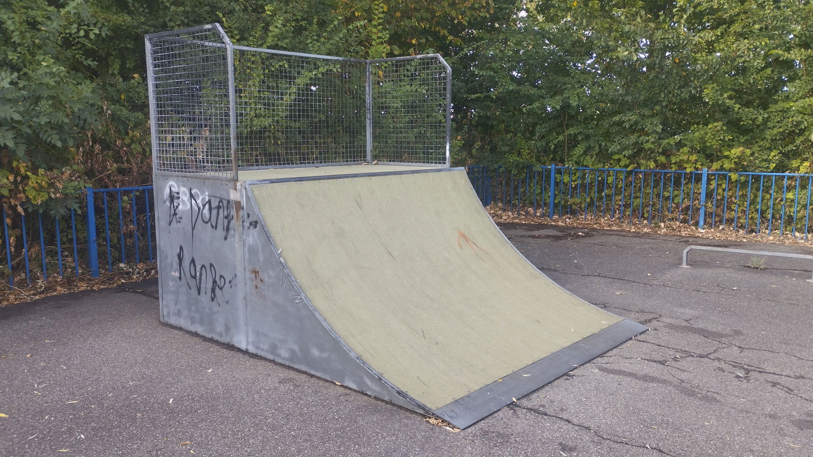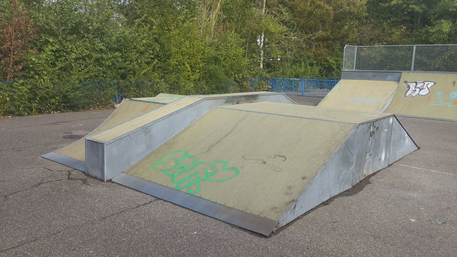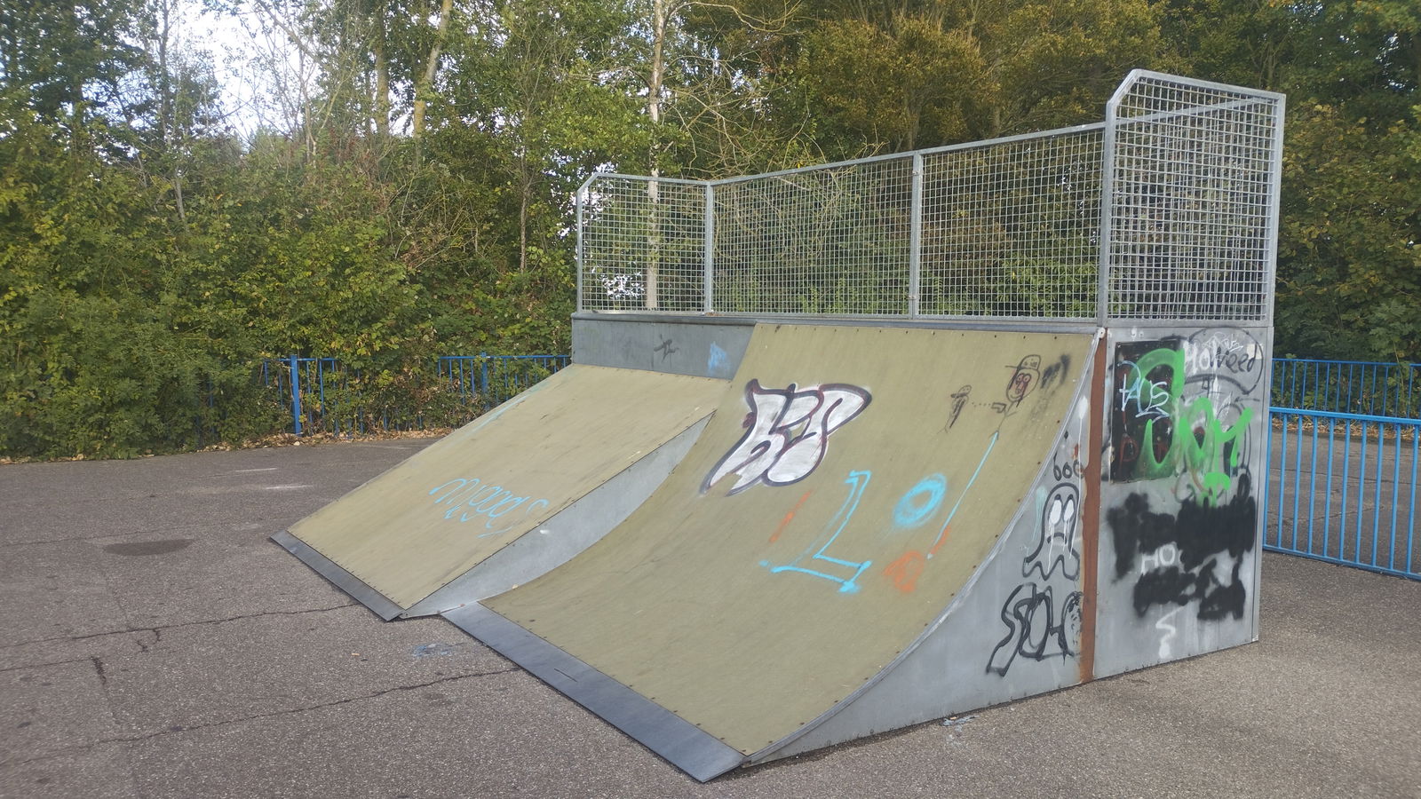 Oostvoorne skatepark is made up of a fibre back and forth run with a quarter pipe and flat bank on the sides of a funbox.