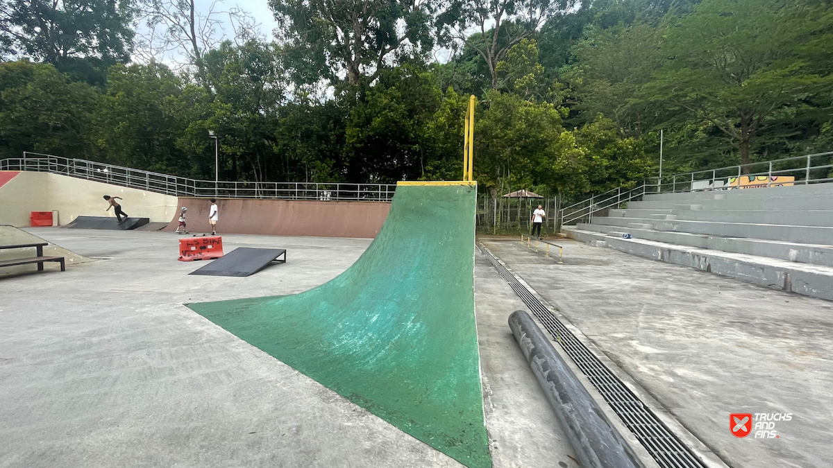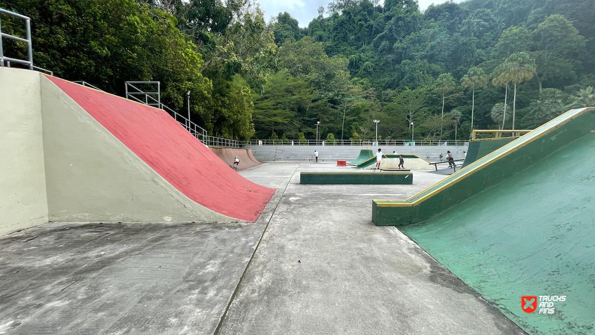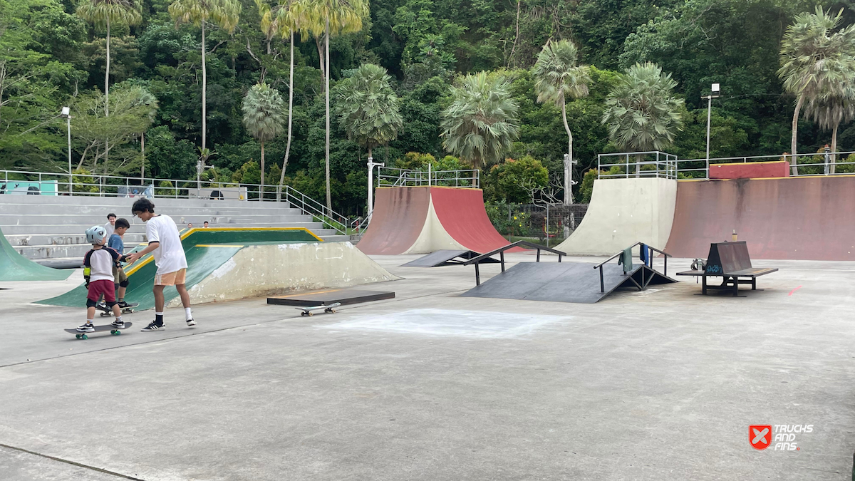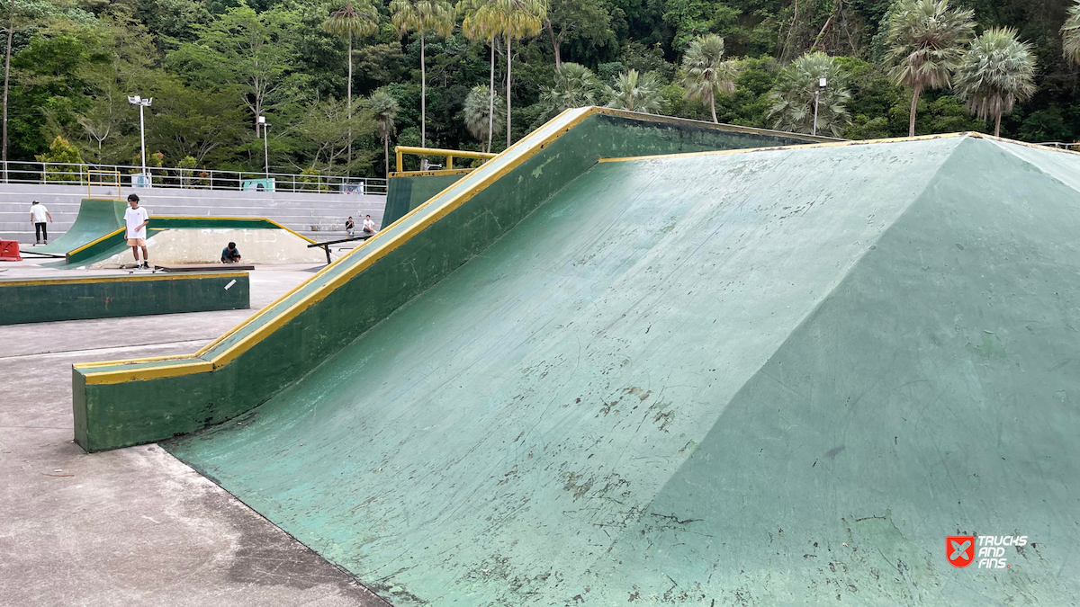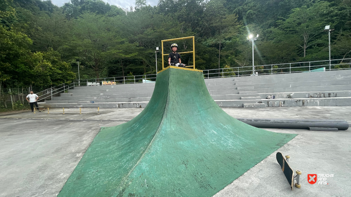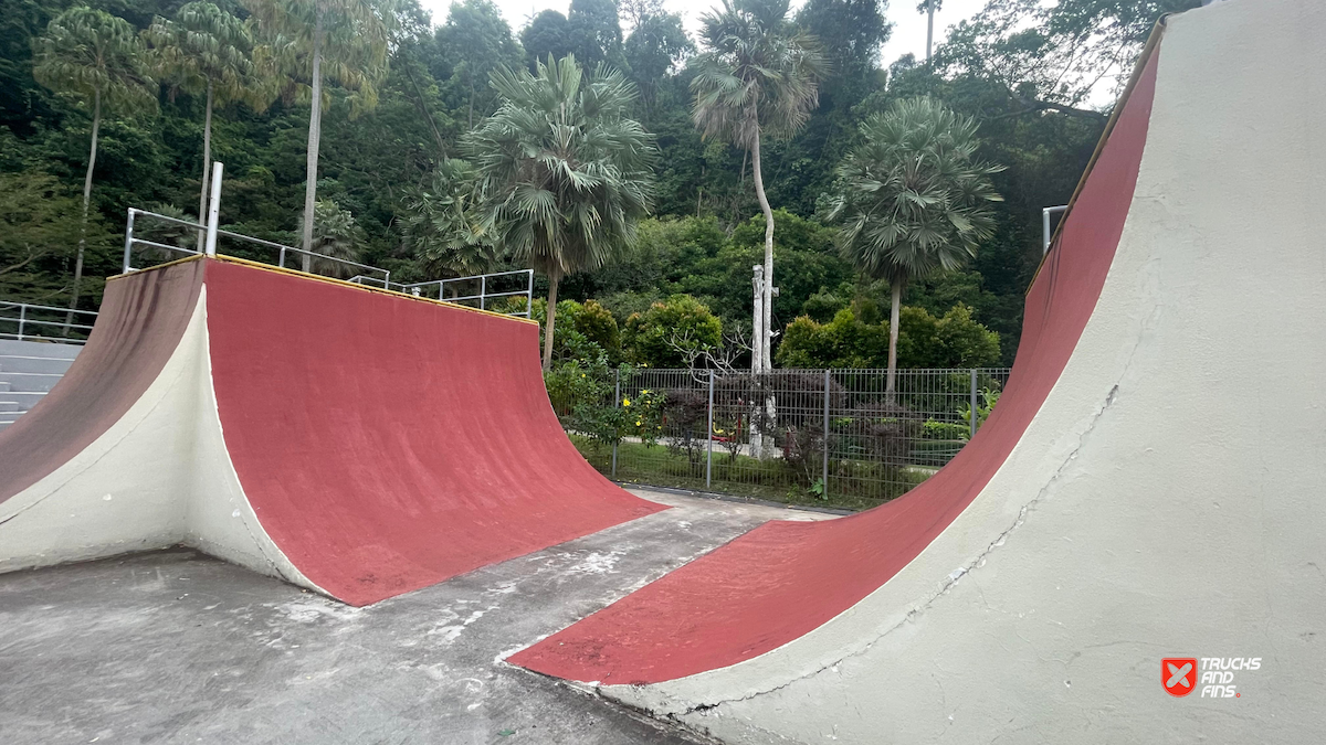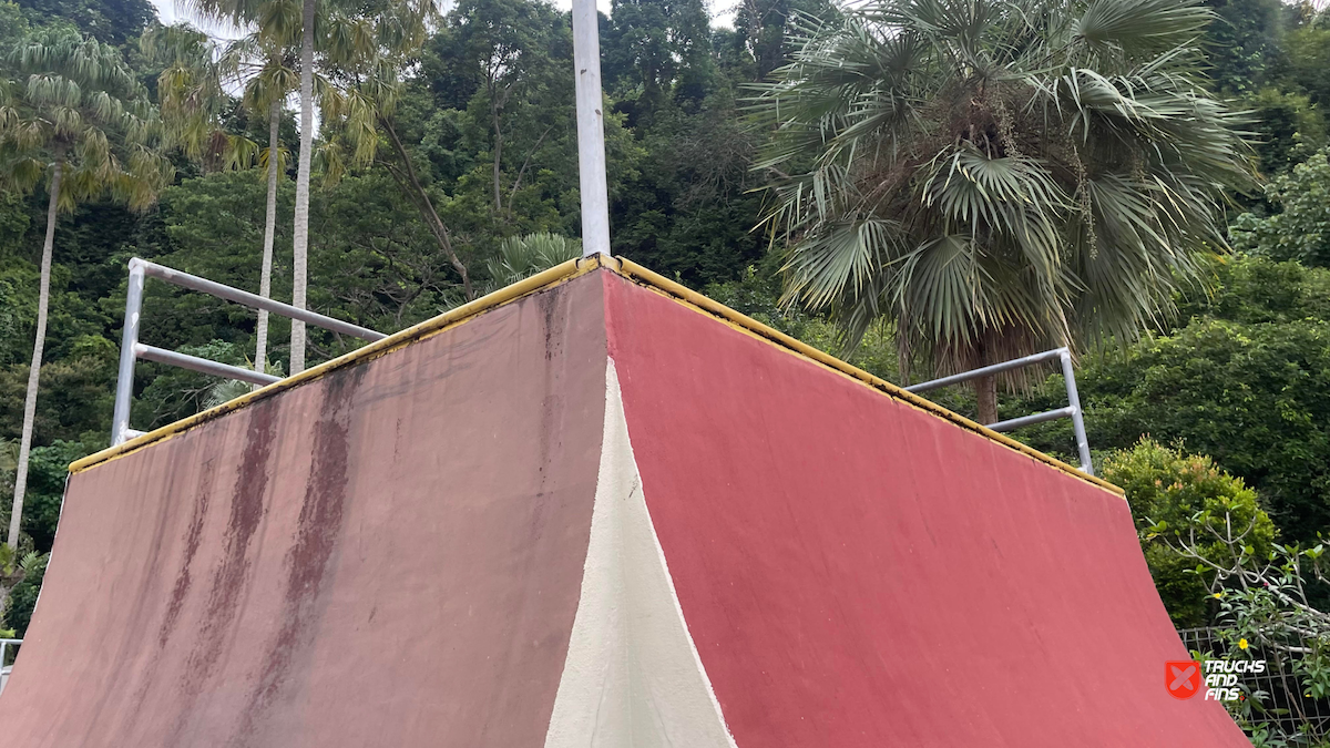 Penang Skatepark is made up of a nice variety of ramps and obstacles. This one is odd. Tons of big ramps and a vert half pipe but copings are so big and flow is odd so can’t do much. Locals brought in ramps and rails to make it better, but not much they can do. Big space though and locals are happy to have something and lights until 10:30.