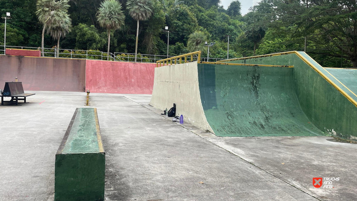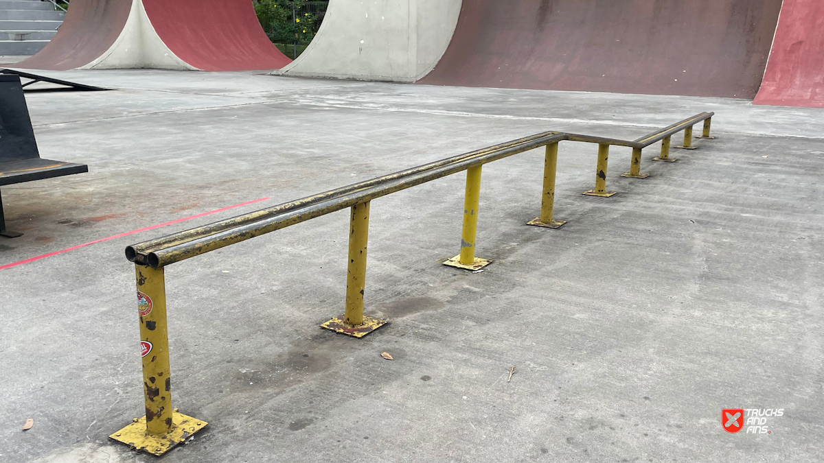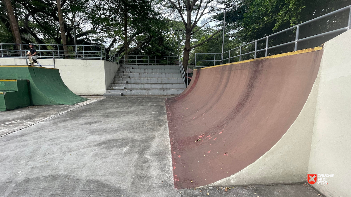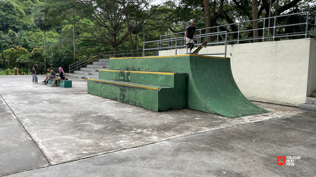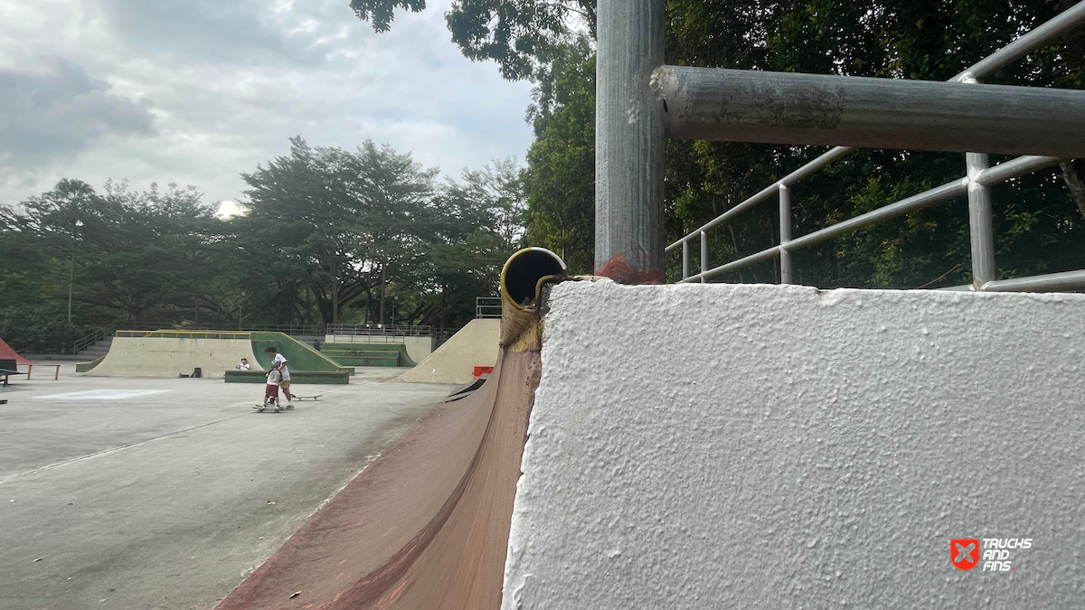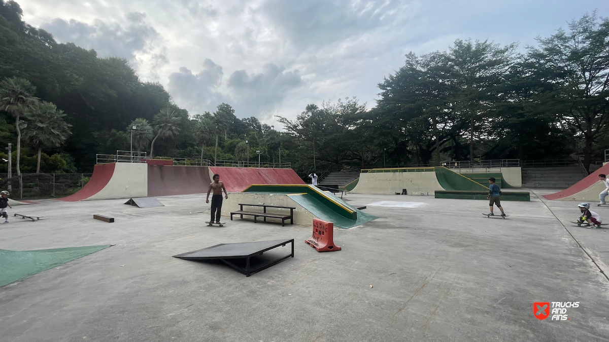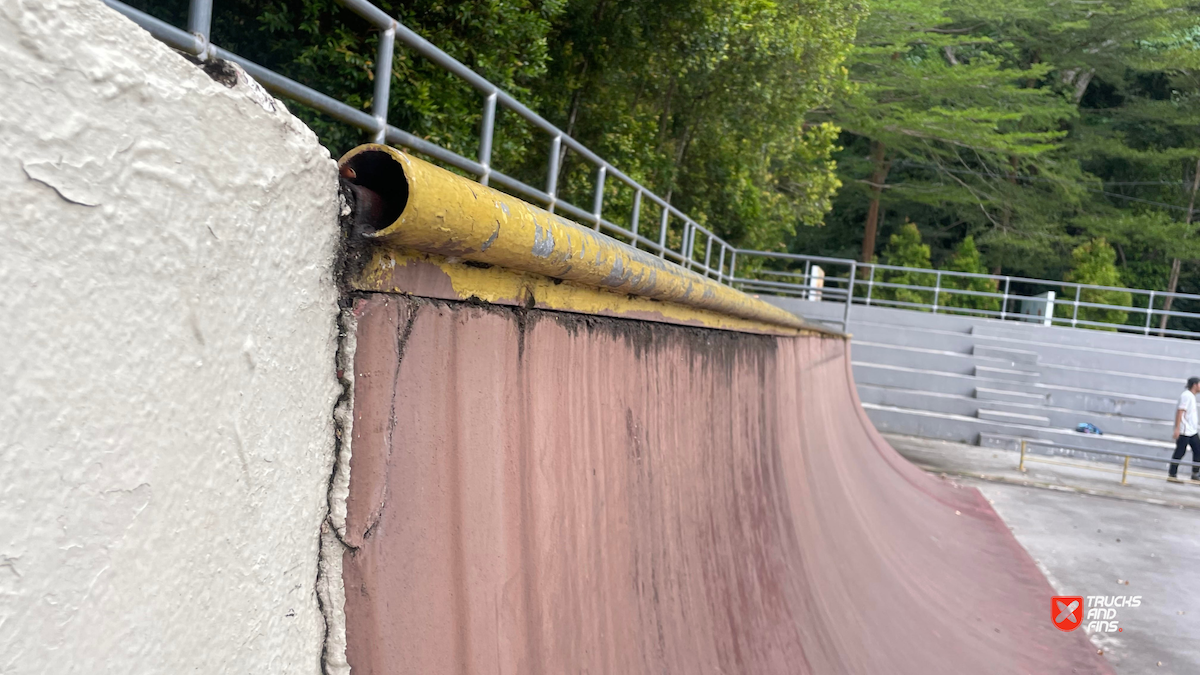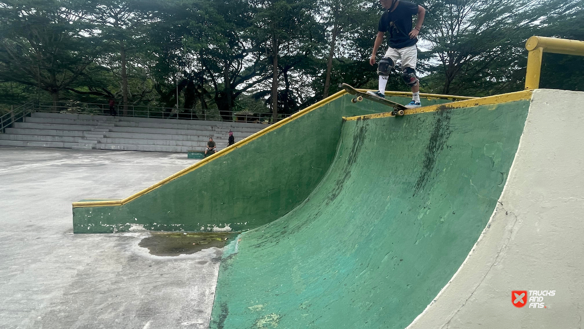 Penang Skatepark is made up of a nice variety of ramps and obstacles. This one is odd. Tons of big ramps and a vert half pipe but copings are so big and flow is odd so can’t do much. Locals brought in ramps and rails to make it better, but not much they can do. Big space though and locals are happy to have something and lights until 10:30.