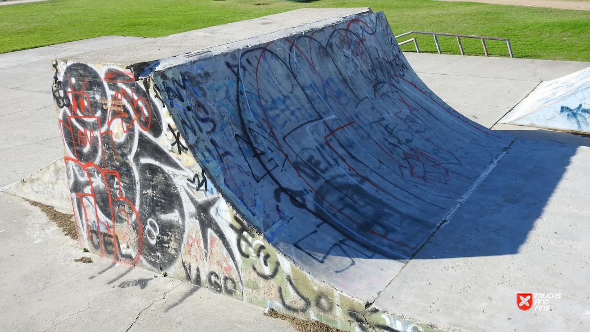 Great location, terrible park. Rough ground, mostly really bad construction with bad angles and lots of cracks. 2 quarters, spine and flat bar useable if you're desperate...