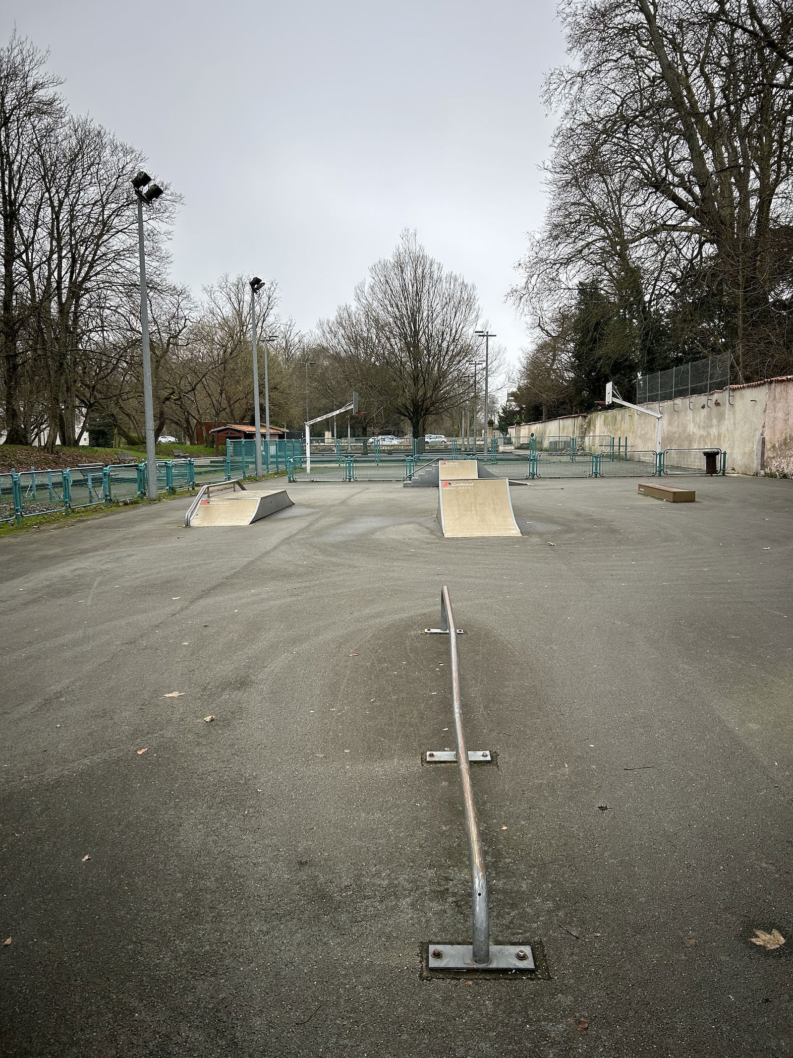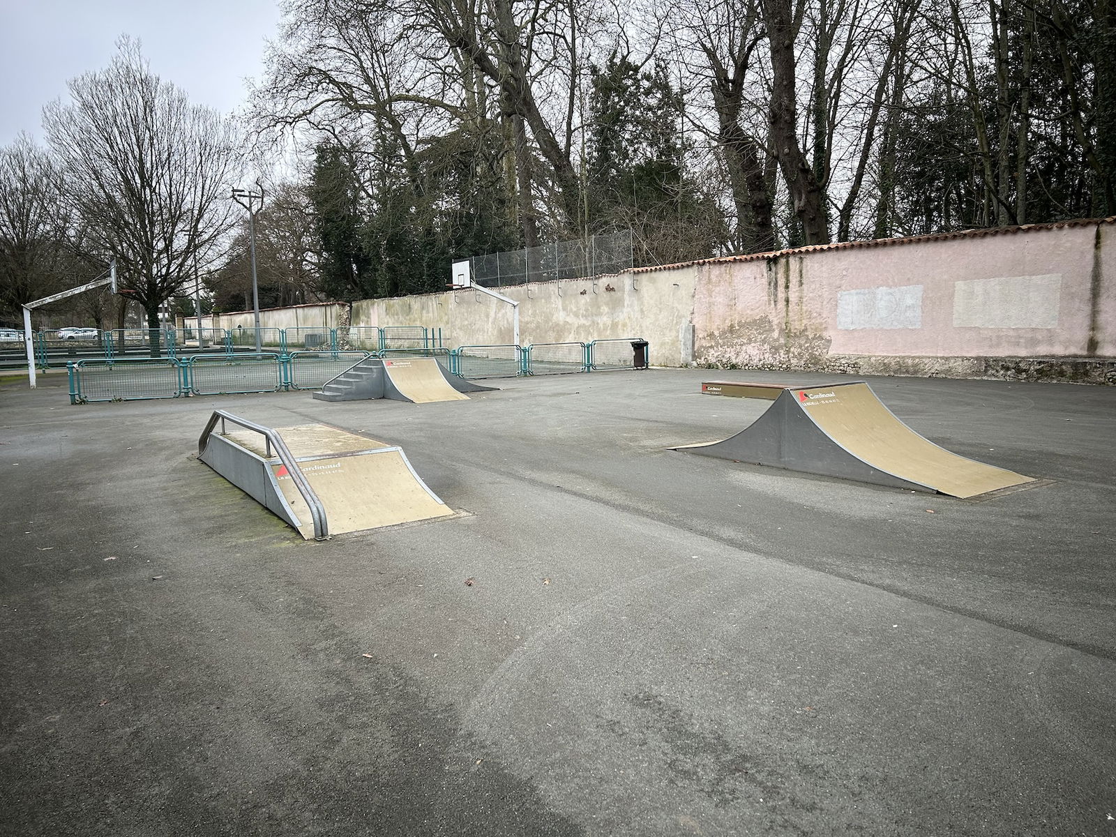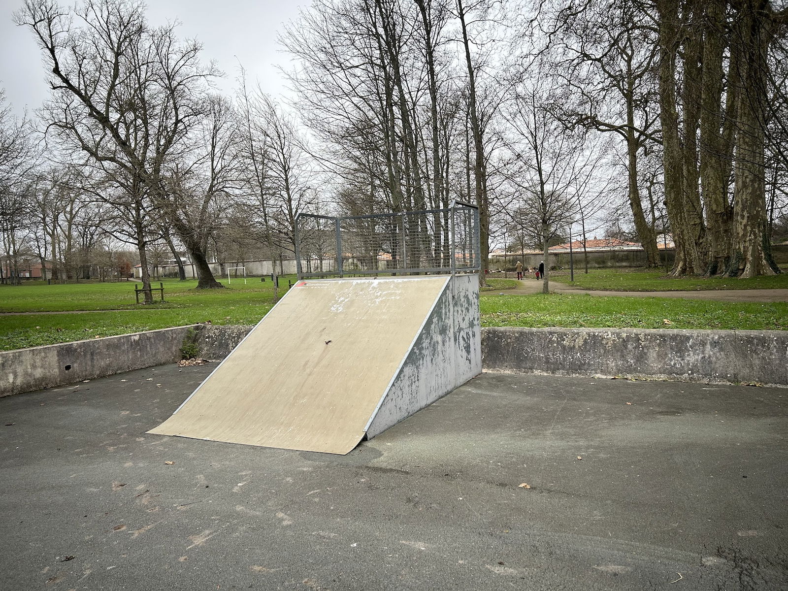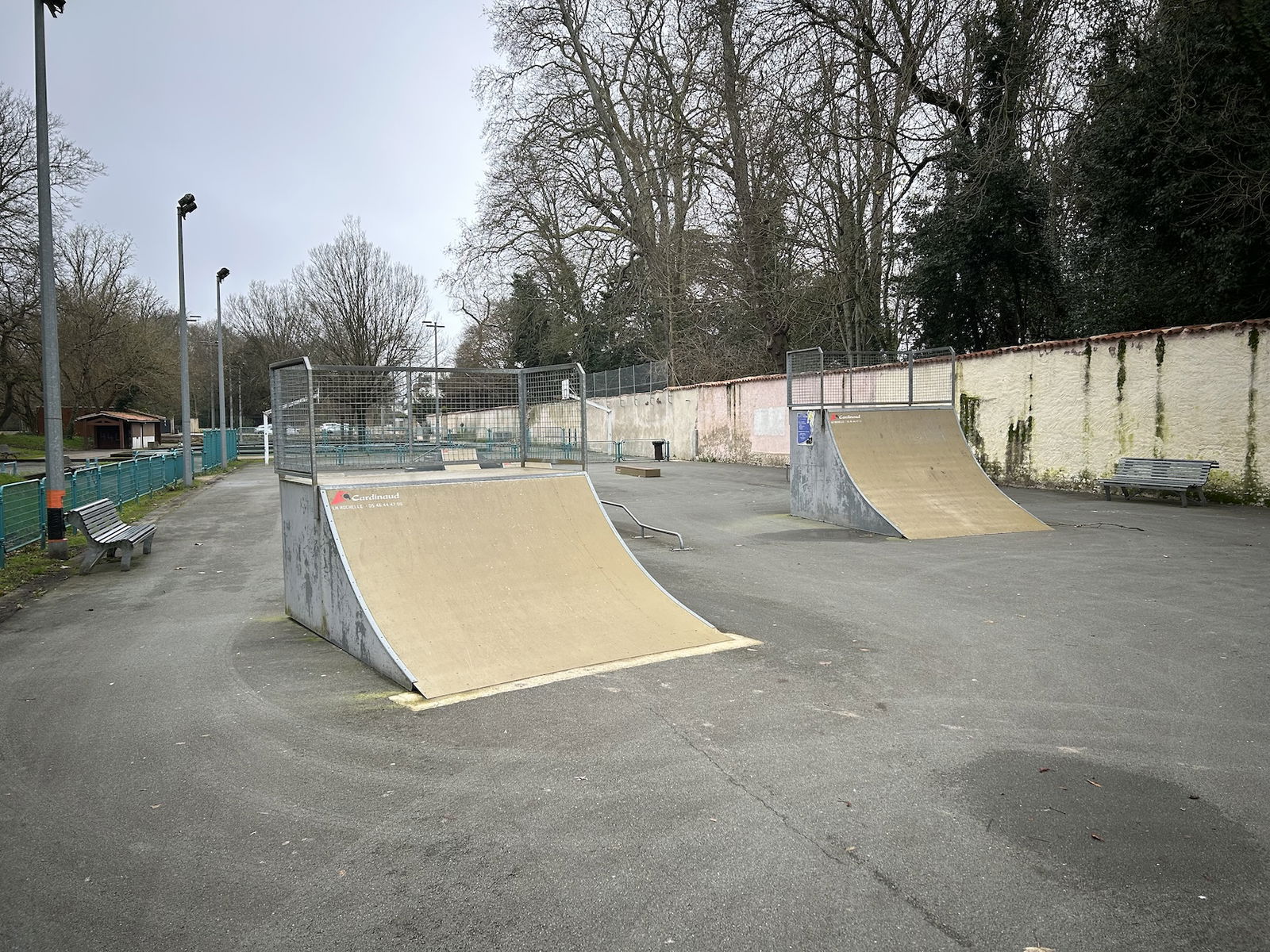 Perigny skatepark is made up of a back and forth run with a quarter pipe and bank on the sides of a funbox. The skatepark also features several street obstacles.