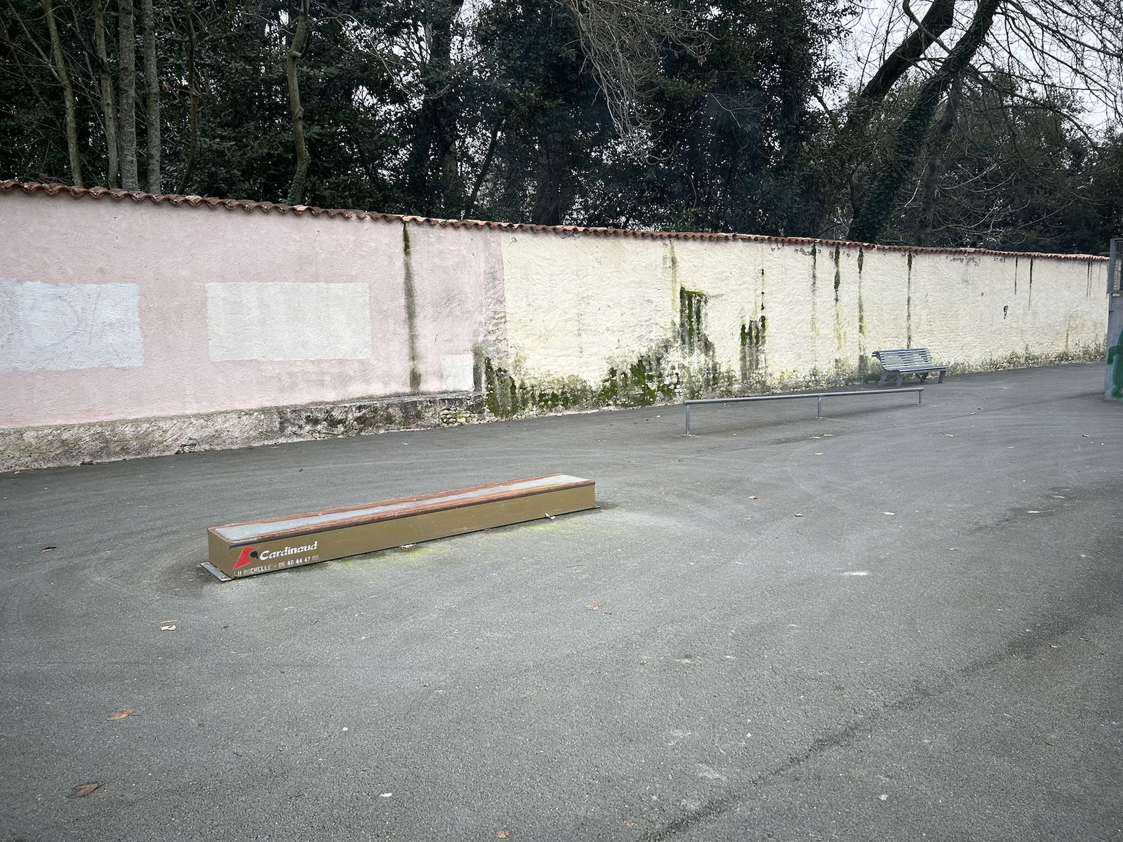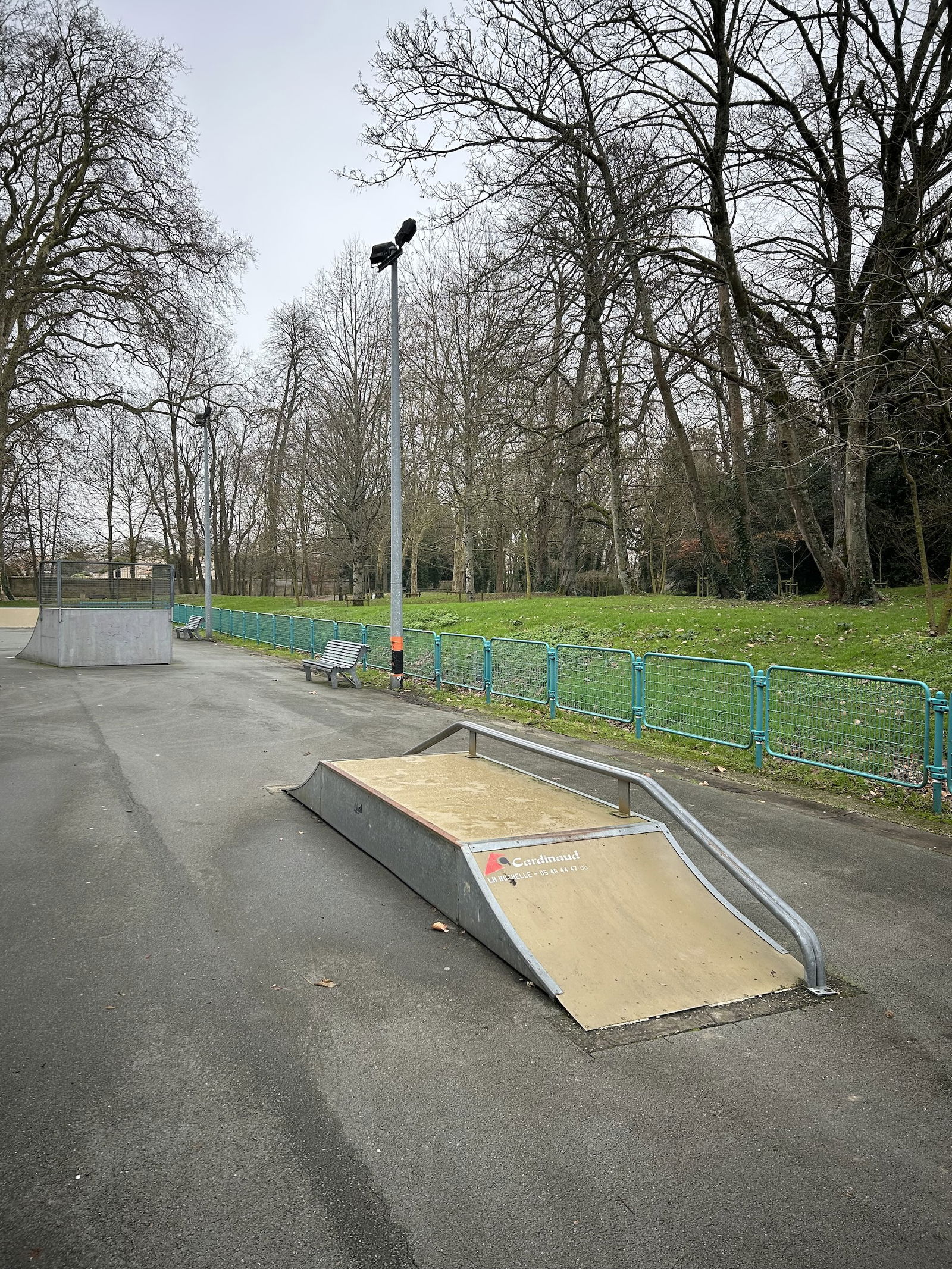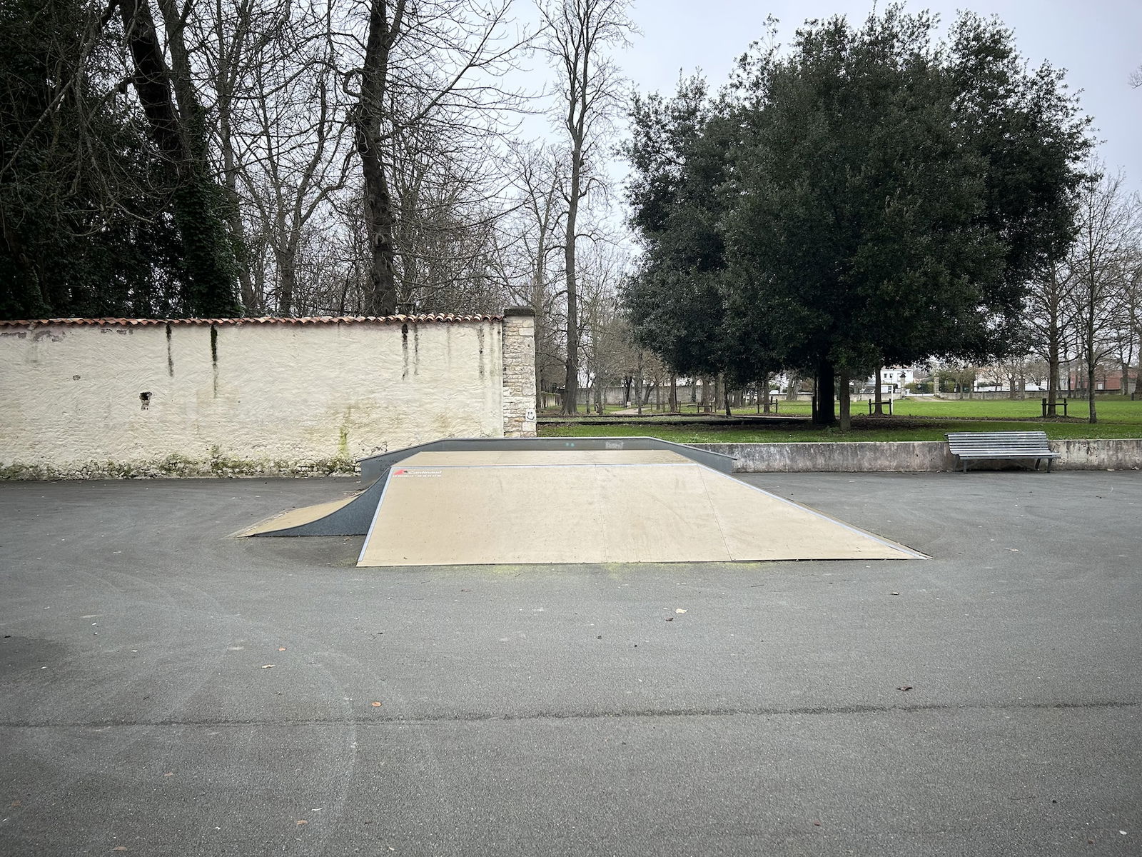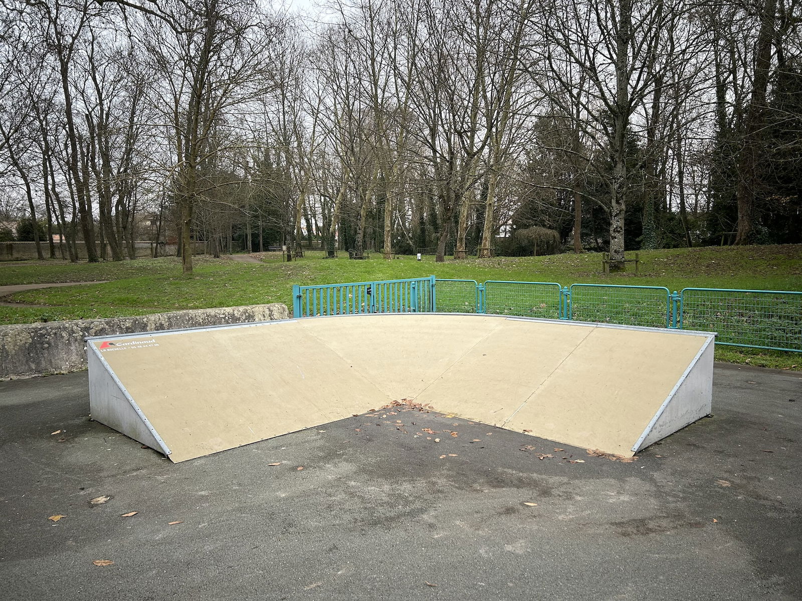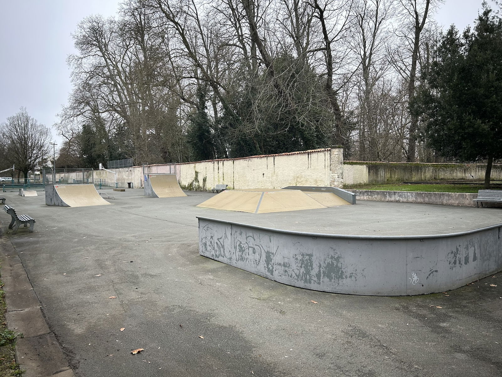 Perigny skatepark is made up of a back and forth run with a quarter pipe and bank on the sides of a funbox. The skatepark also features several street obstacles.
