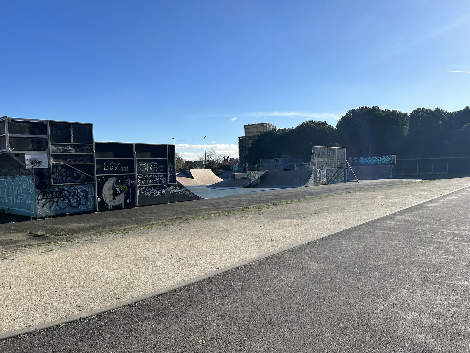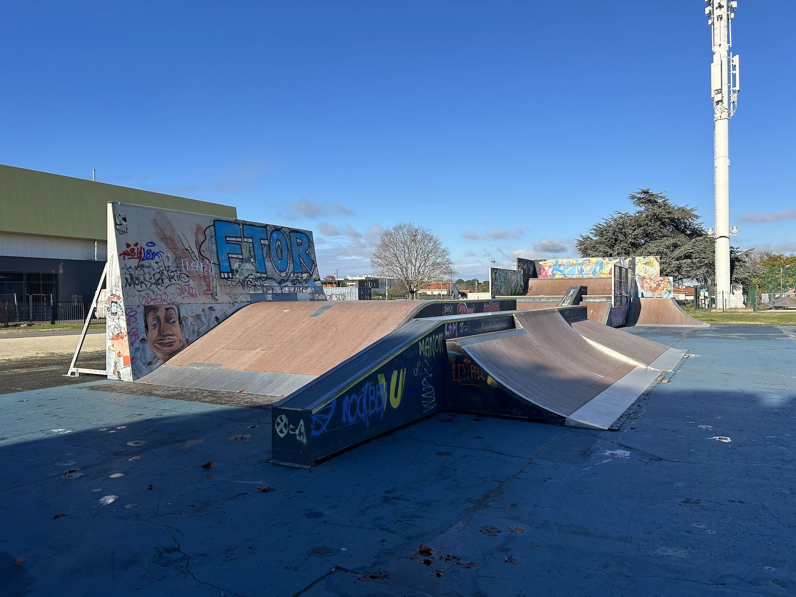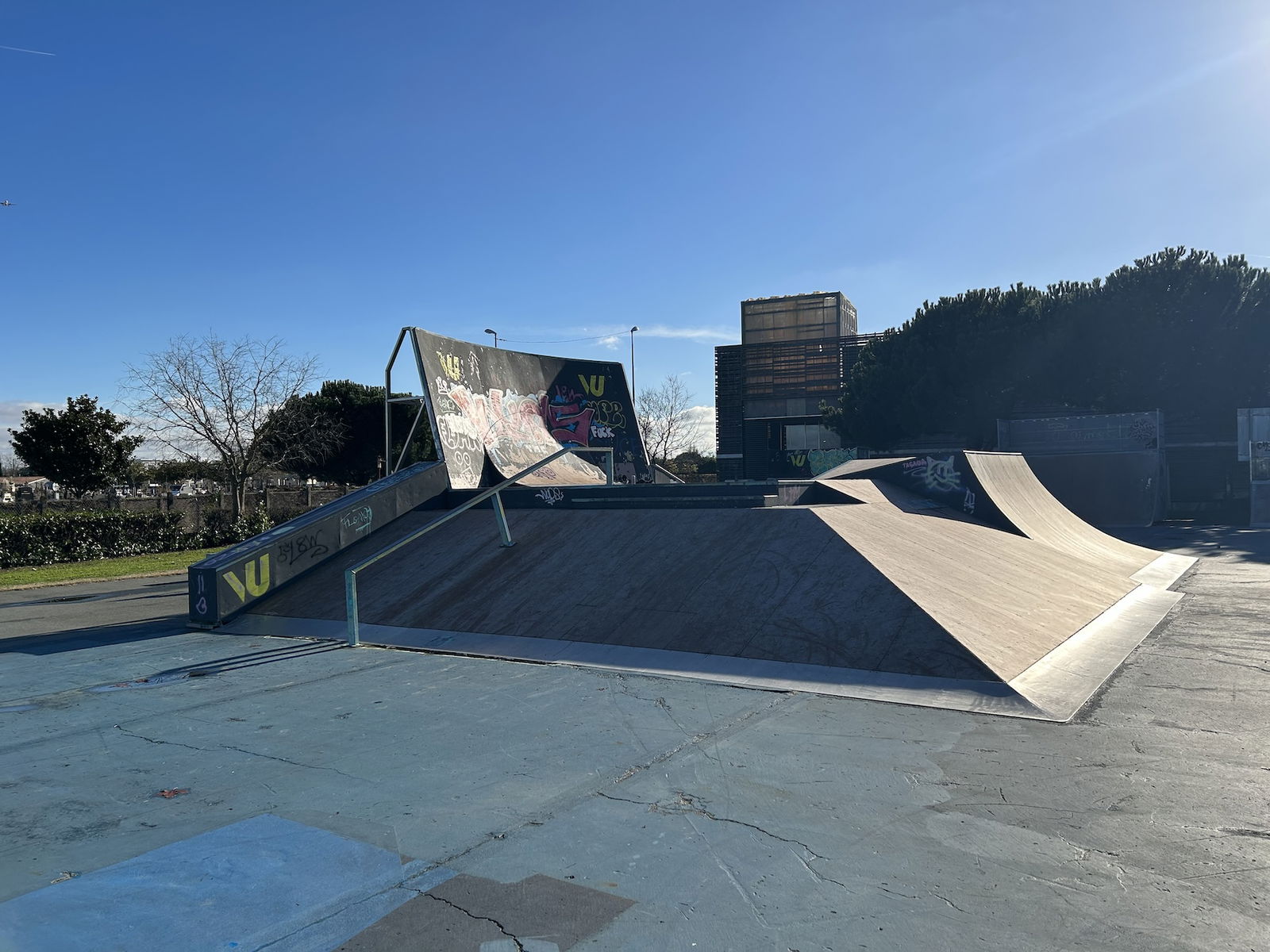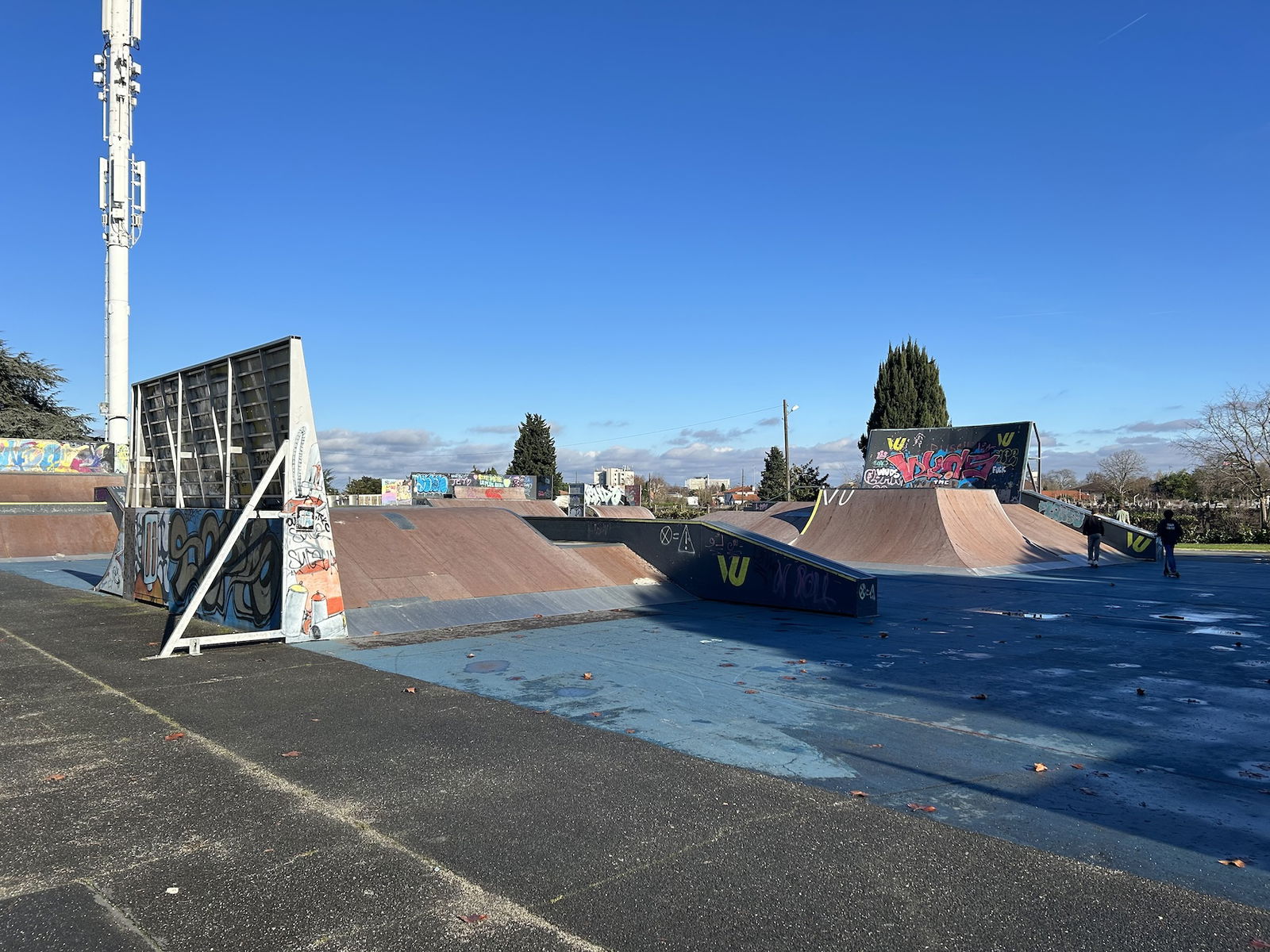 Pessac skatepark is made up of several back and forth runs with quarter pipes and banks on the sides of funboxes and other obstacles.