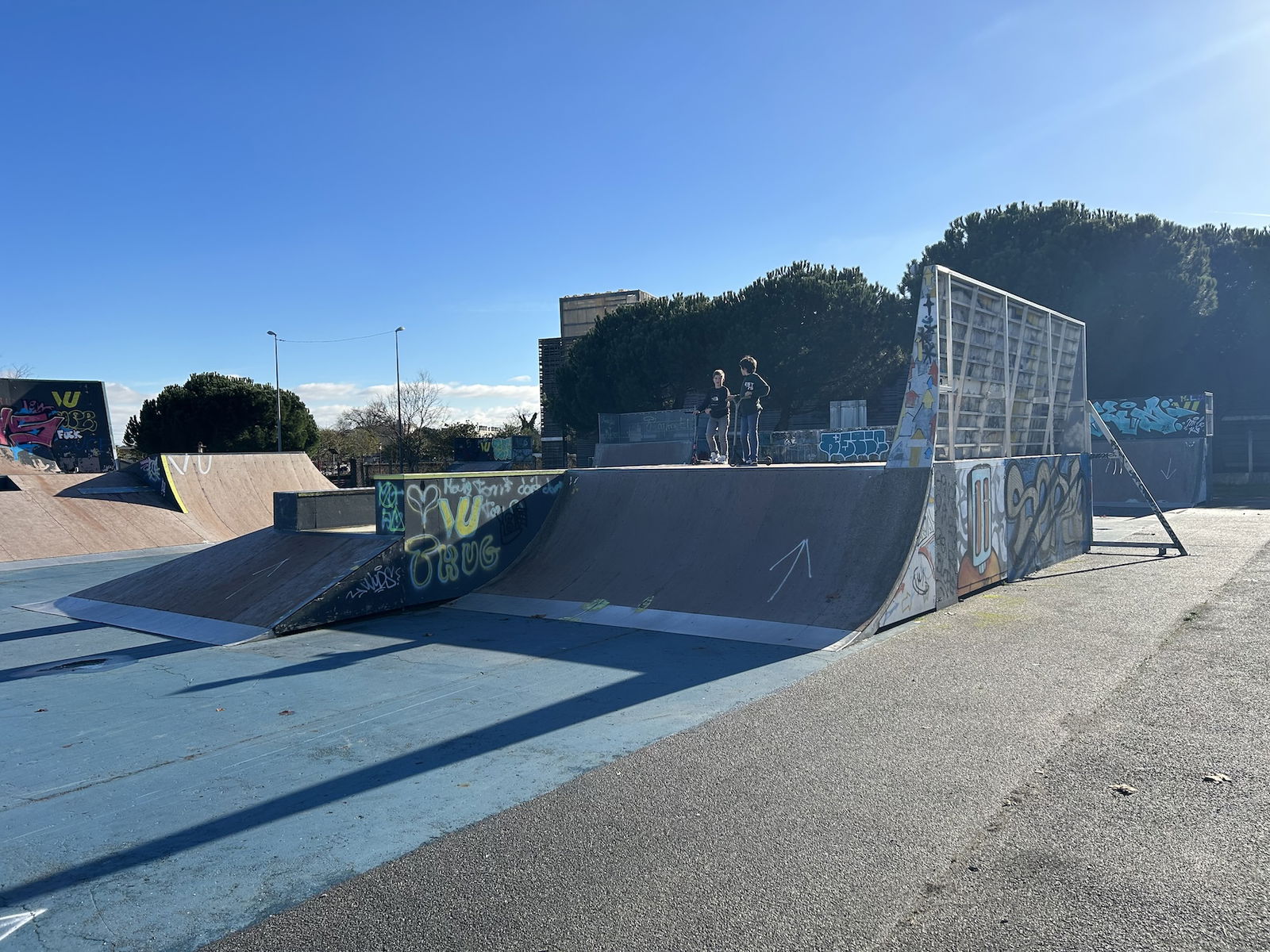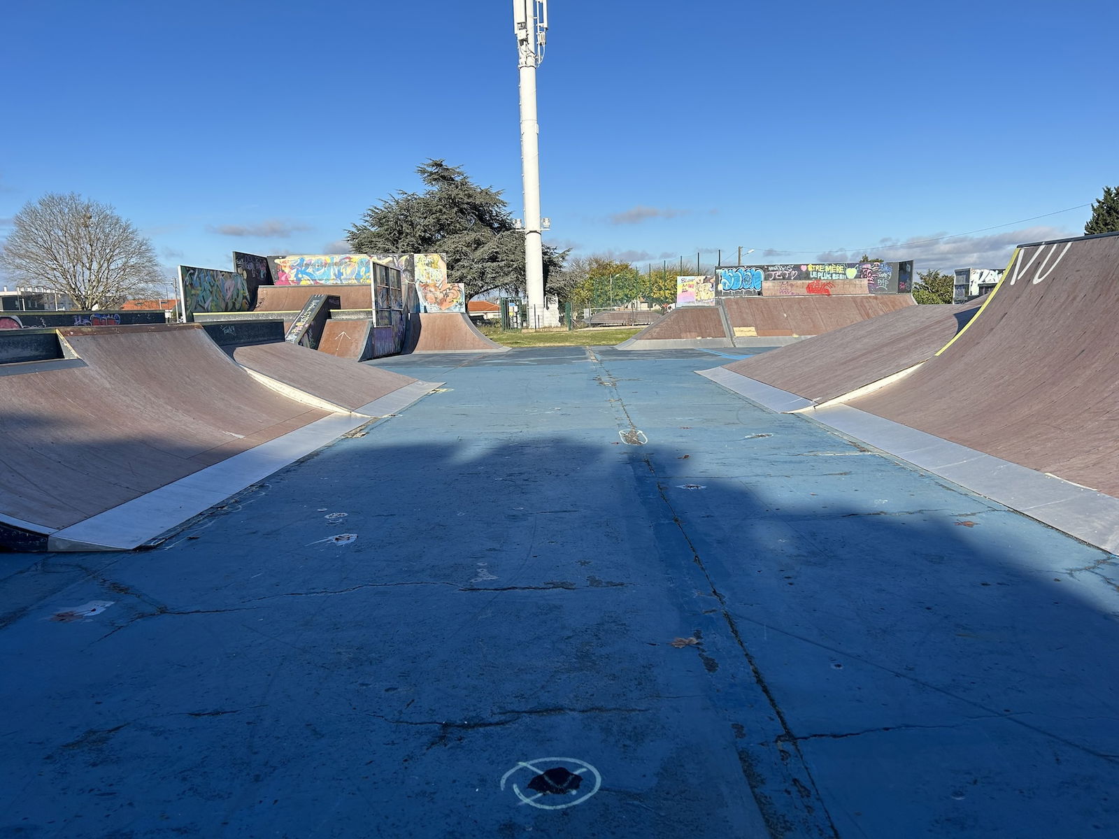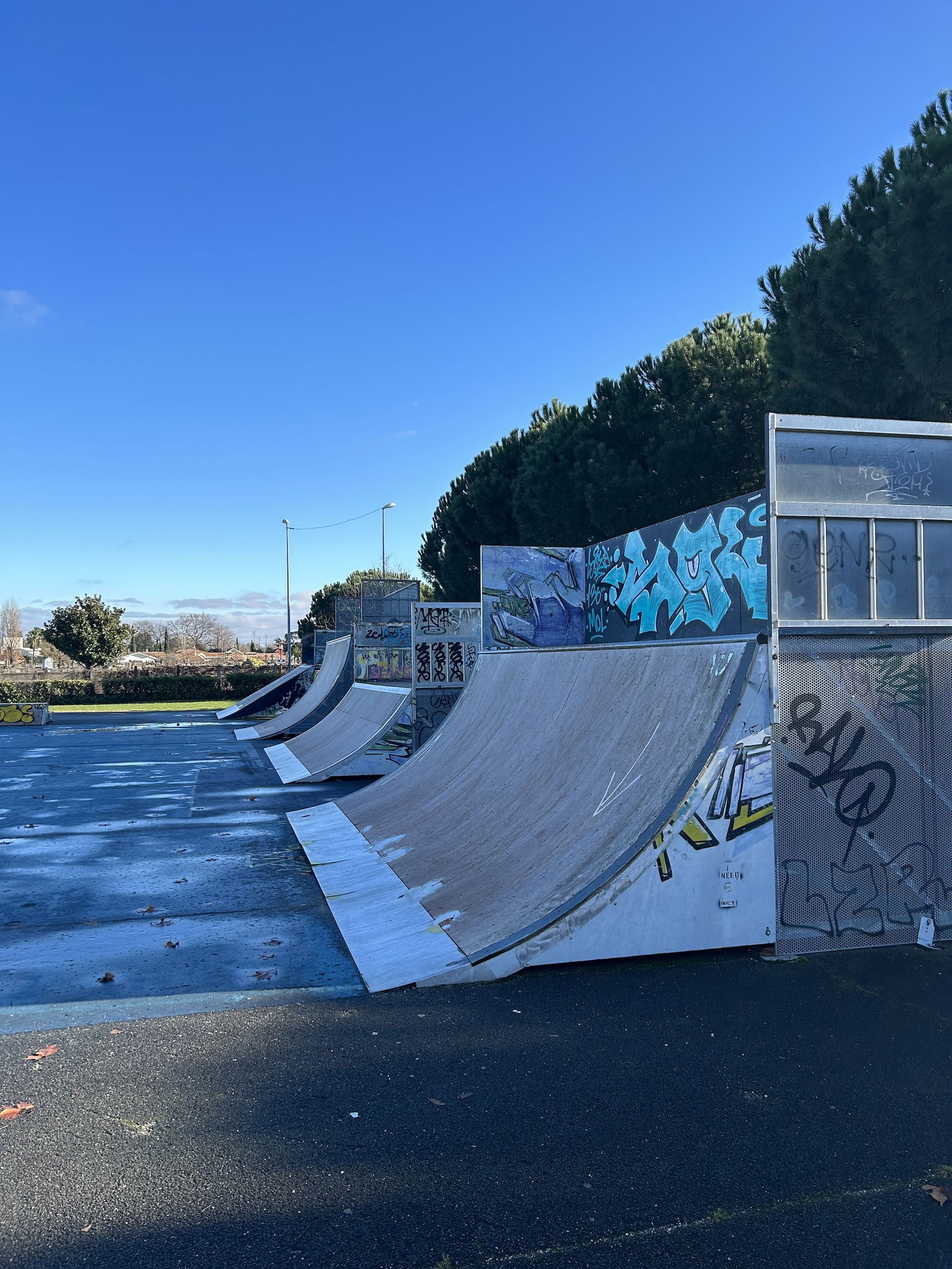 Pessac skatepark is made up of several back and forth runs with quarter pipes and banks on the sides of funboxes and other obstacles.