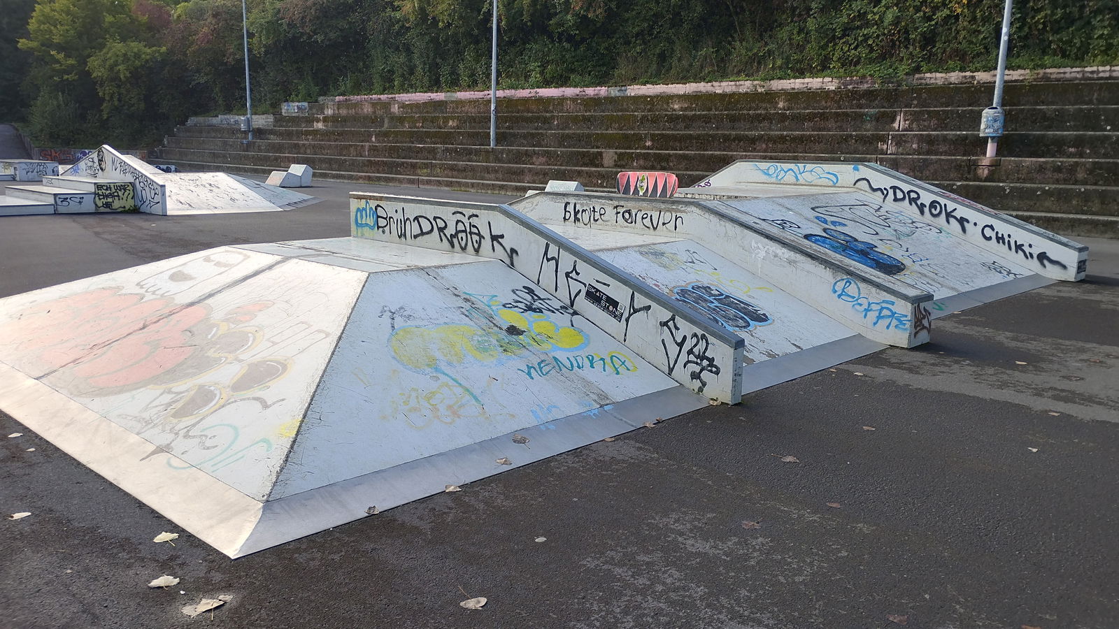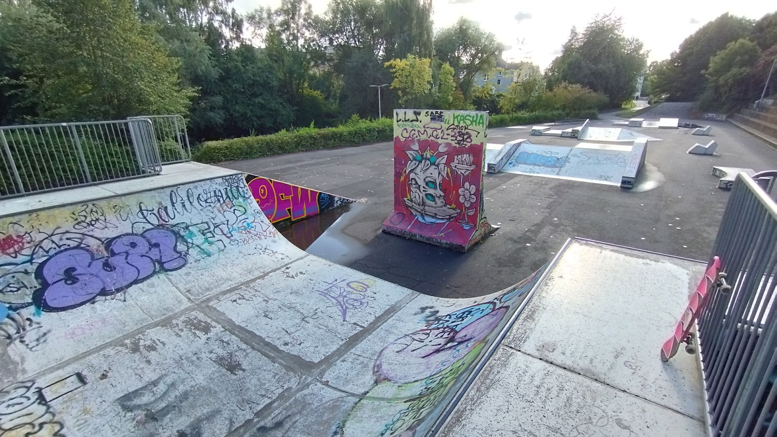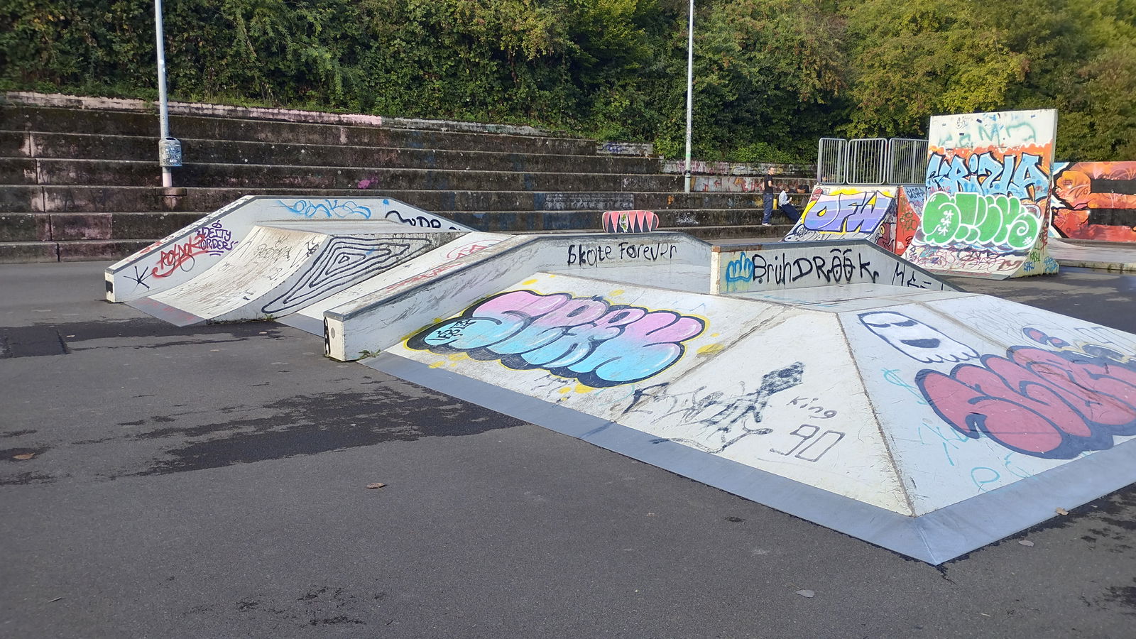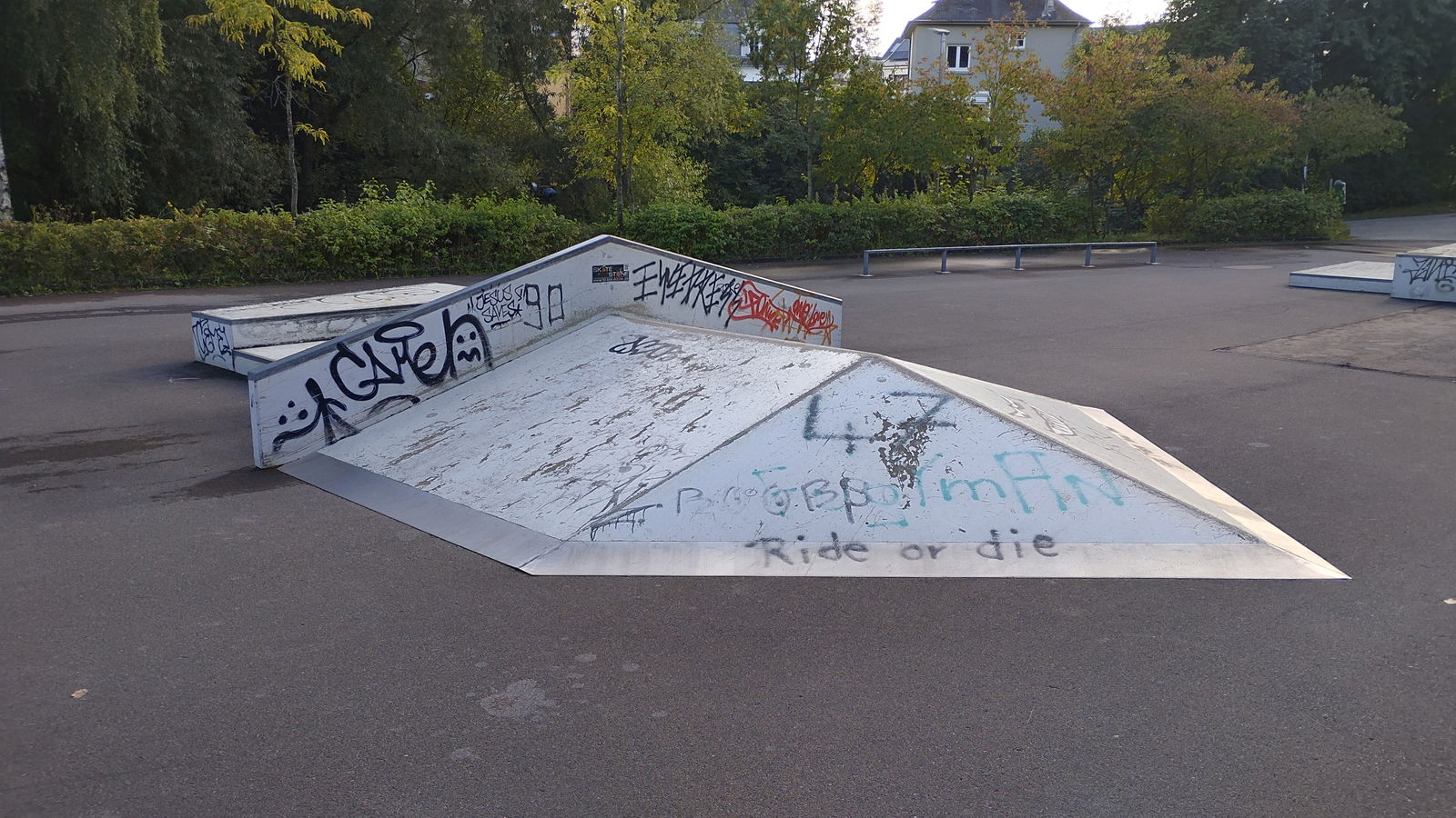 Pétange skatepark features several banks, quarters, funboxes and a miniramp.