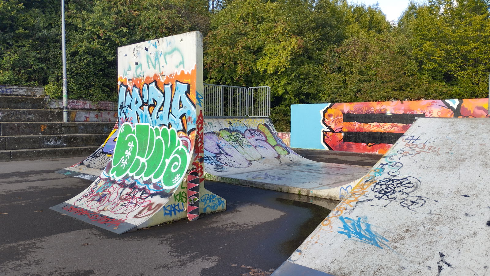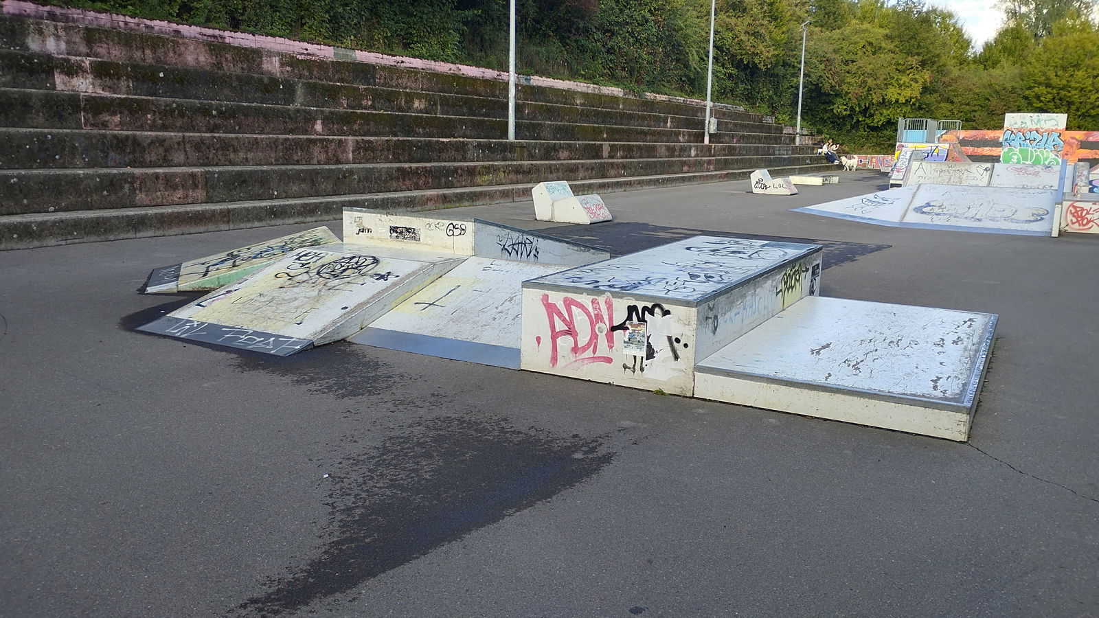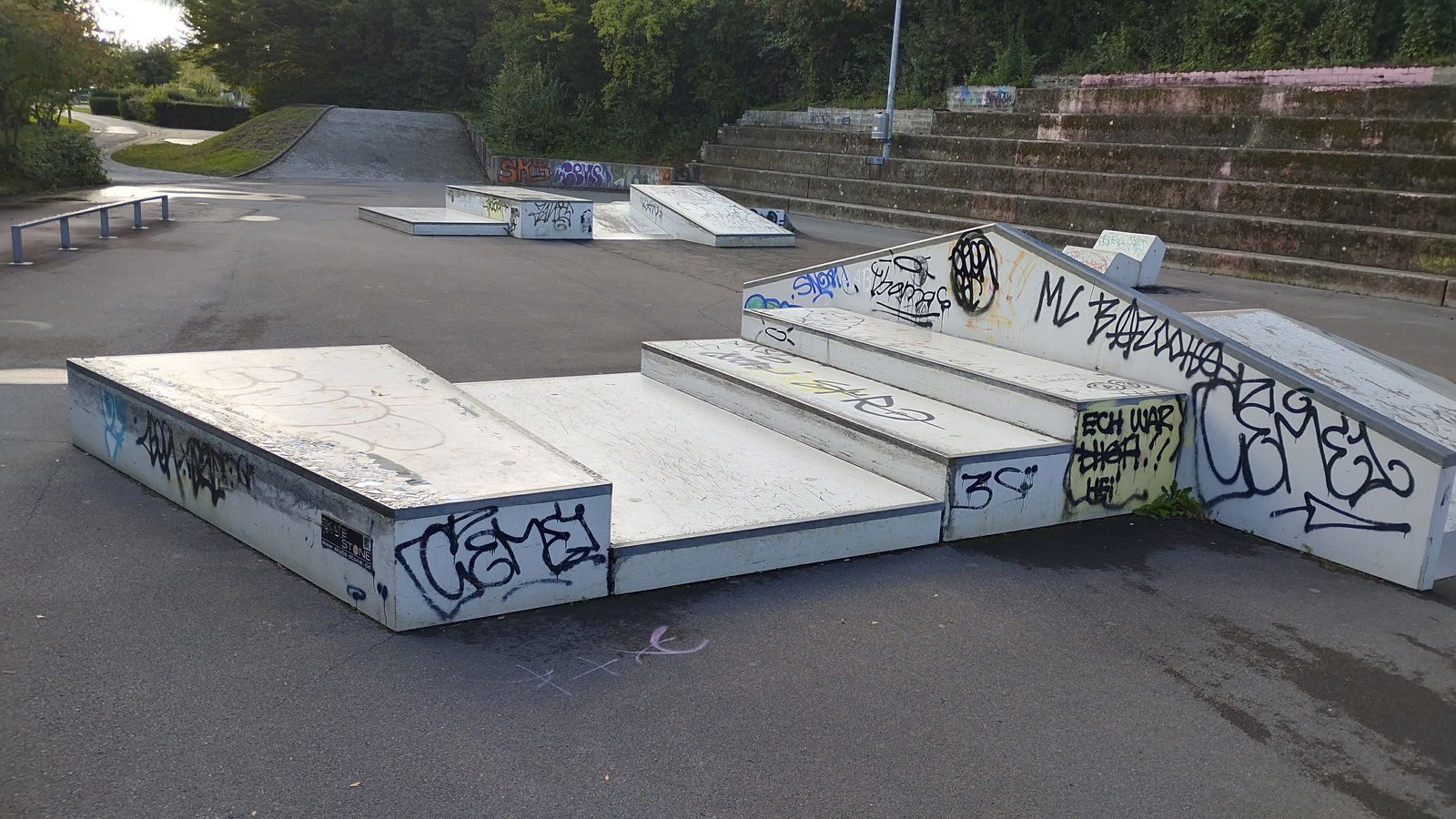 Pétange skatepark features several banks, quarters, funboxes and a miniramp.
