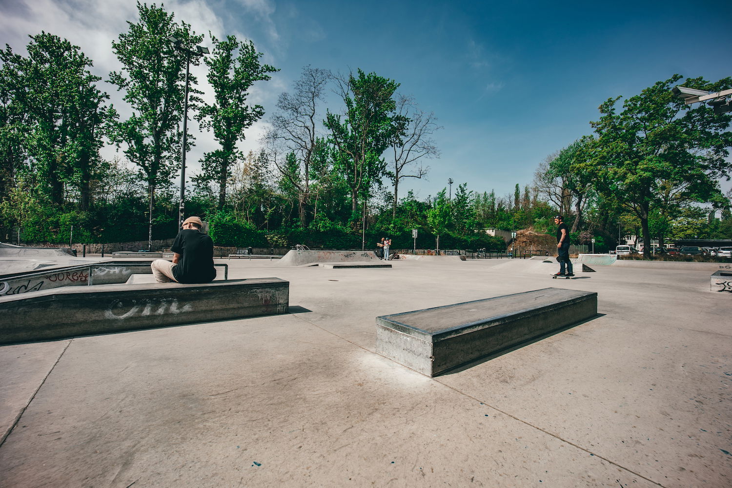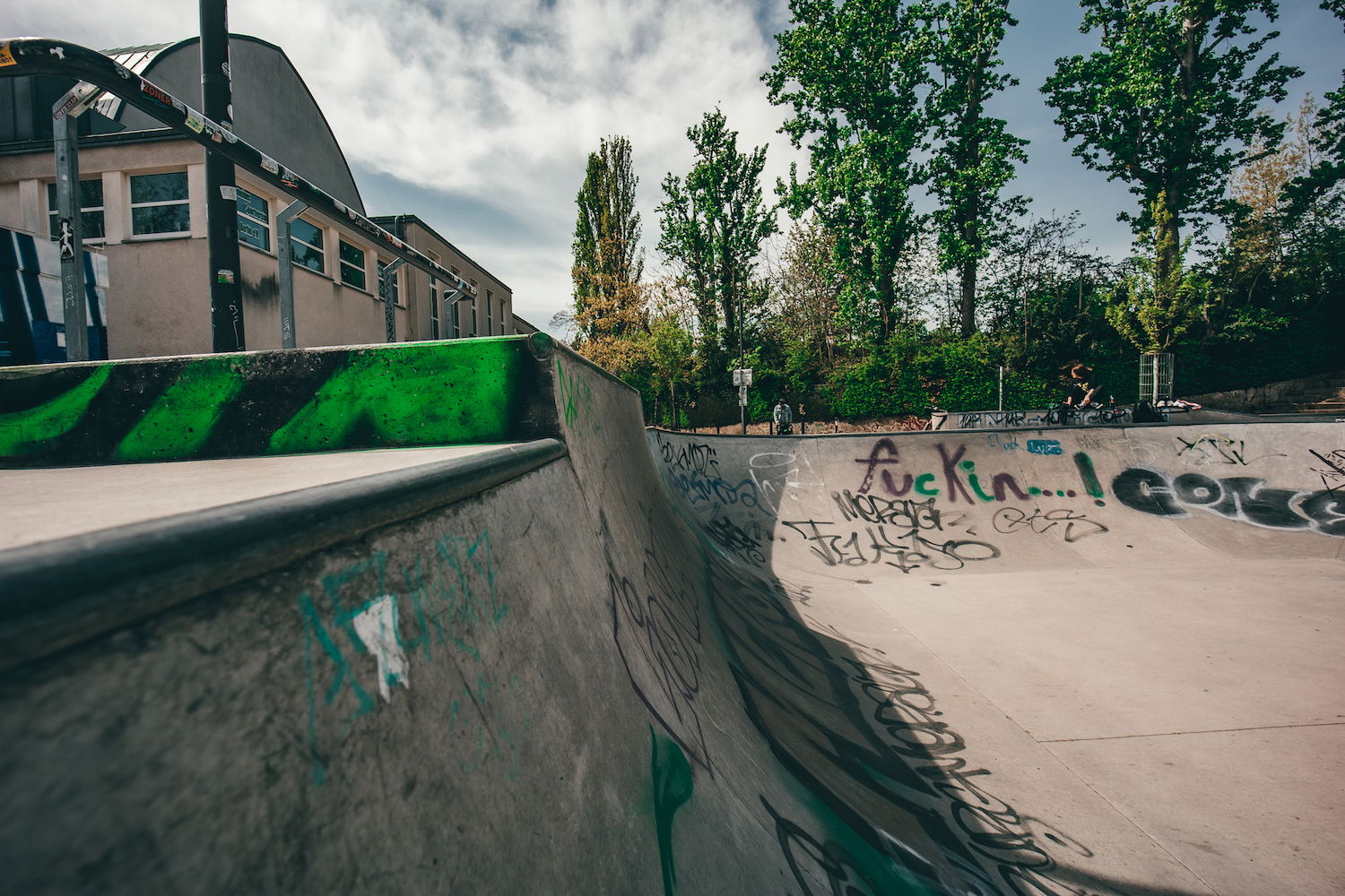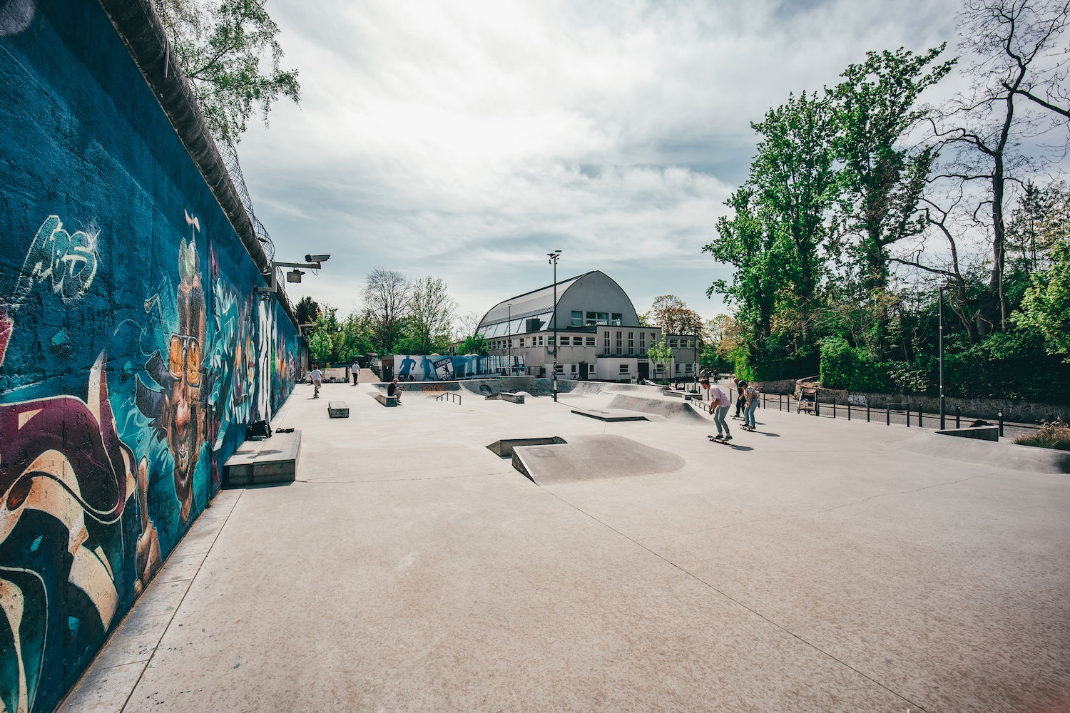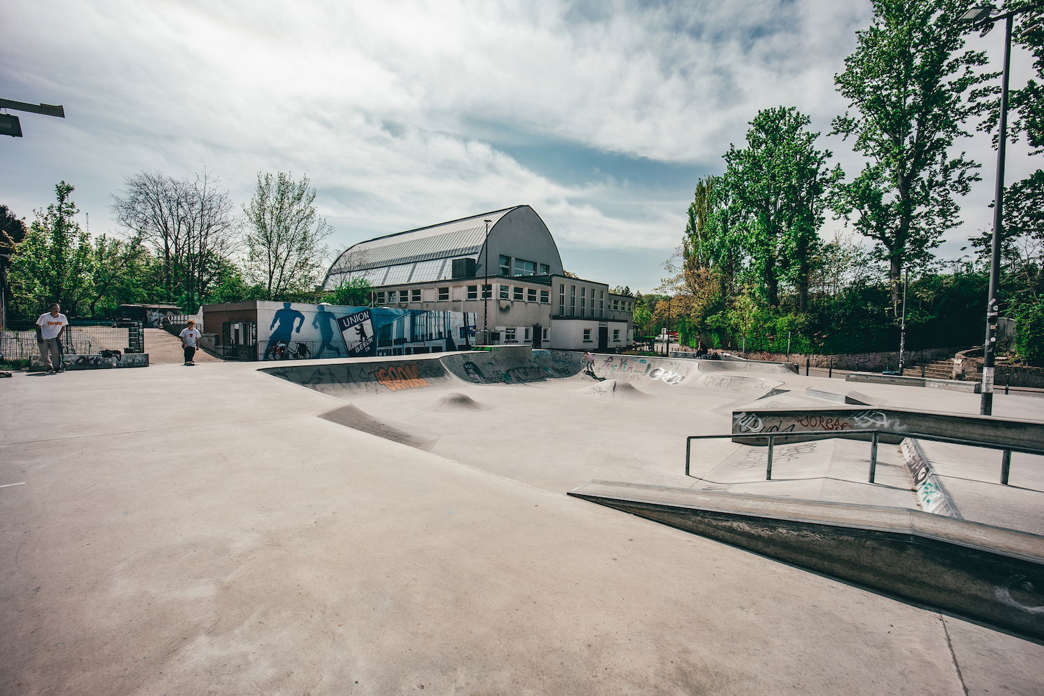 Poststadion Skatepark is a street-oriented concrete park with an open bowl on one end.