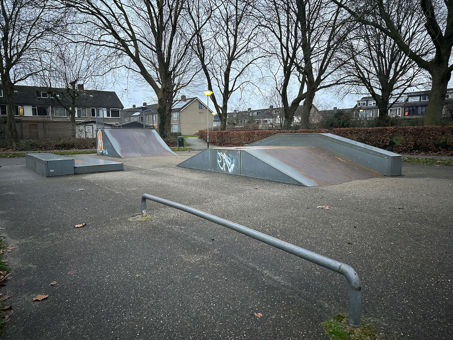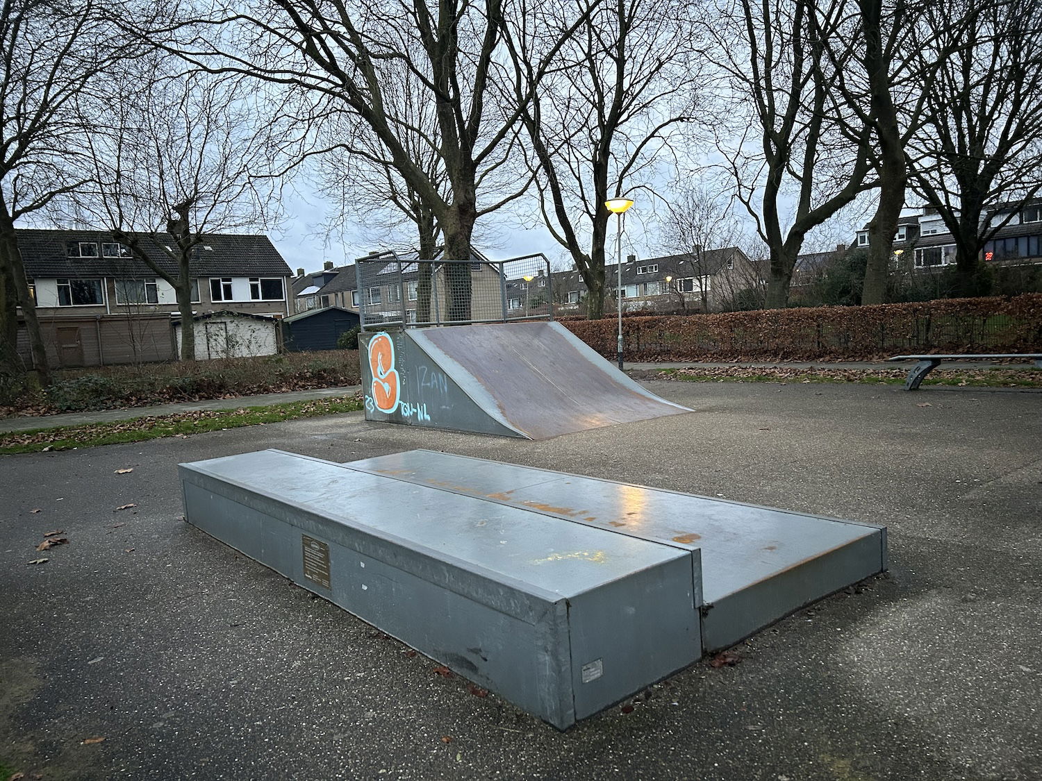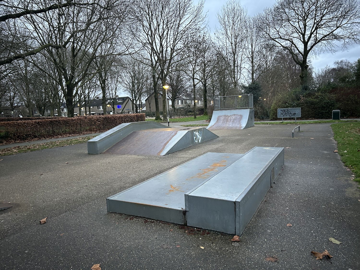 Princenhage skatepark is made up of a back and forth run with a quarter pipe and bank on the sides of a funbox.