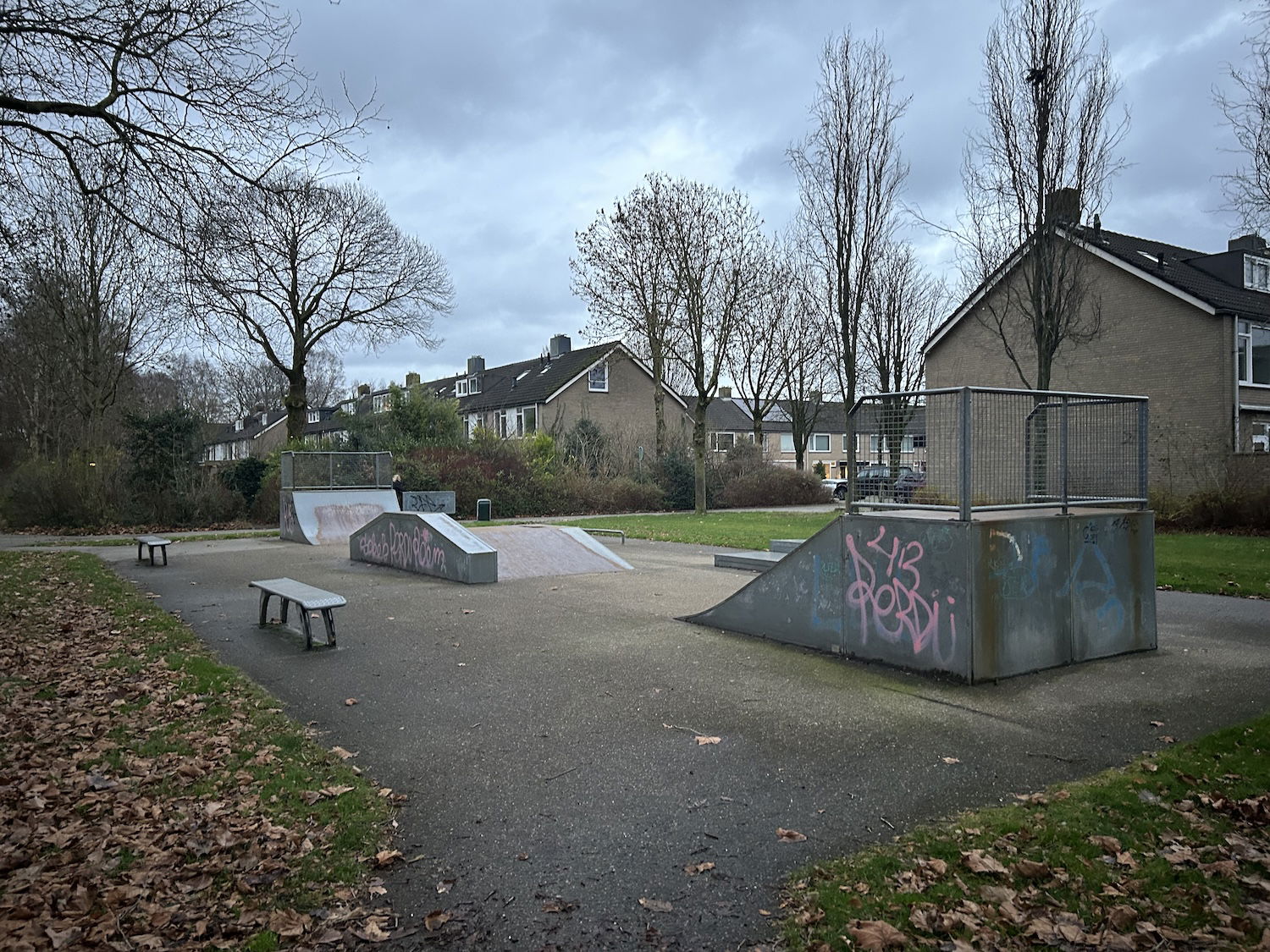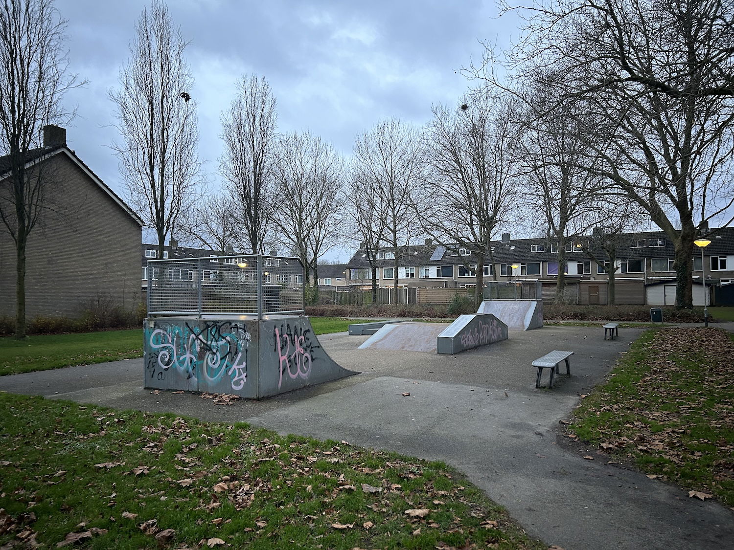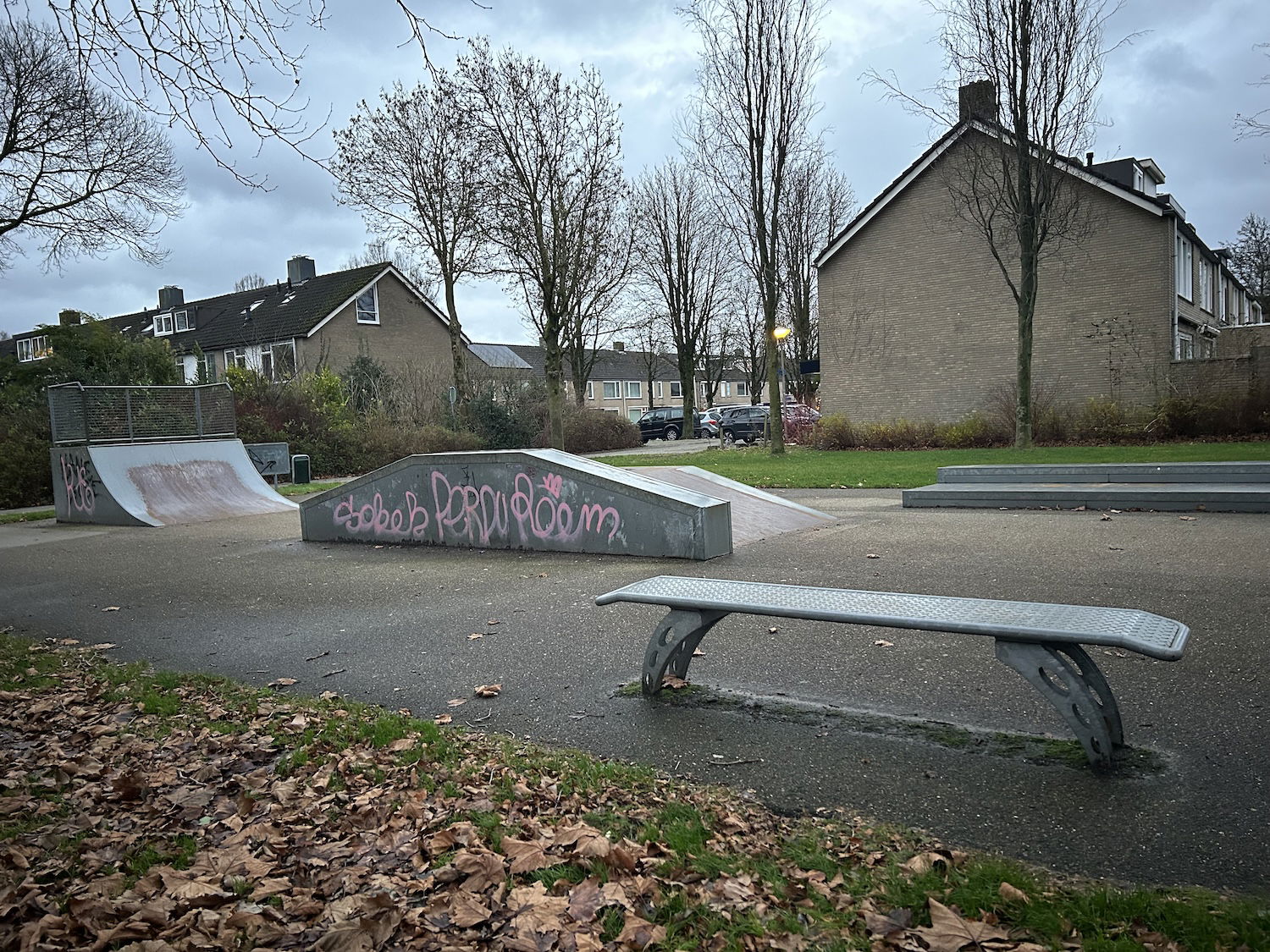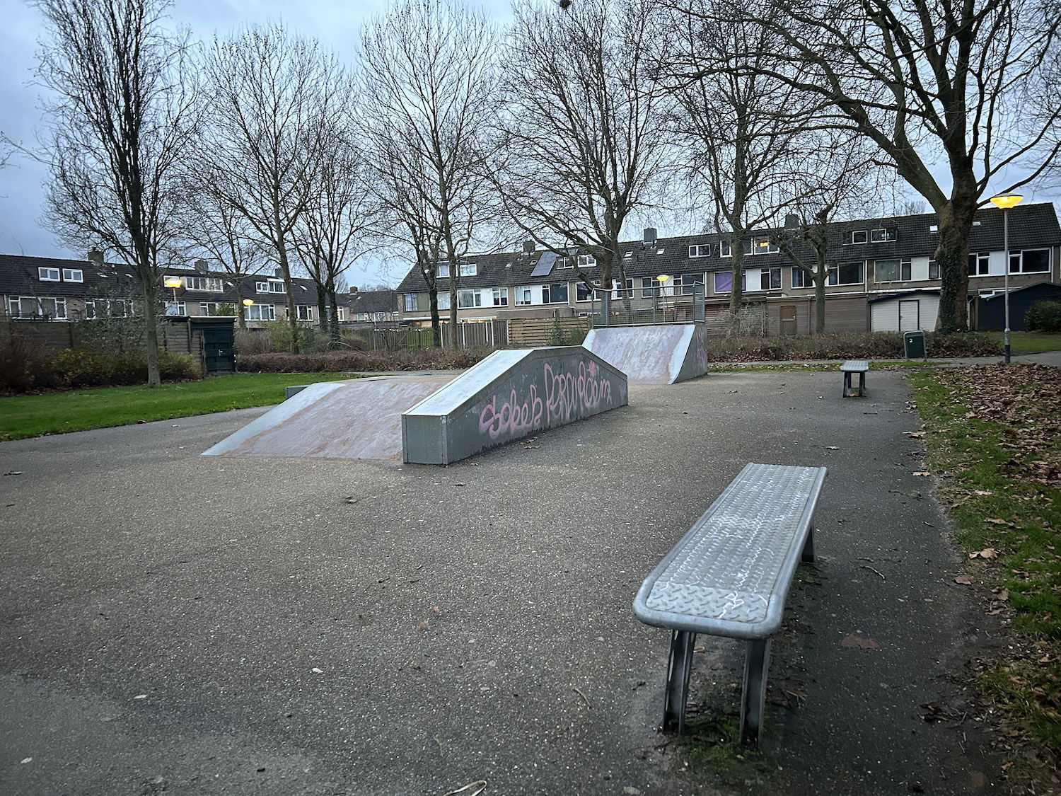 Princenhage skatepark is made up of a back and forth run with a quarter pipe and bank on the sides of a funbox.