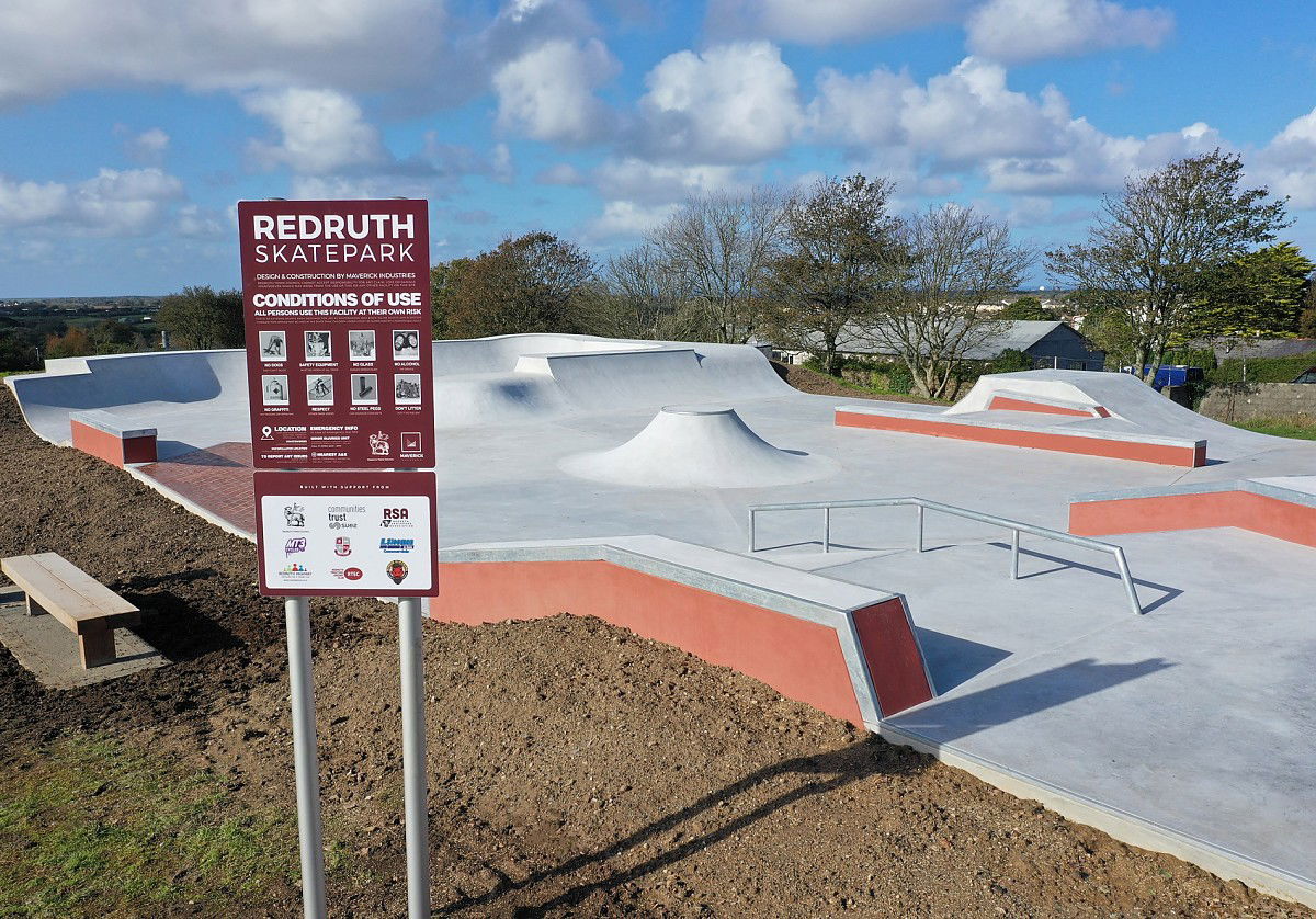 Redruth Skatepark, located at East End Playing Fields in Redruth, Cornwall, was completed in October 2021 after a decade of campaigning, planning, and fundraising. The skatepark was designed and built by Maverick Skateparks, a company known for constructing high-quality concrete skateparks. The project aimed to create a modern and inclusive facility for skateboarders, BMX riders, and scooter users of all ages and abilities.