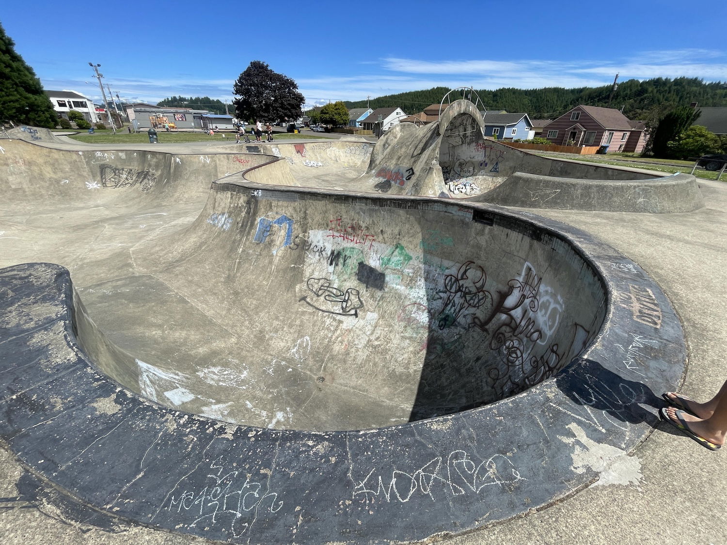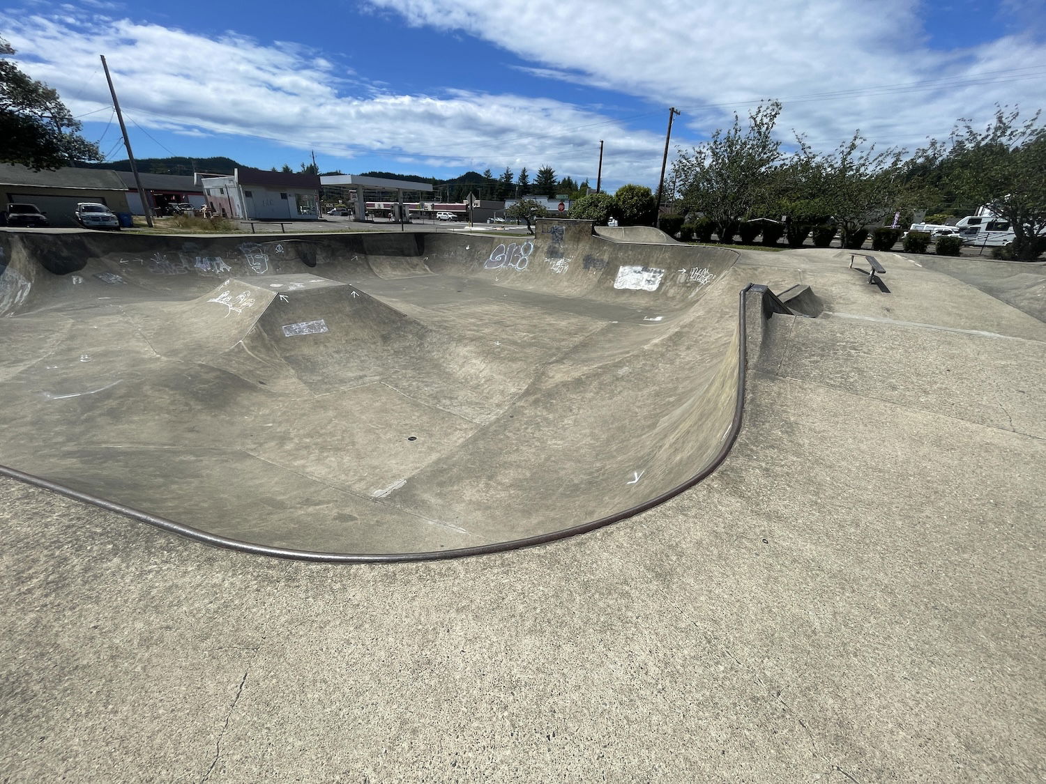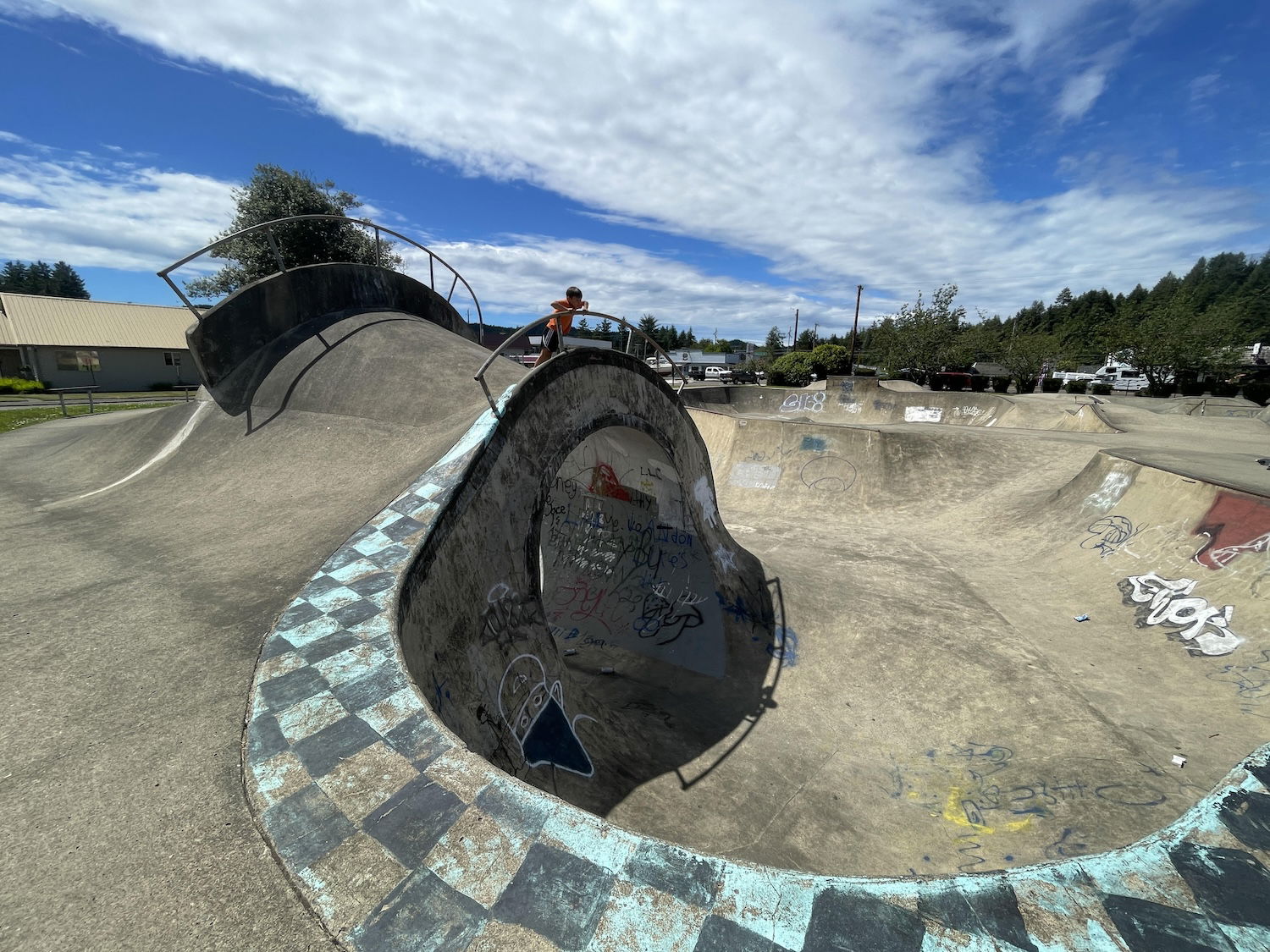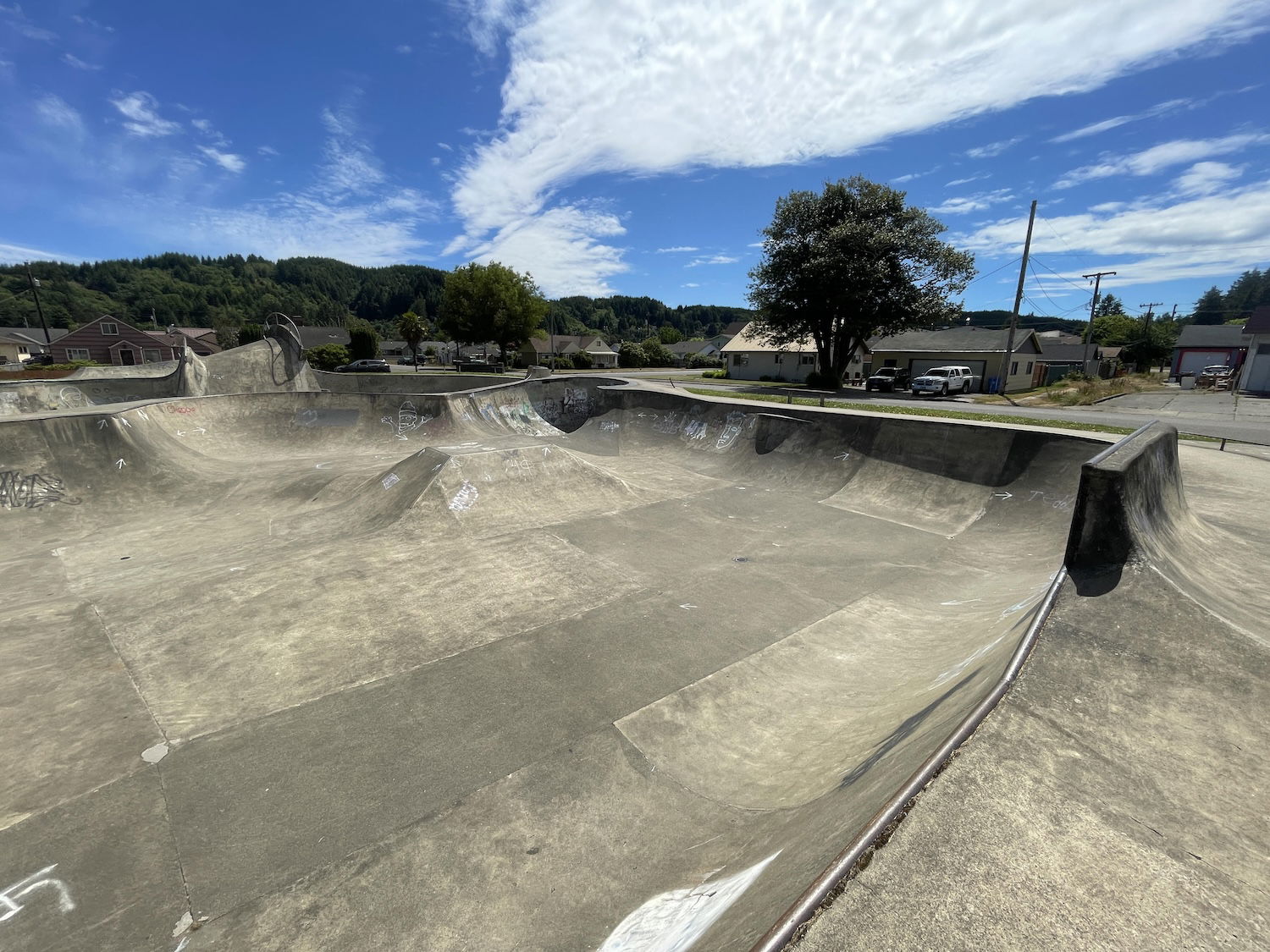 Reedsport skatepark is a concrete park featuring two large bowls. The full-pipe, funnel feature really puts this one on the map. Two flow, bowl areas with lots of fun stuff to hit on the sides. I am amazed at how advanced stuff was on this coast for the early 2000‘s. All these builders set the bar for how stuff should be done. The Skatepark Project helped fund this skatepark in 2002.