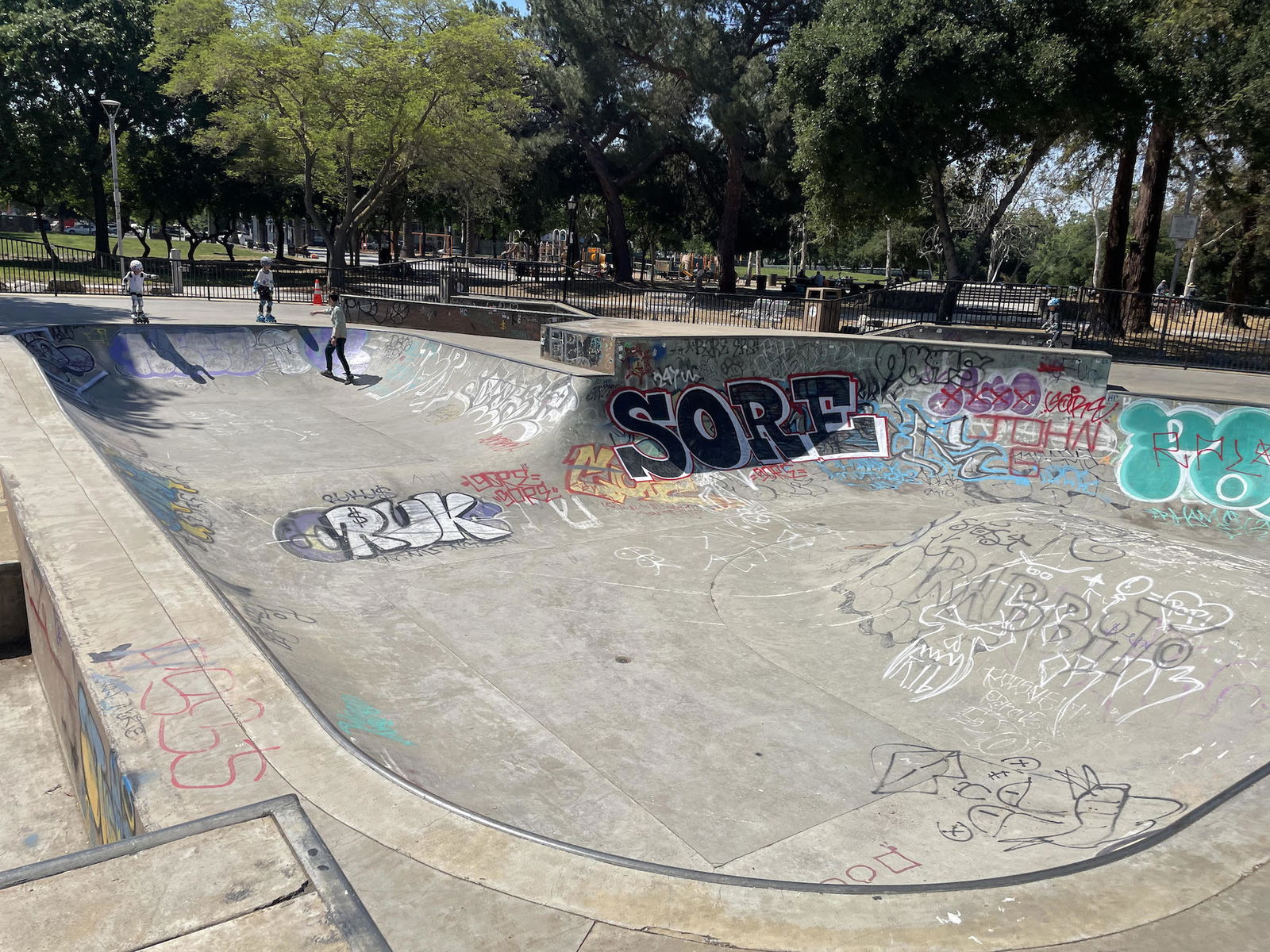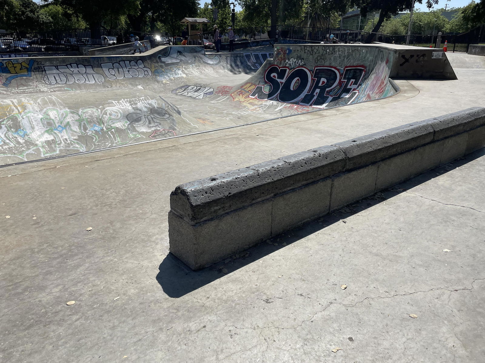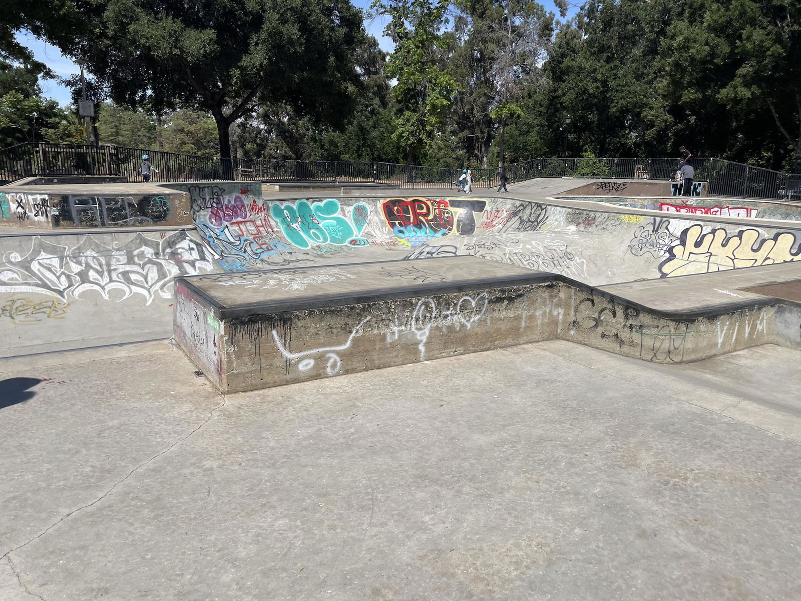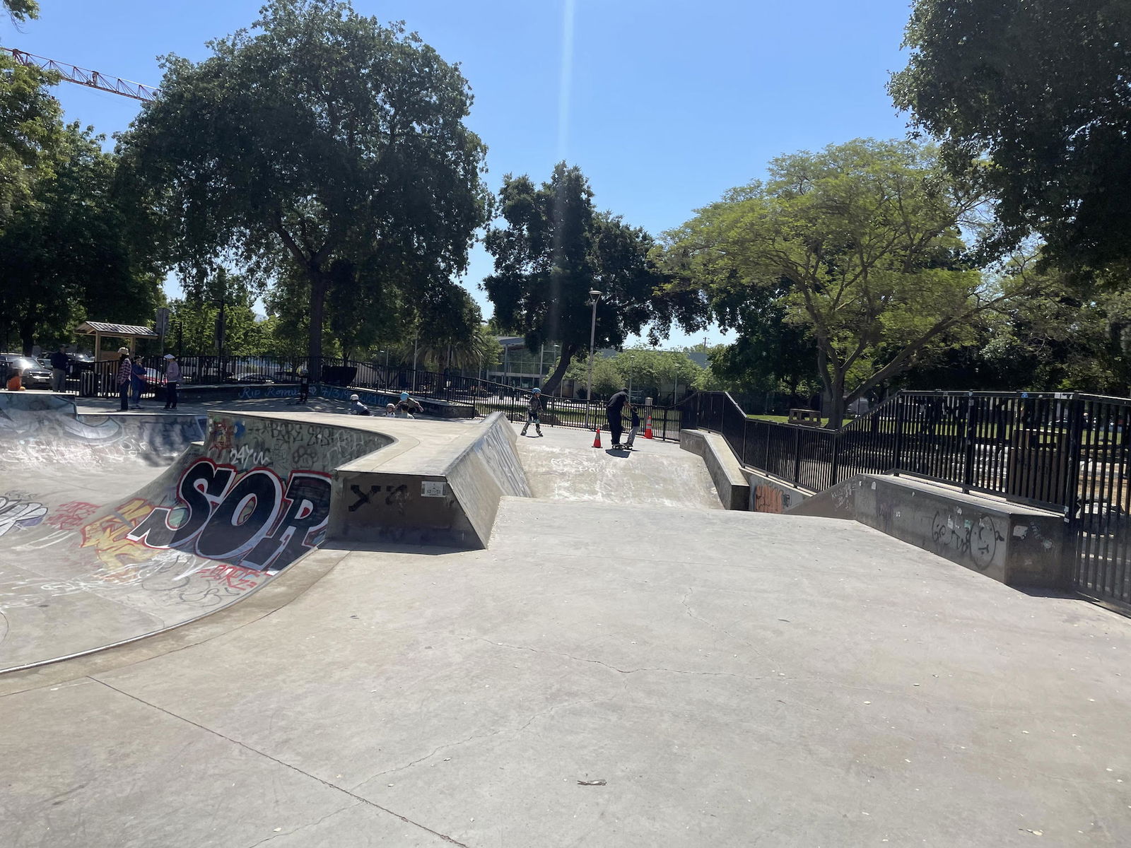 Roosevelt skatepark is a concrete park featuring two bowls and a street area.