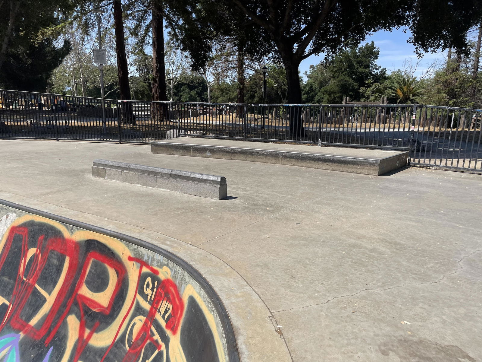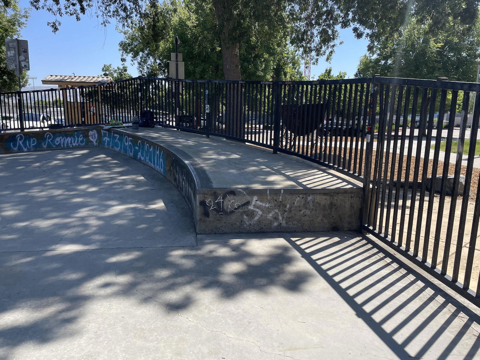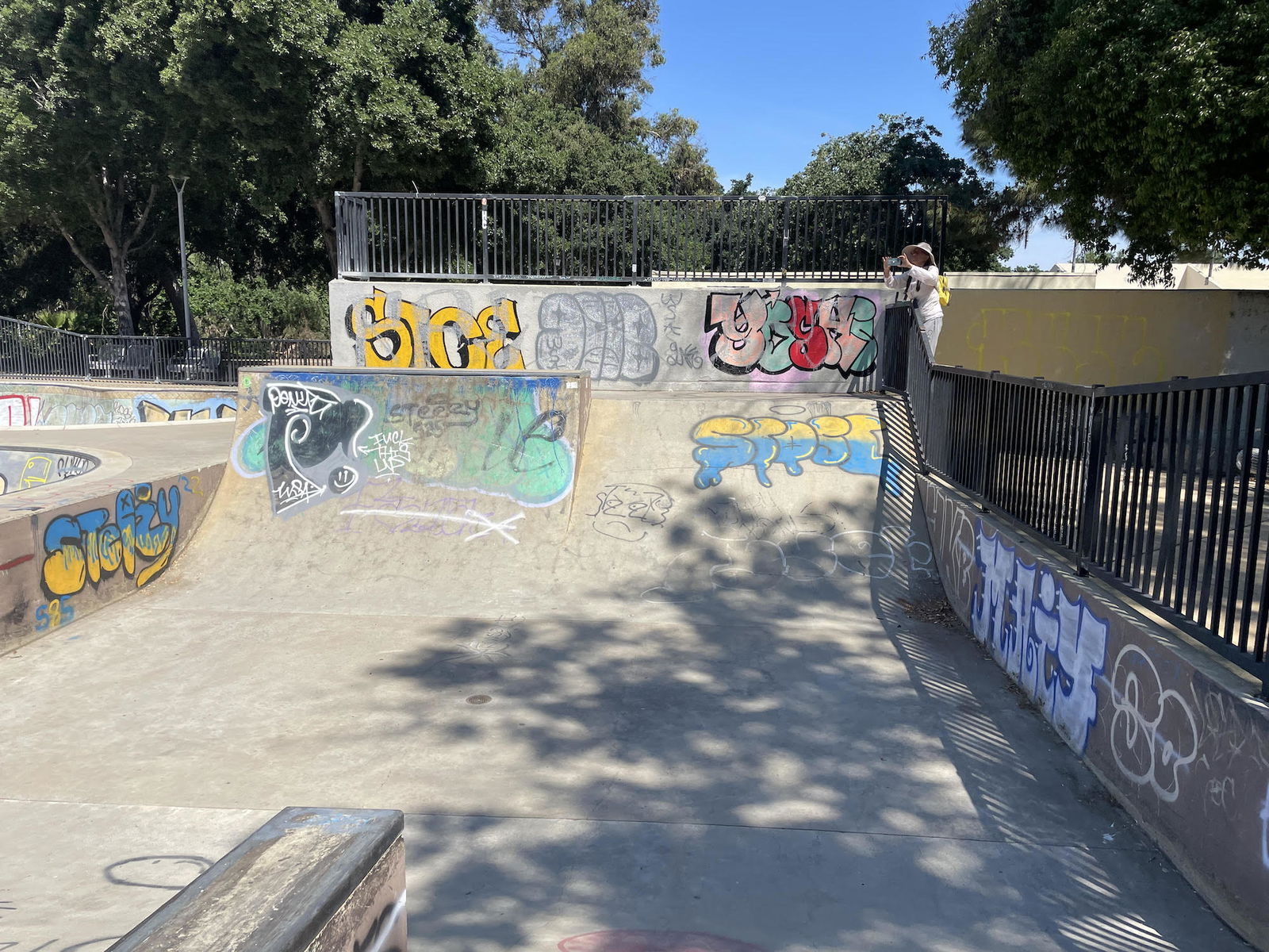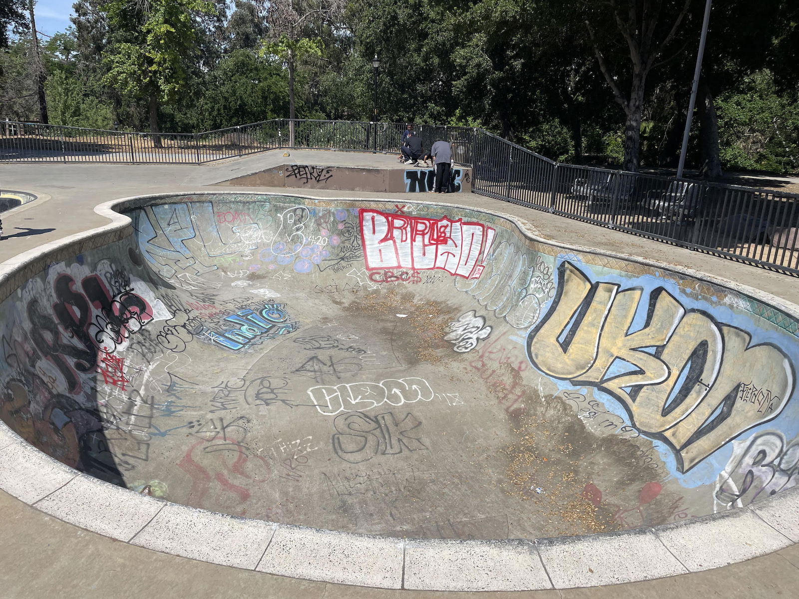 Roosevelt skatepark is a concrete park featuring two bowls and a street area.