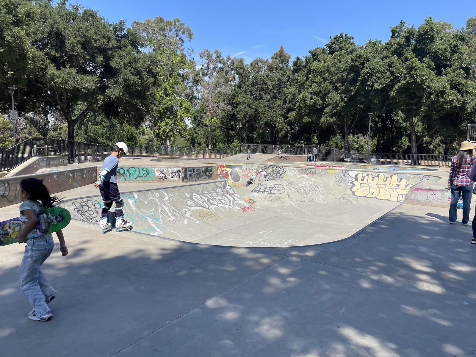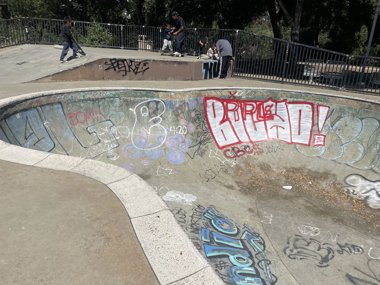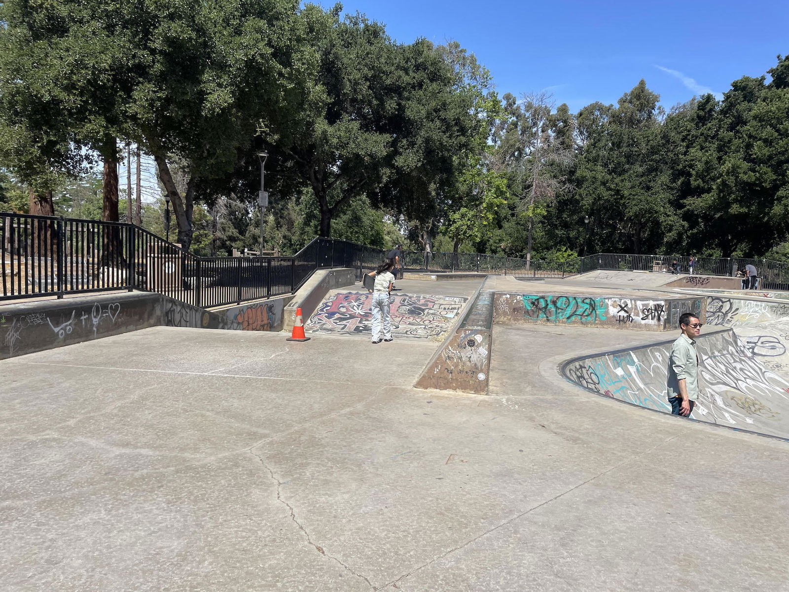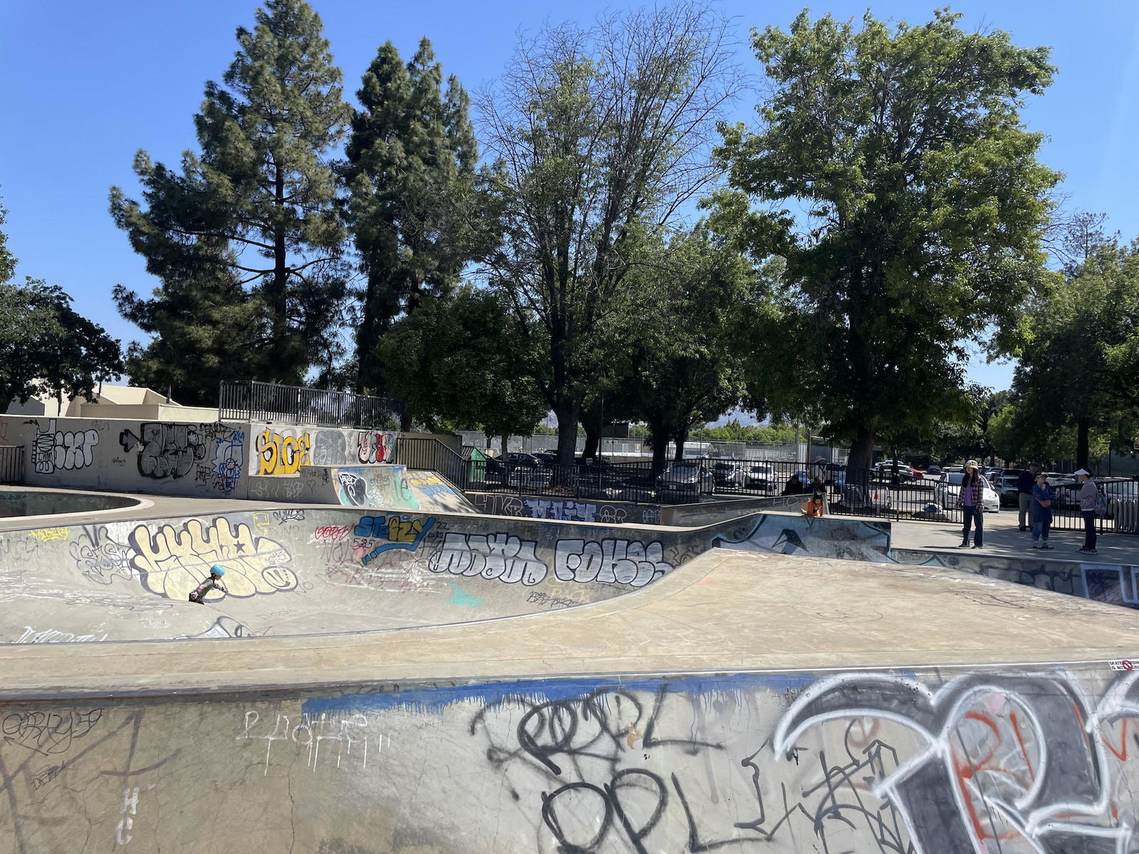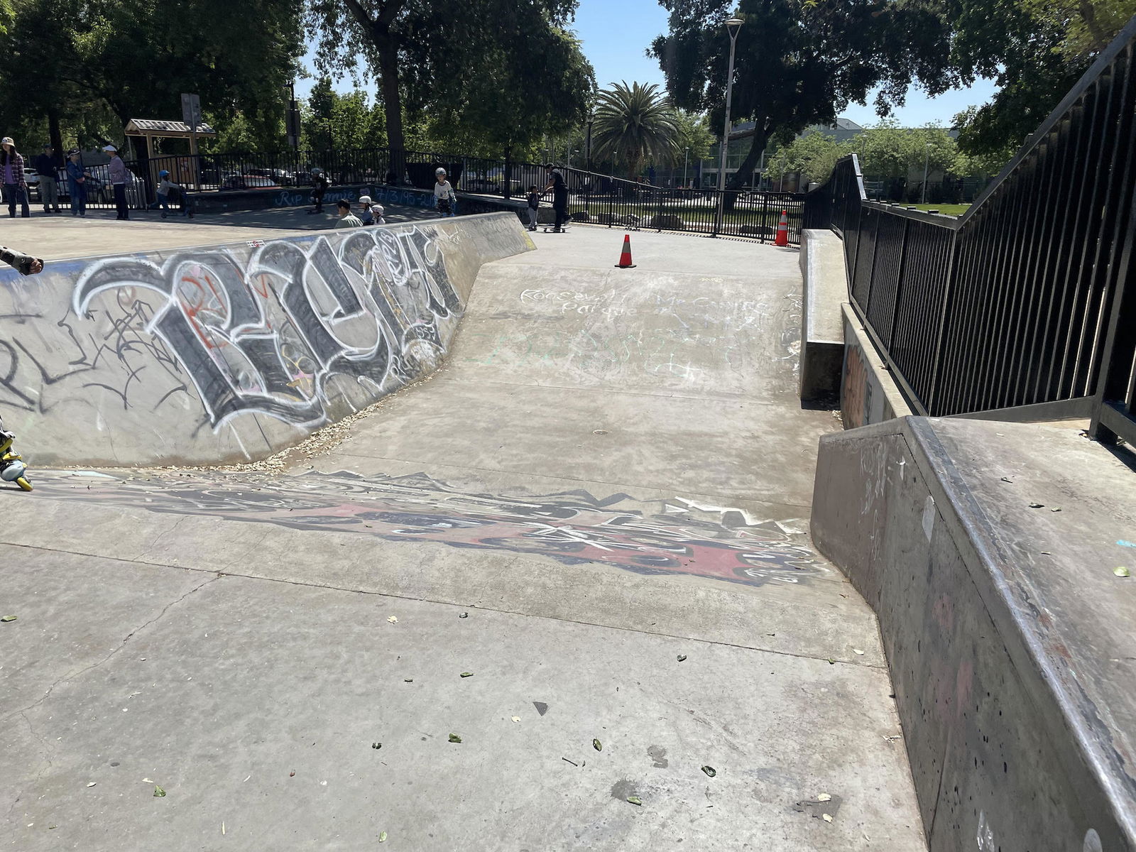 Roosevelt skatepark is a concrete park featuring two bowls and a street area.