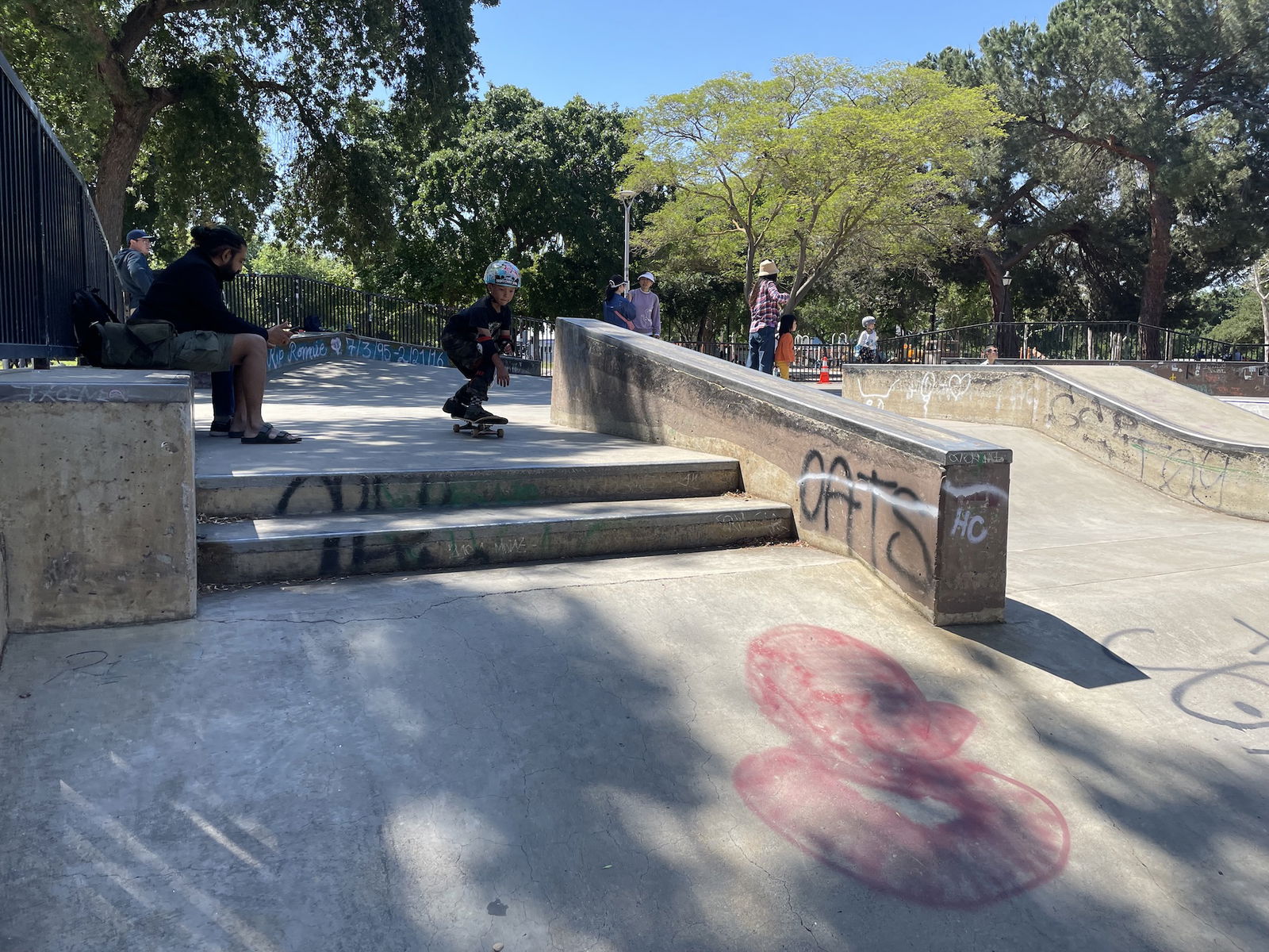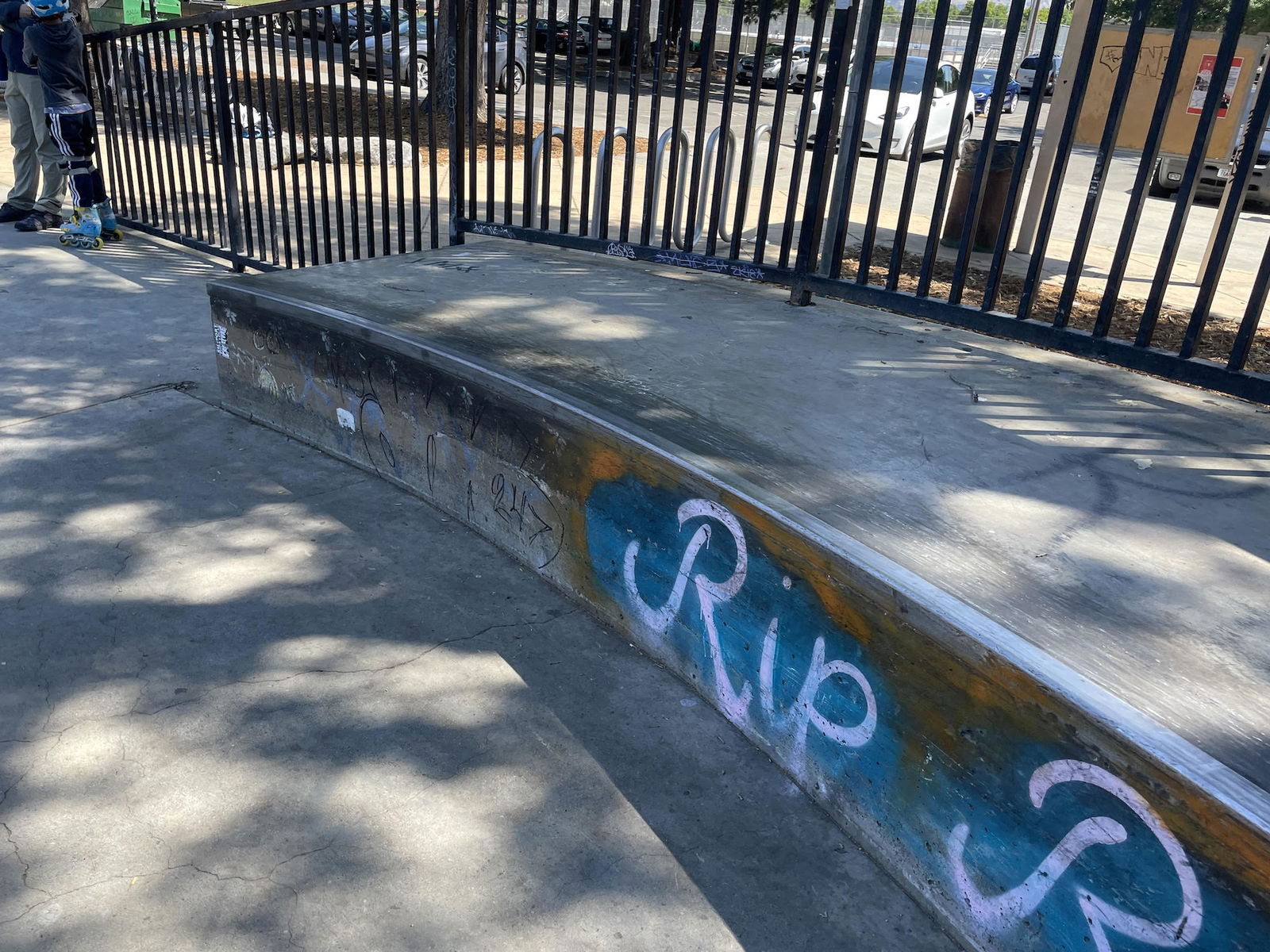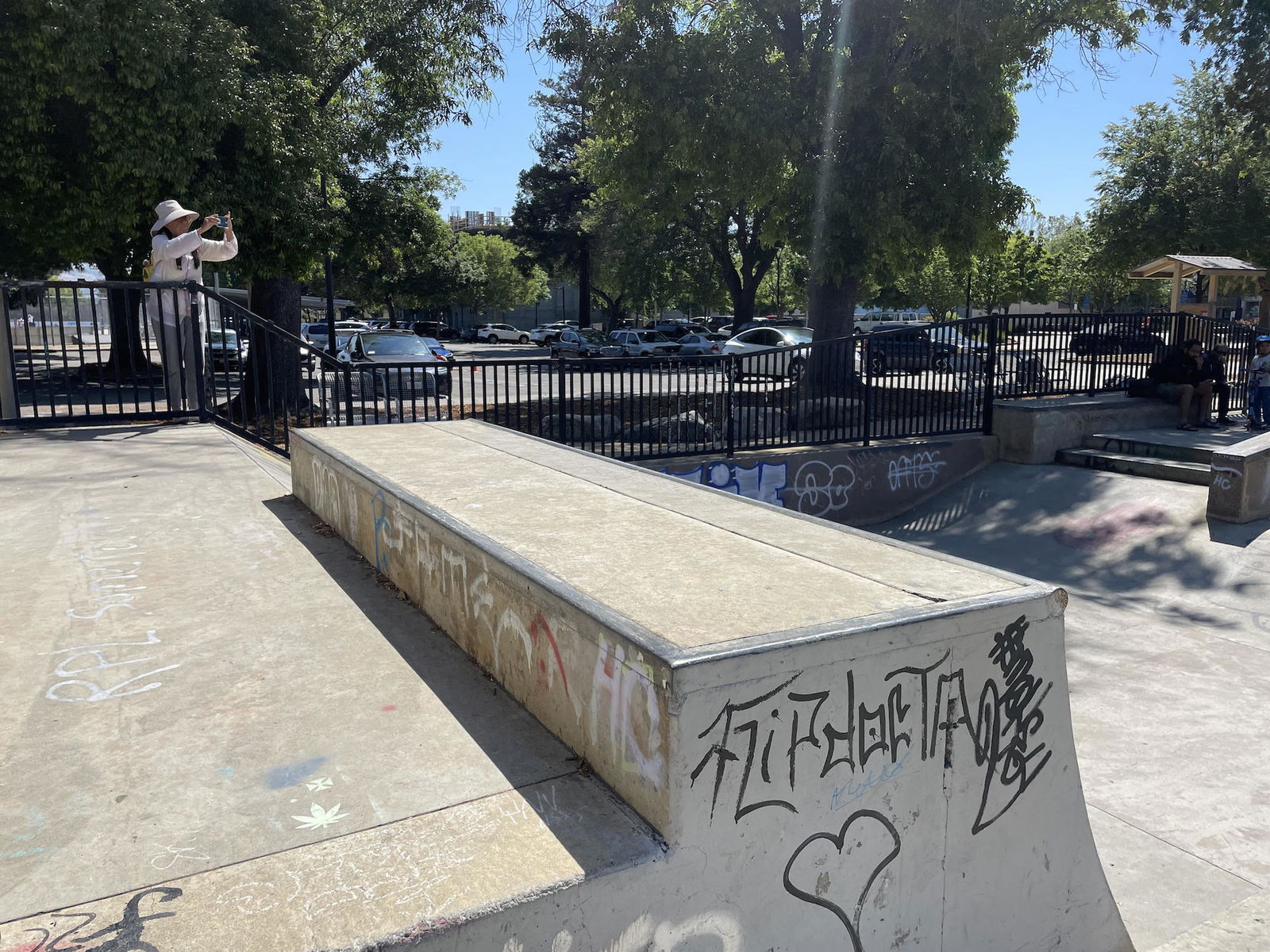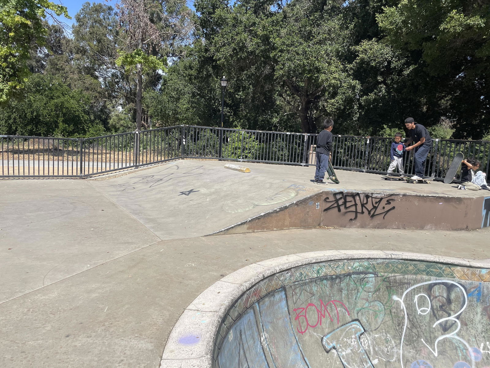 Roosevelt skatepark is a concrete park featuring two bowls and a street area.