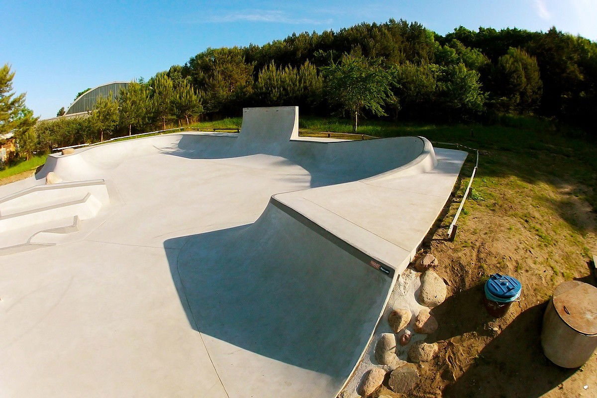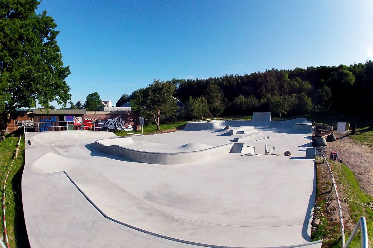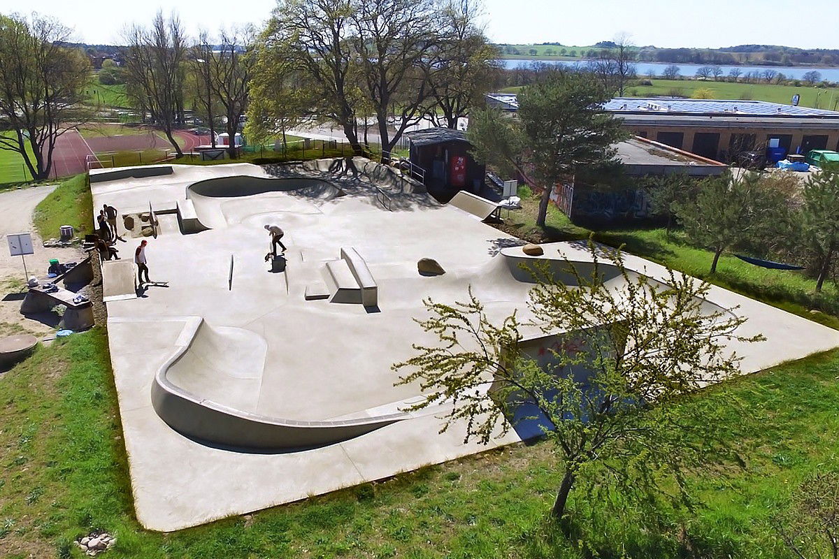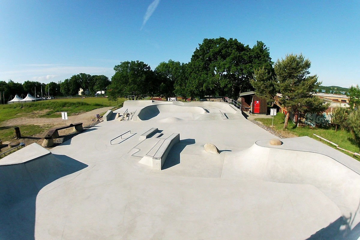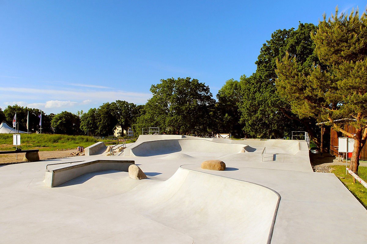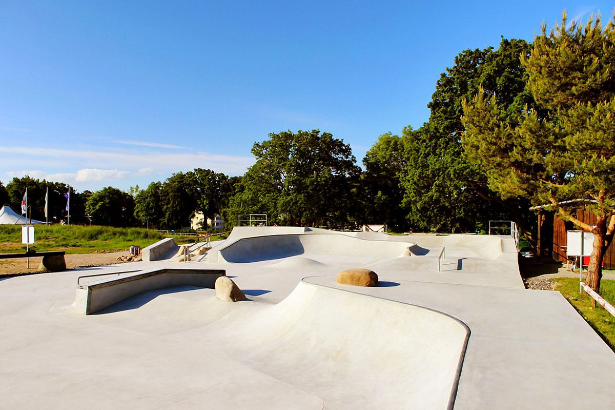 Rügen Skatepark is a concrete park where transition and street elements are balanced. There‘s an open bowl on one end, a corner with a tall vert extension on the other, and street features in between and scattered throughout. It was built by Yamato Living Ramps in 2014.