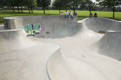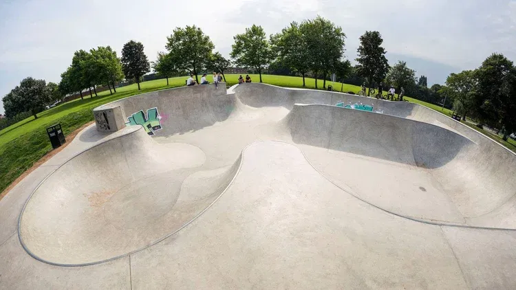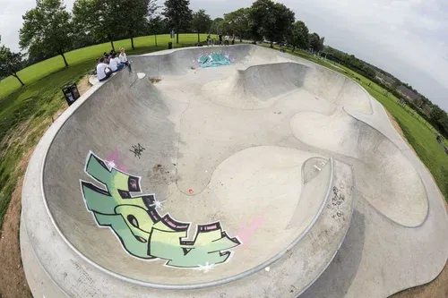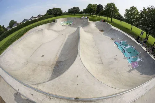 Rushall skatepark features a large concrete bowl with spine. The skatepark was built by Maverick skateparks.