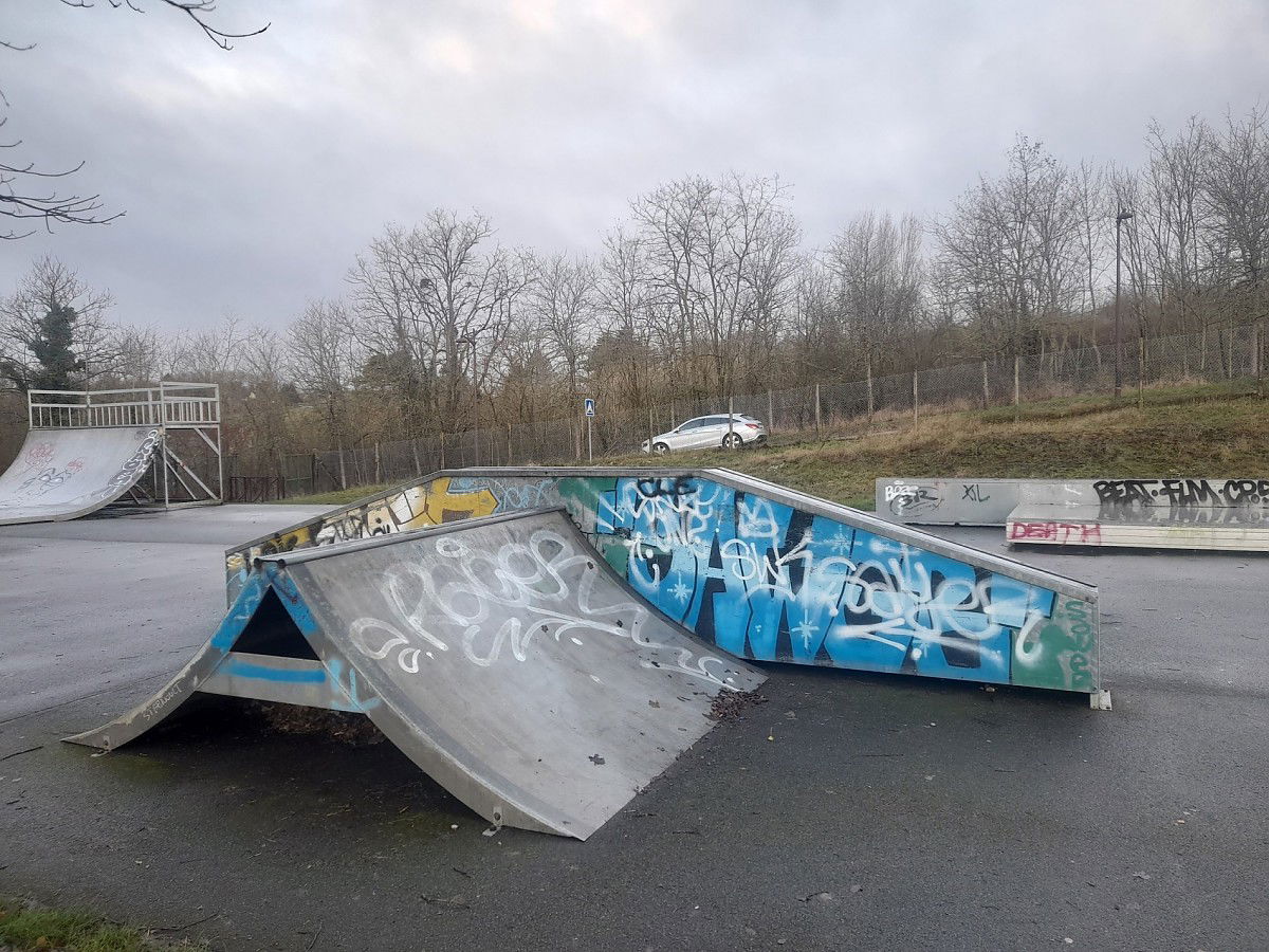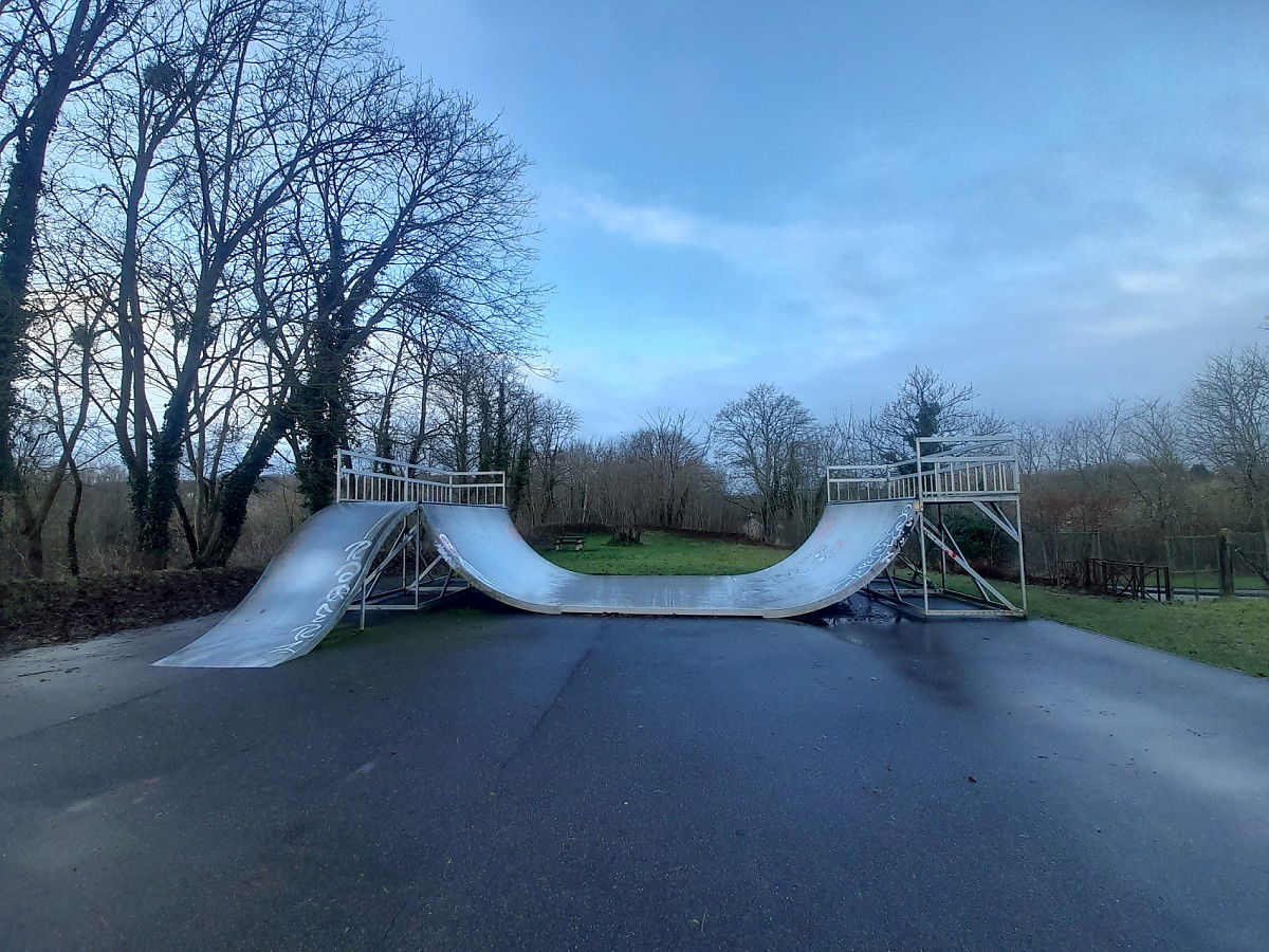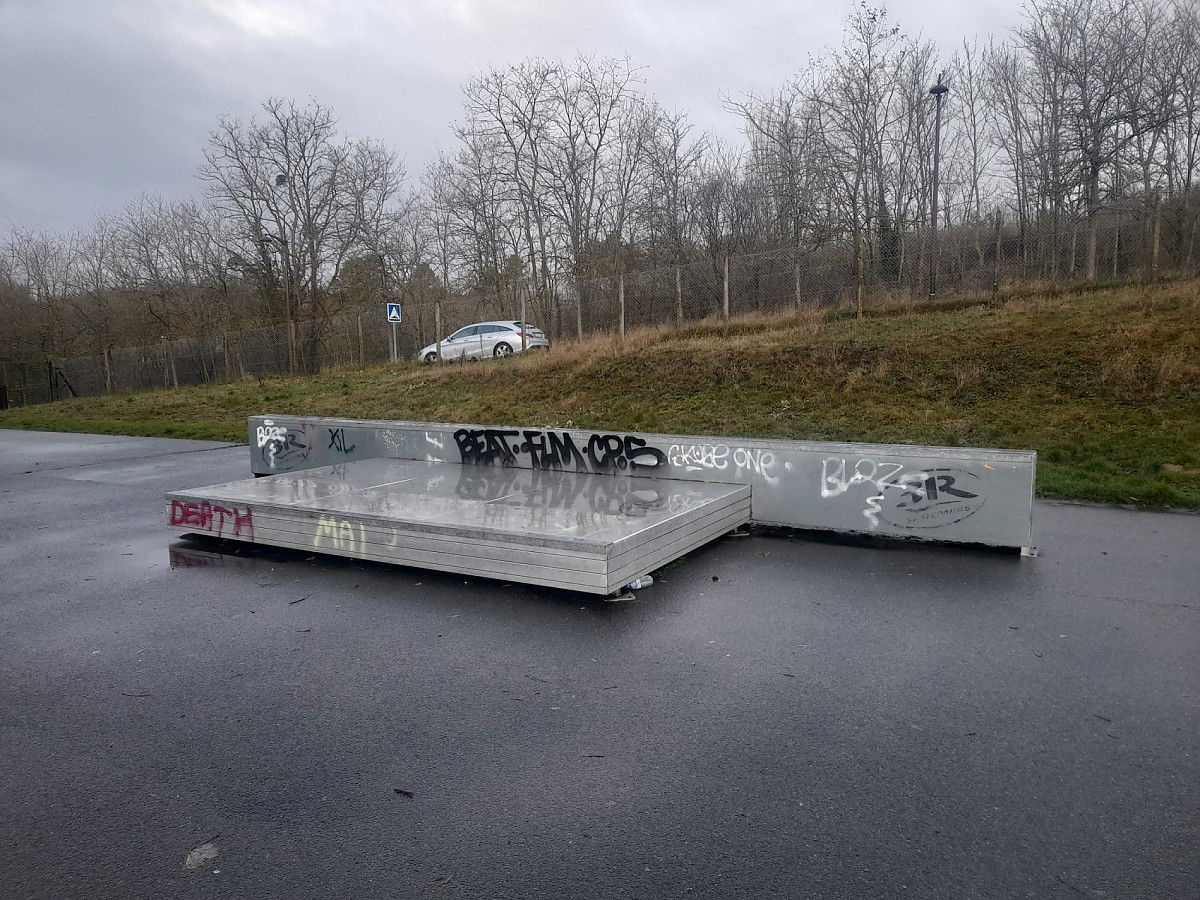Saint Arnoult en Yvelines skatepark features a miniramp, roll-in, jumpbox, flatrail, manualpad and ledge.