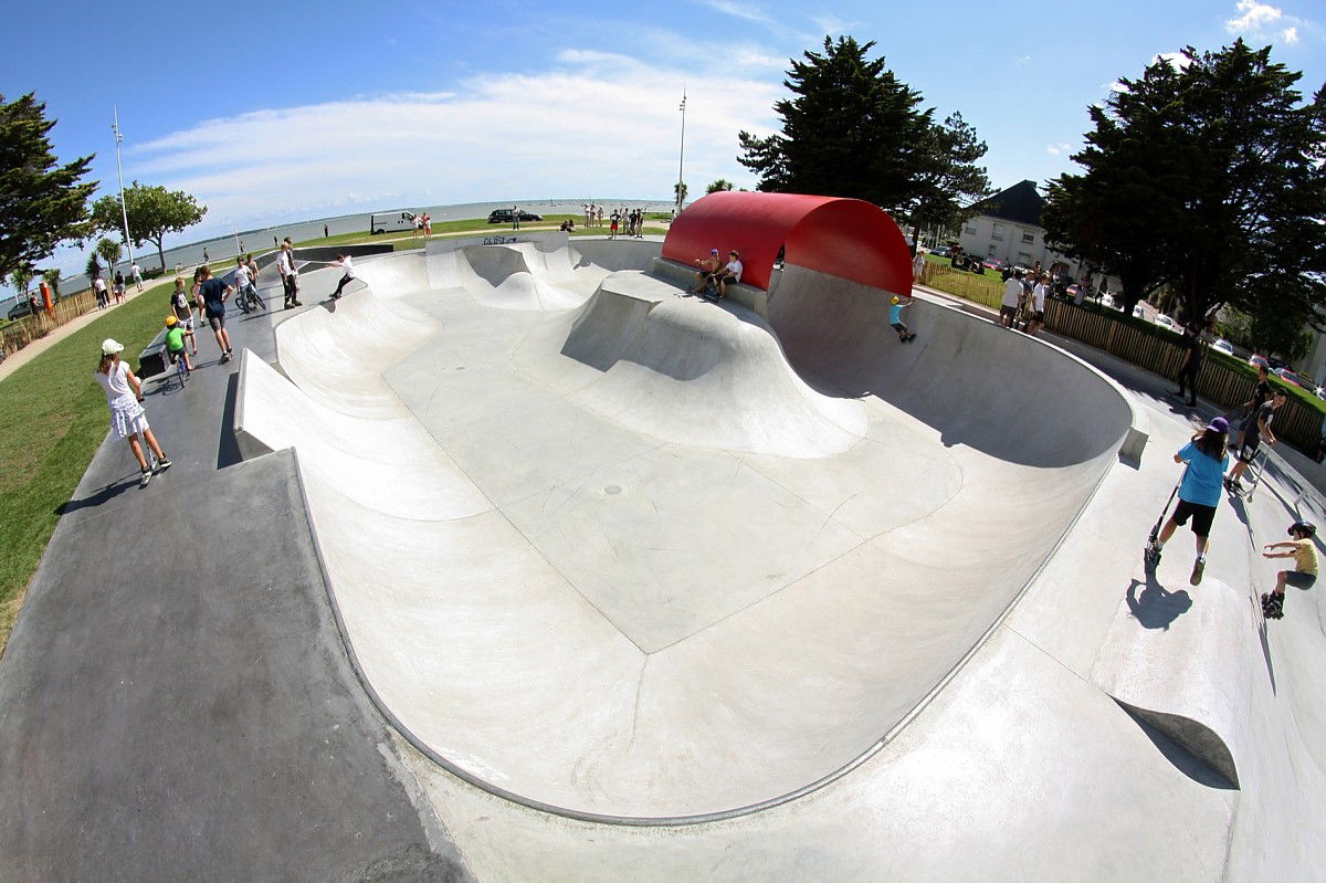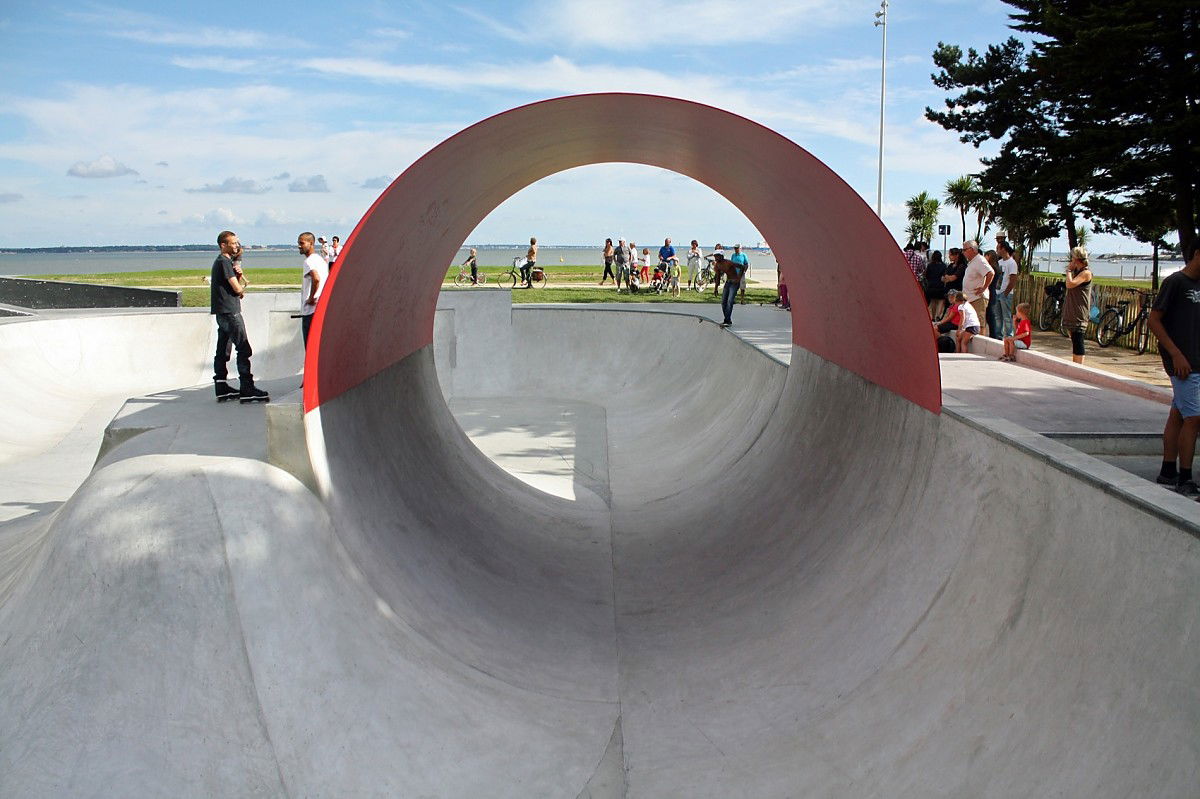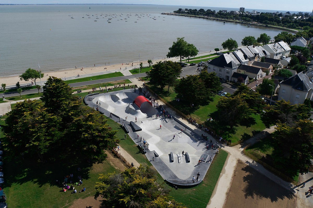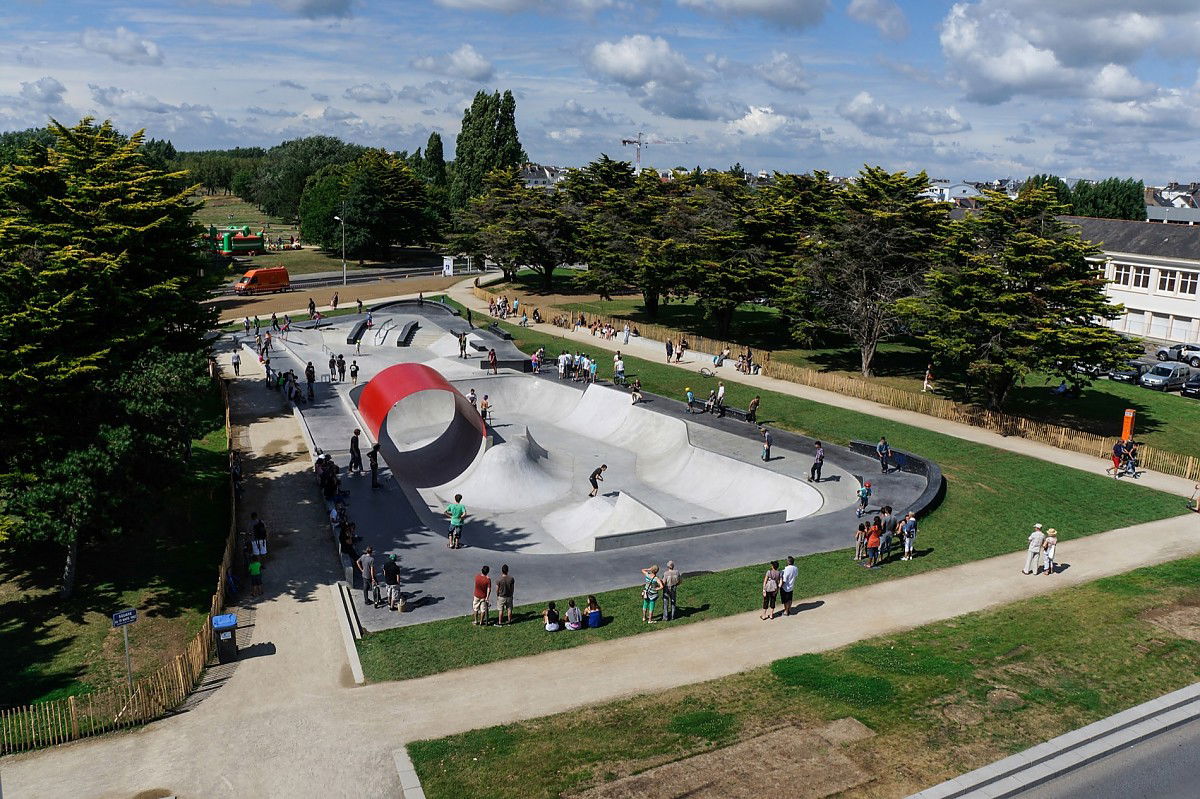 The 1200 m² Saint Nazaire skatepark was designed and built by Constructo Skateparks in 2013 who teamed up with Phytolab for the mandatory landscaping. Total estimated cost: 385000€.