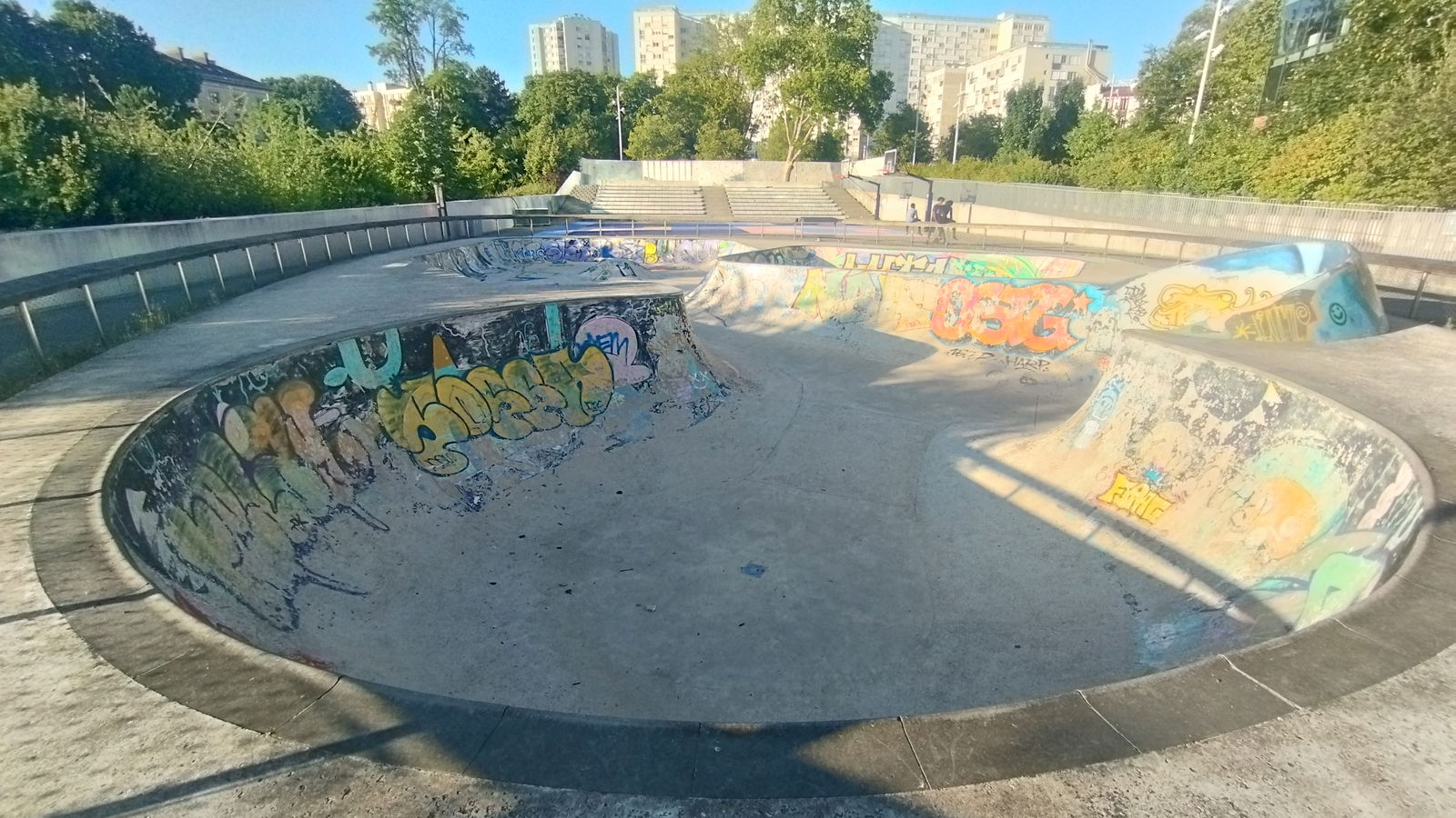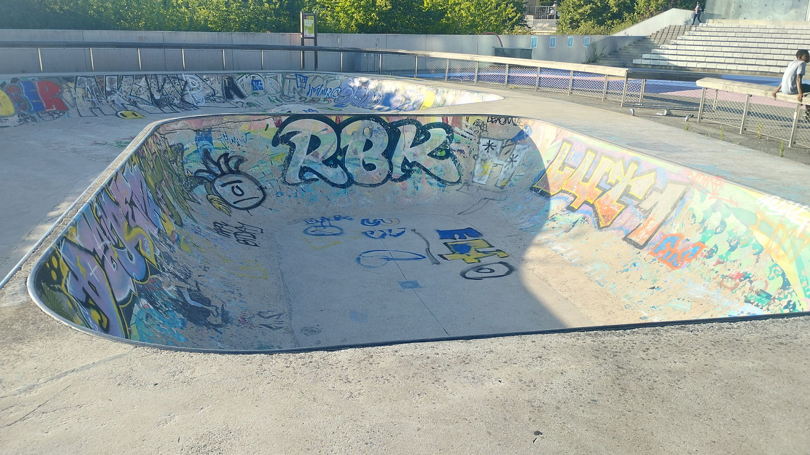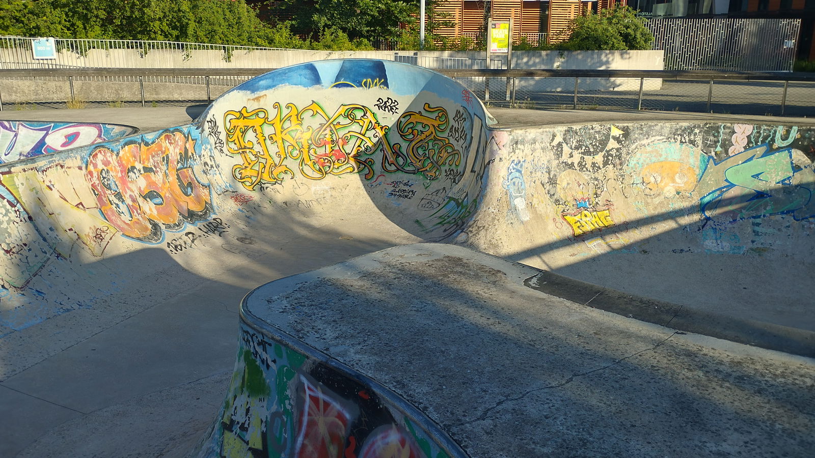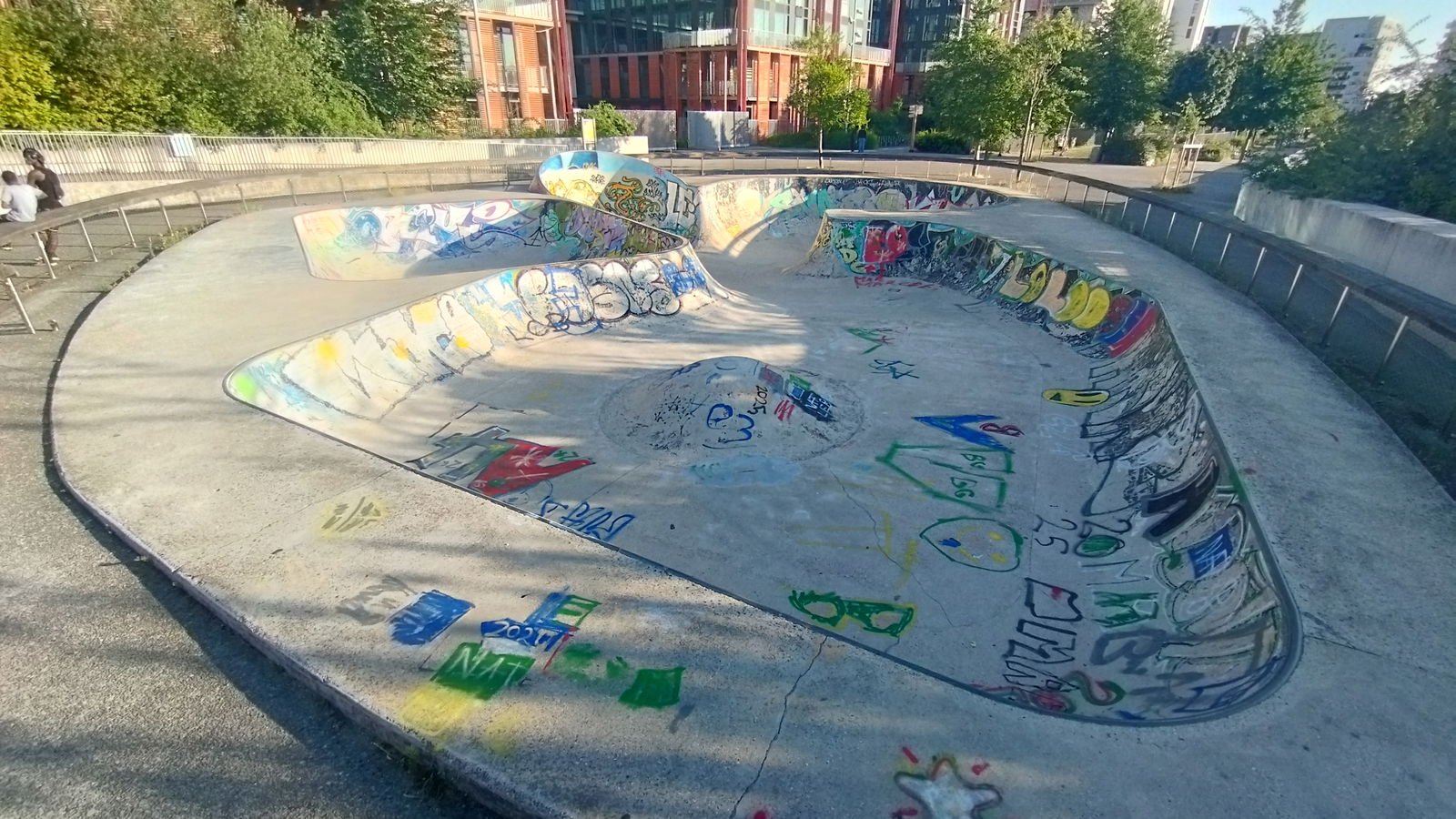 Saint-Ouen skatepark features two concrete bowls connected with a spine.