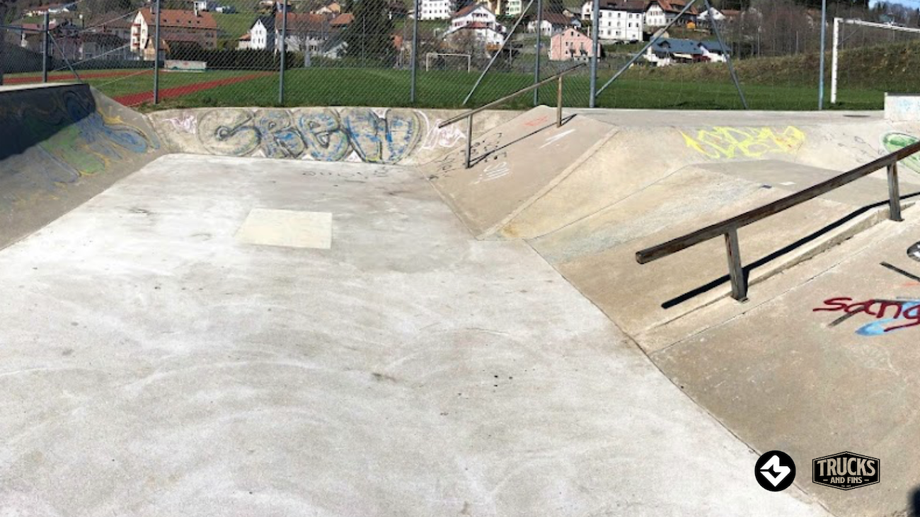 The 370m² concrete skate park in St. Croix VD is located at the "Center sportif des Champs de la Joux".