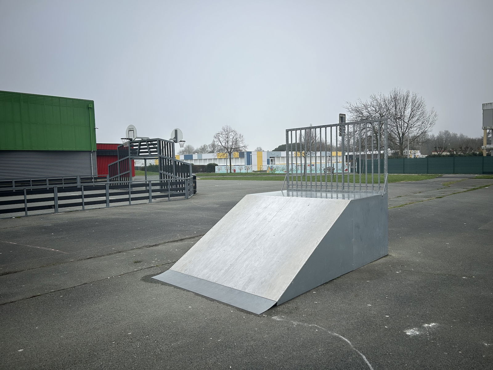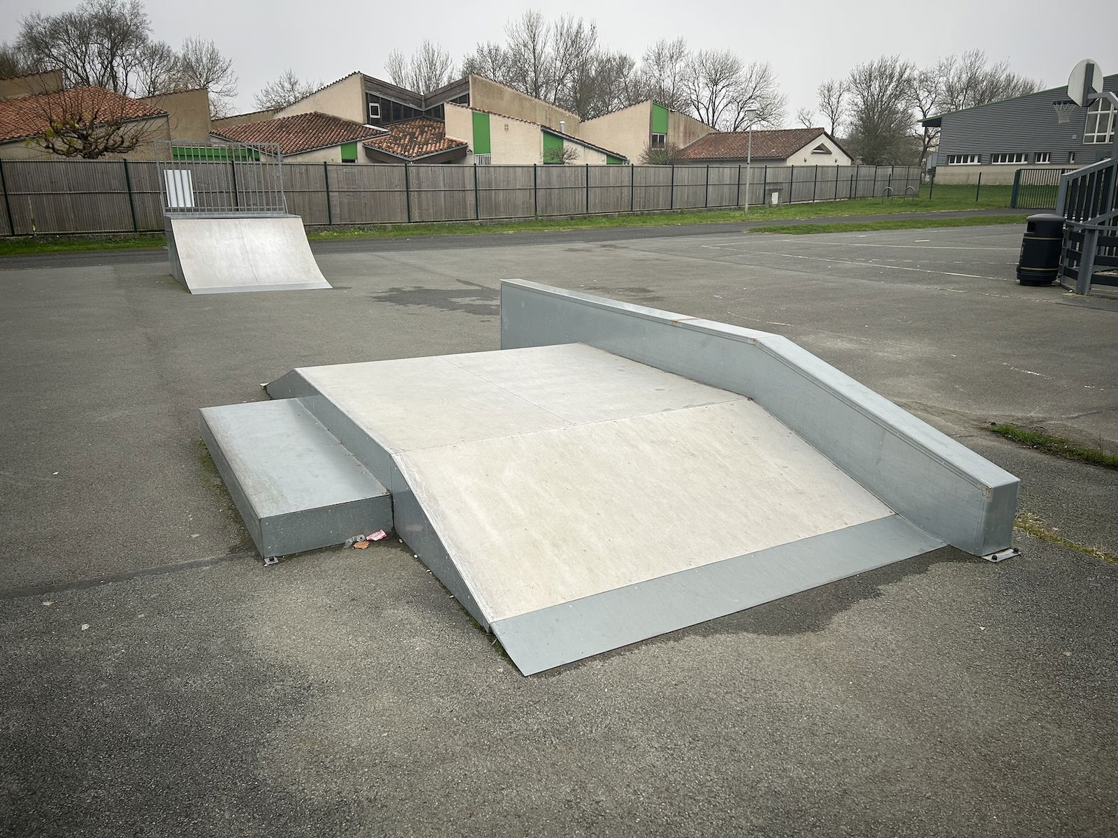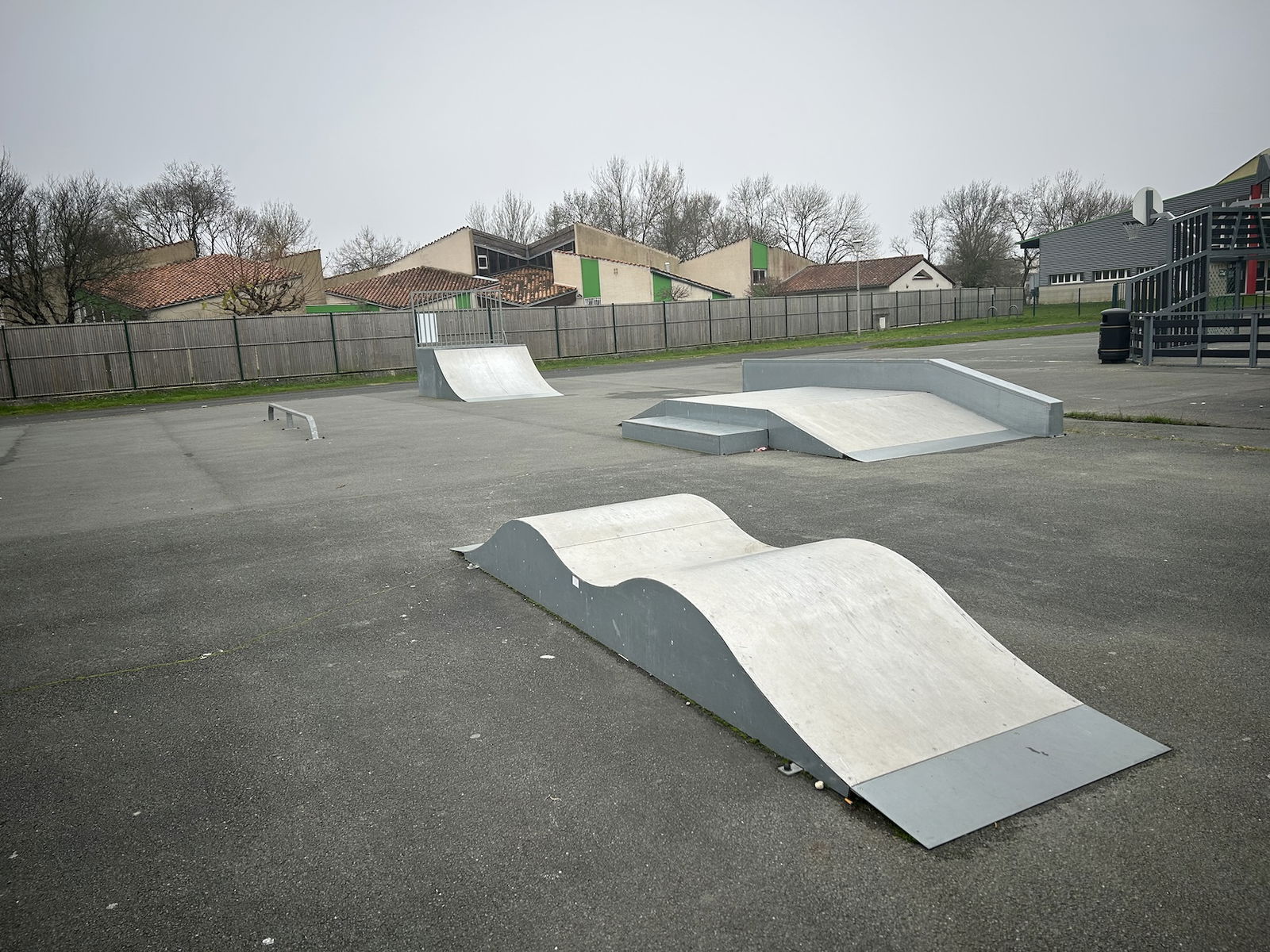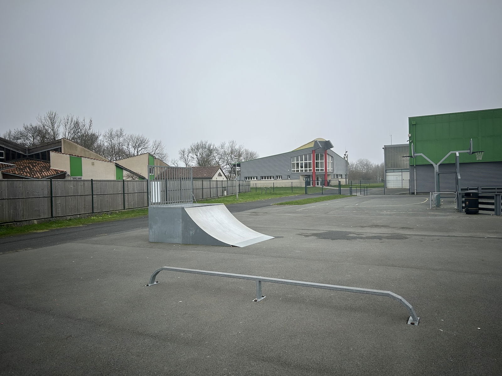 Saujon skatepark is made up of a back and forth run with a quarter pipe and flat bank either side of a funbox.