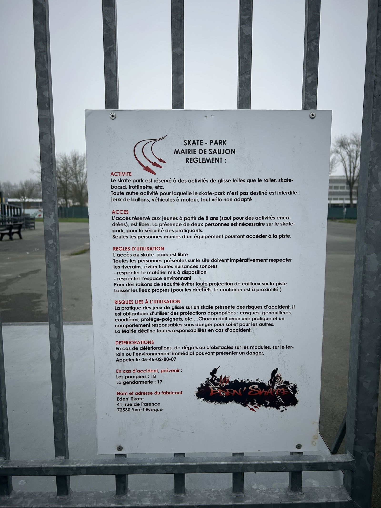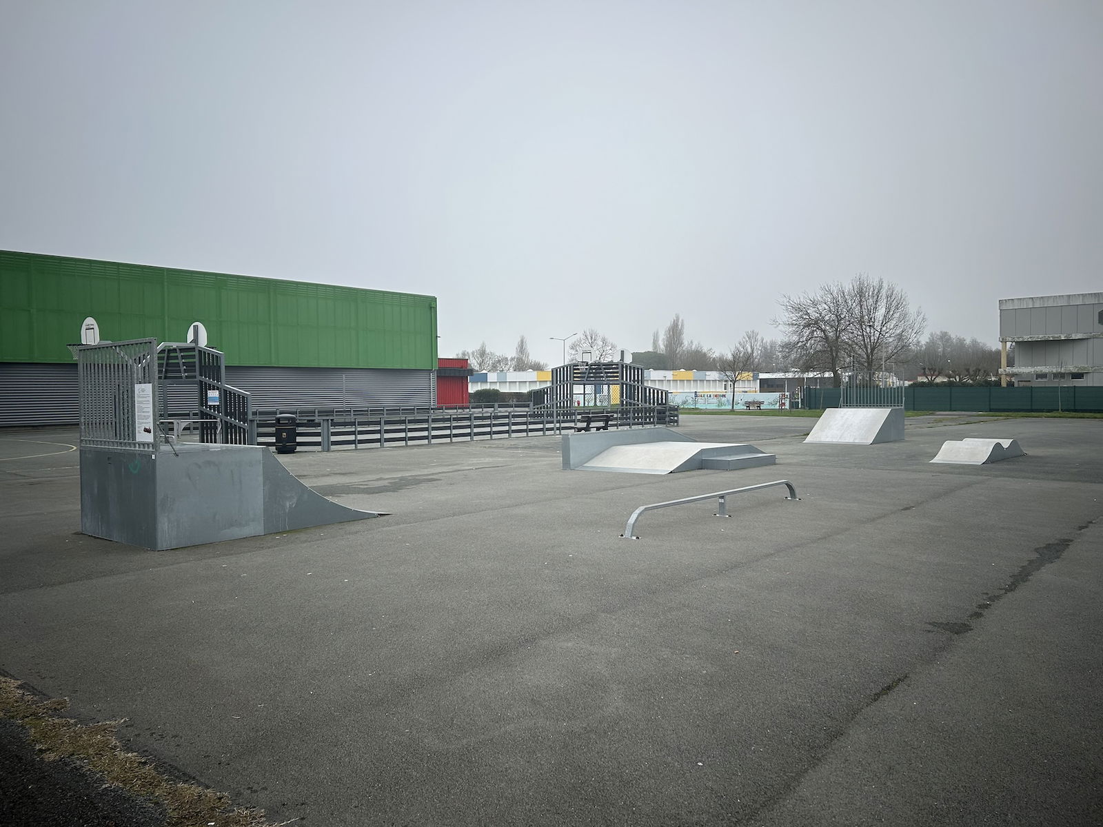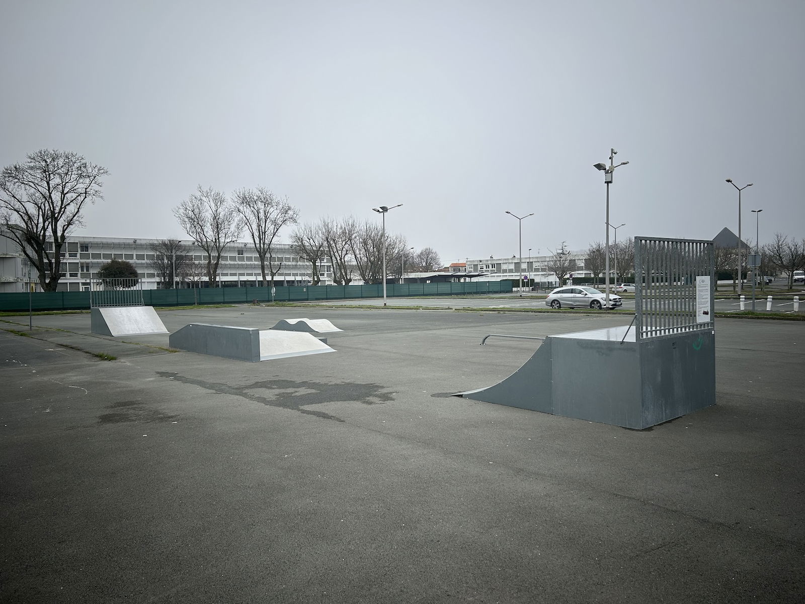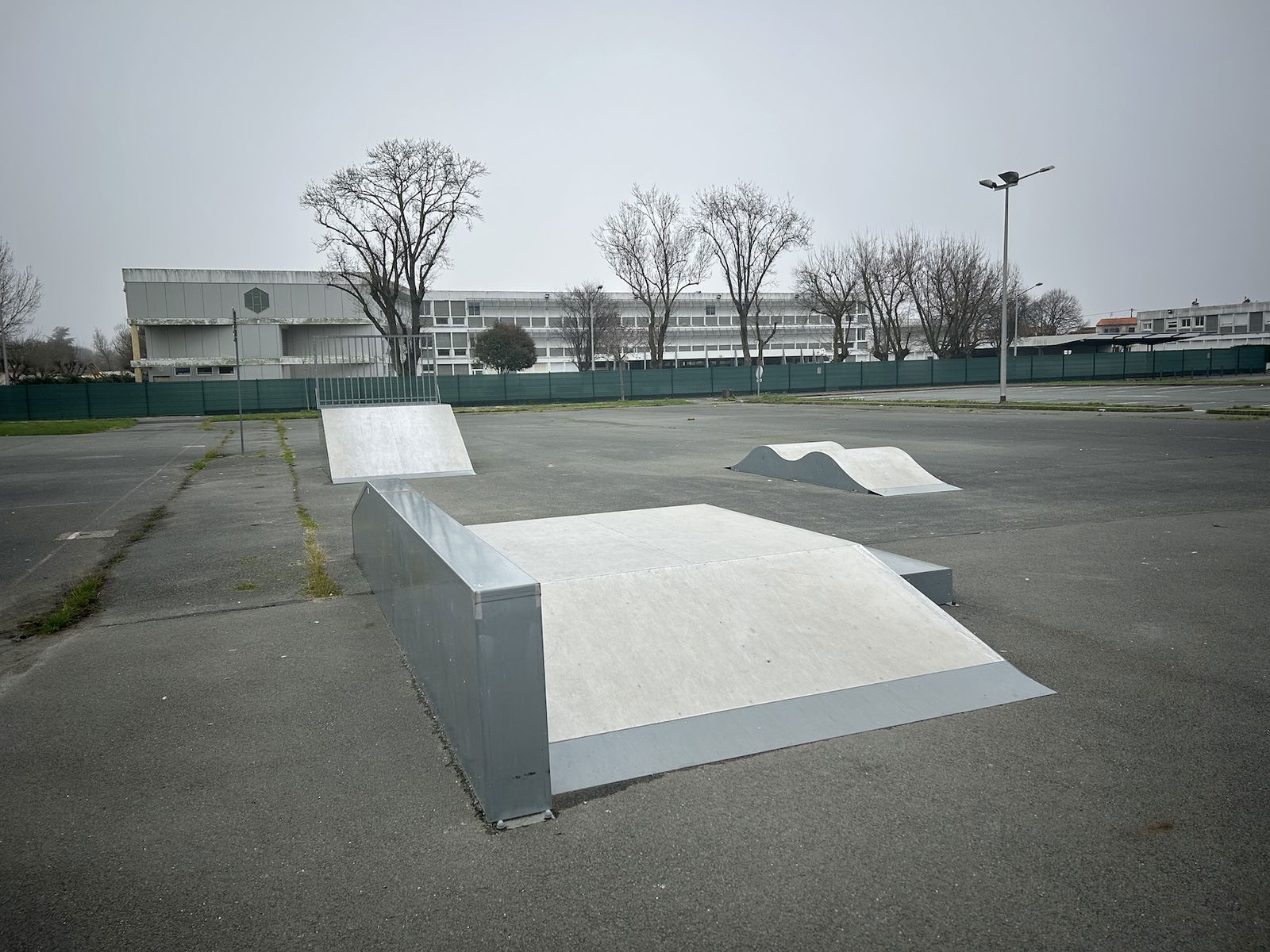 Saujon skatepark is made up of a back and forth run with a quarter pipe and flat bank either side of a funbox.