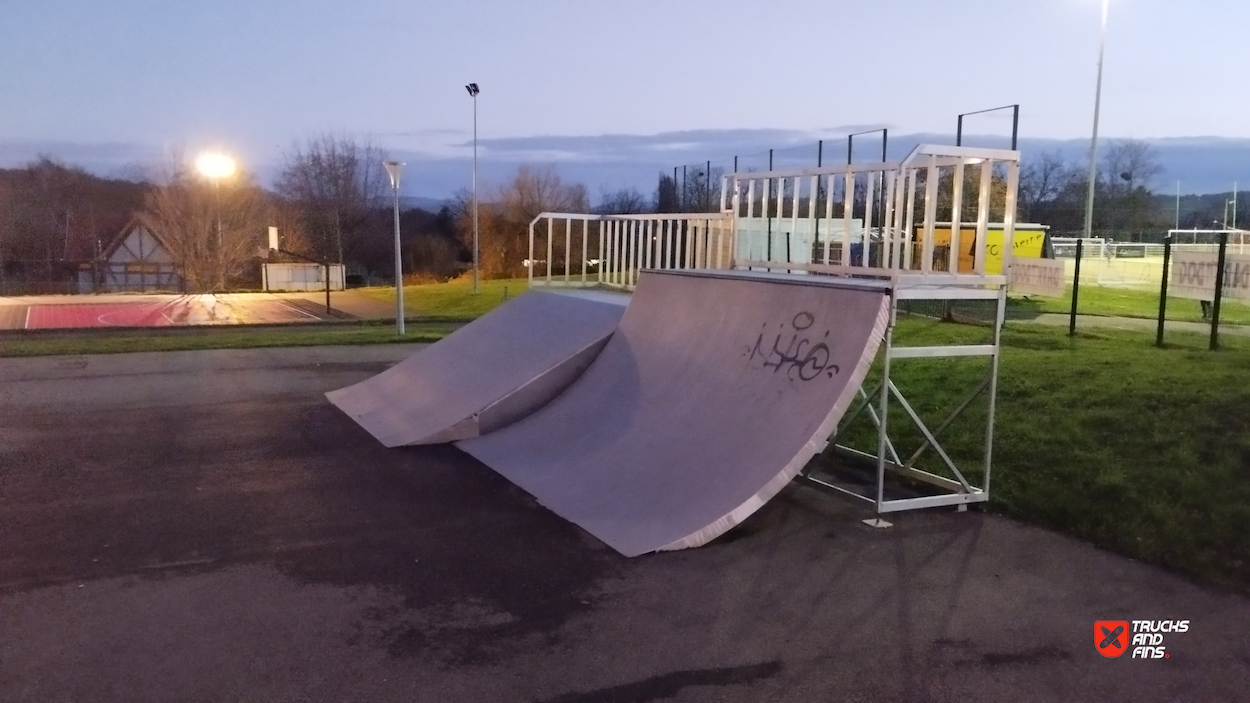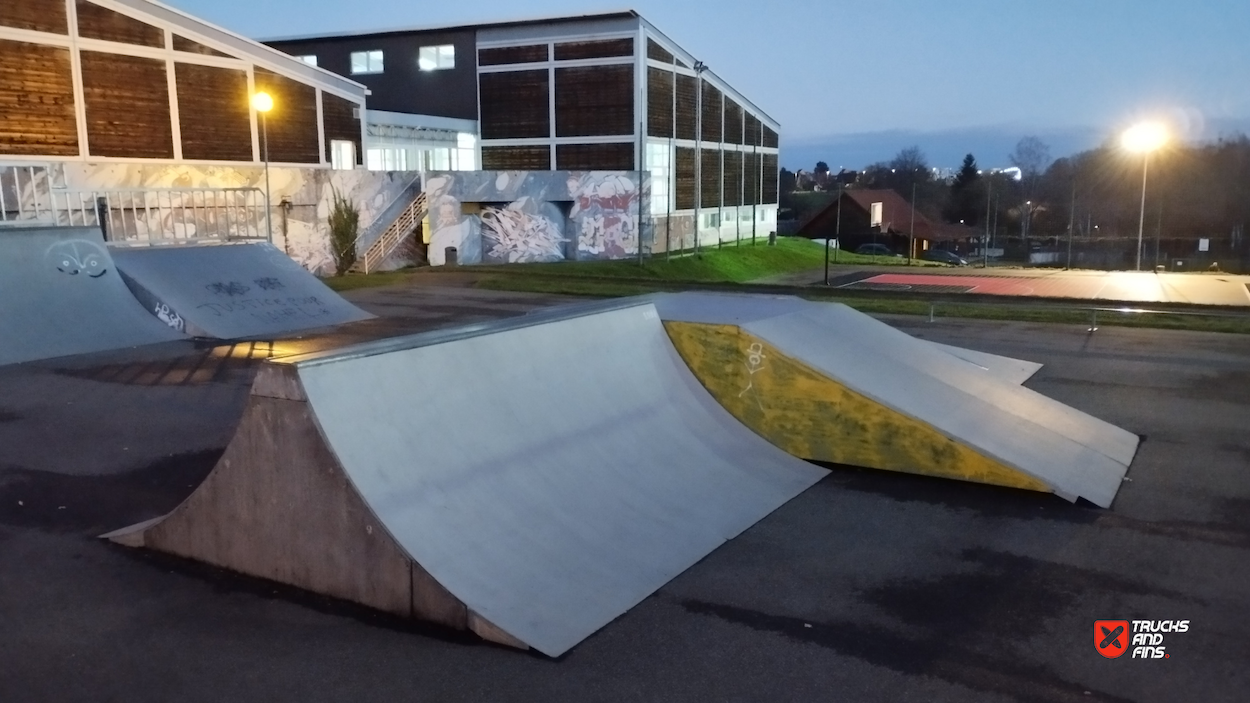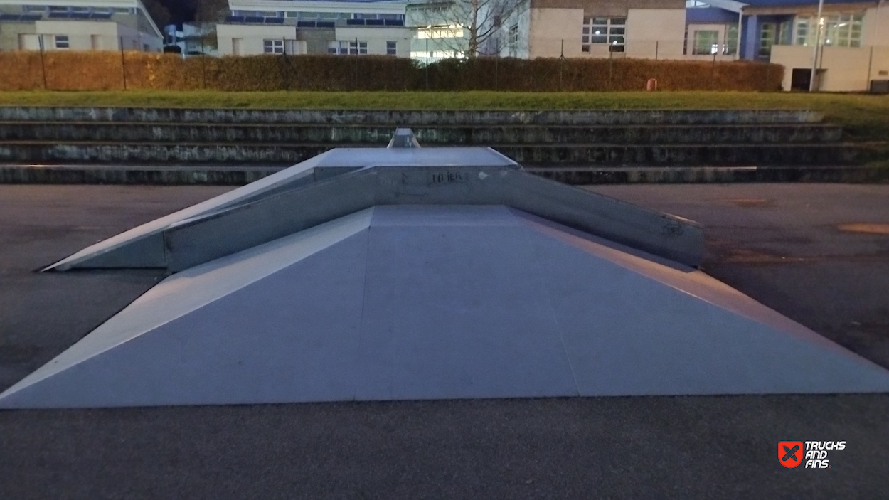 Saverne skatepark is made up of a back and forth run with a quarter pipe and bank on the sides of a funbox.