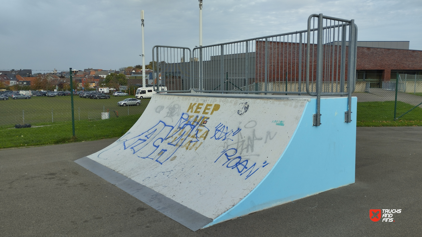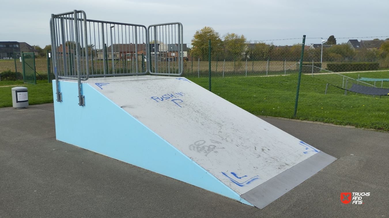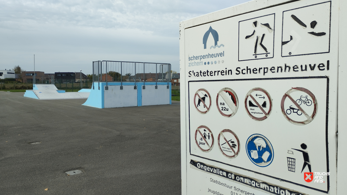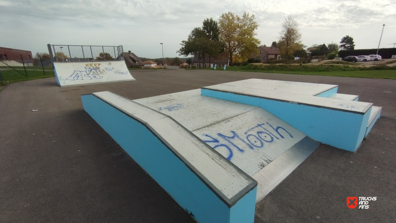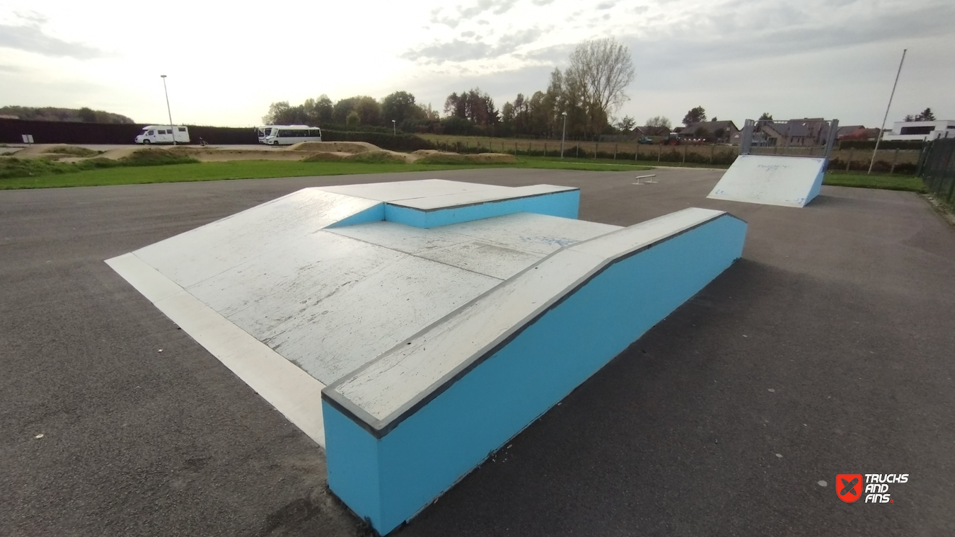 Scherpenheuvel skatepark is made up of a back and forth run with a quarter pipe and flat bank on the sides of a funbox.