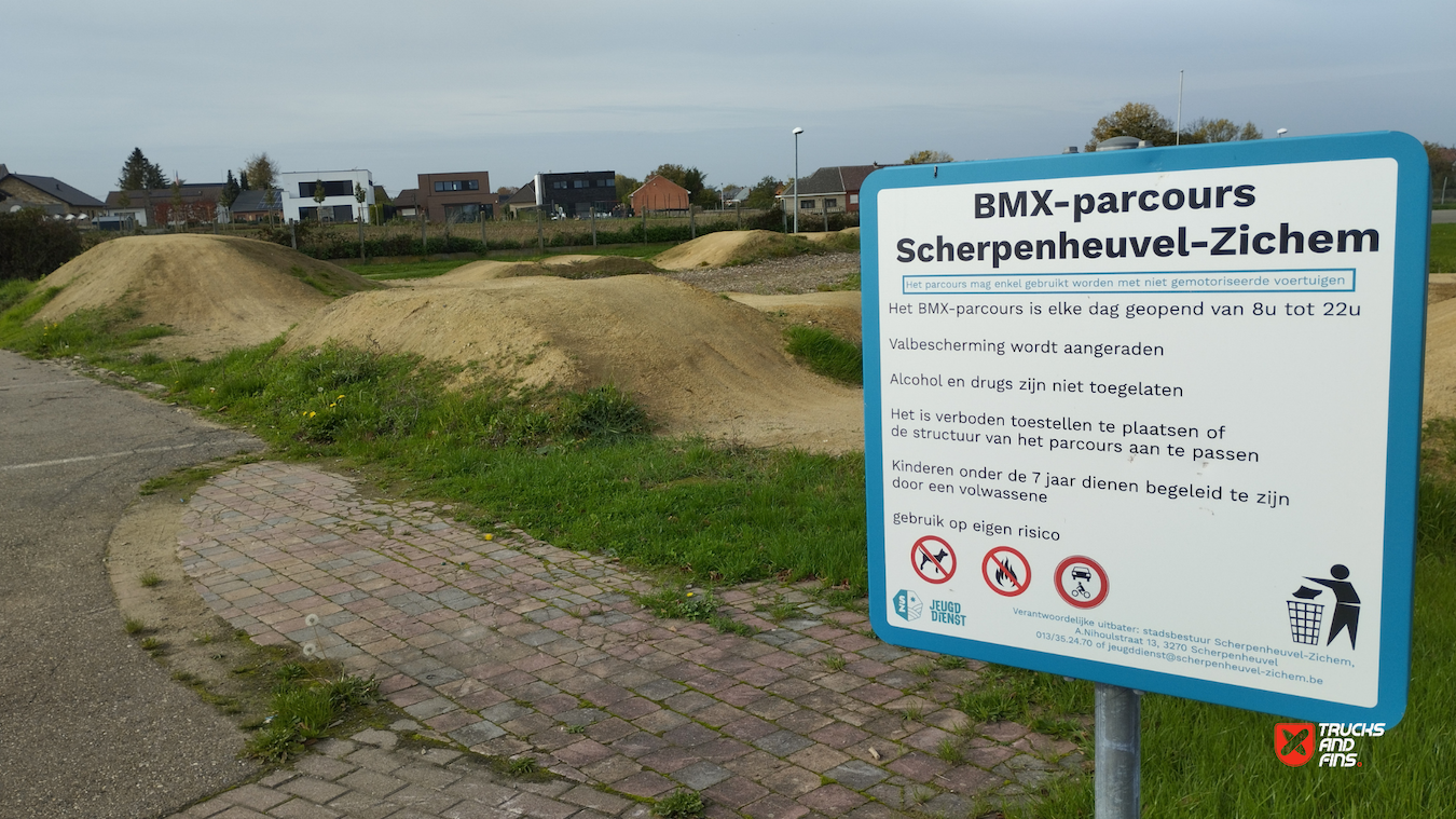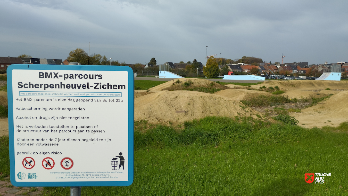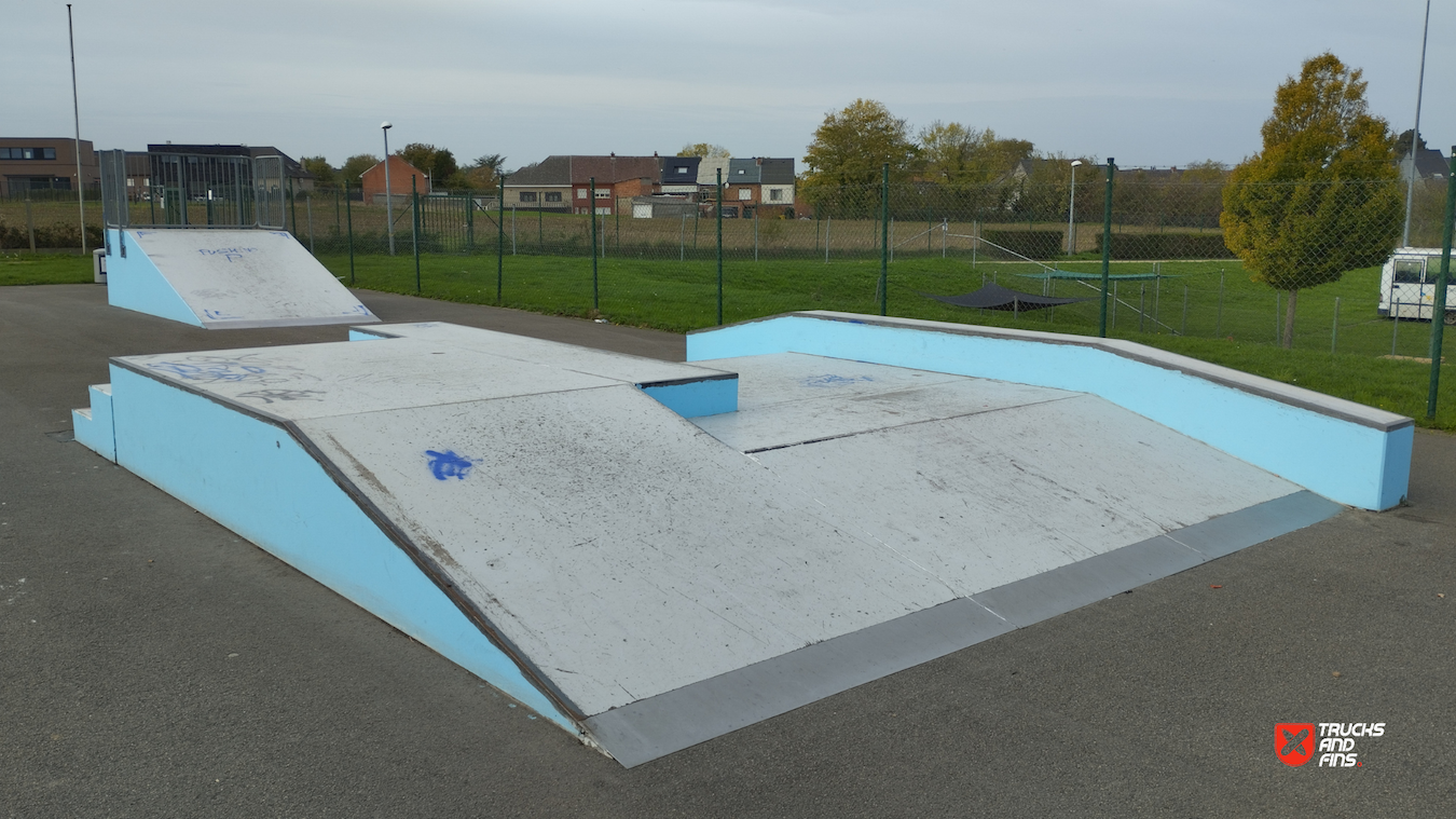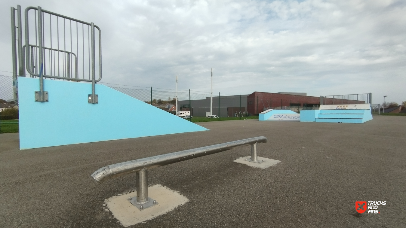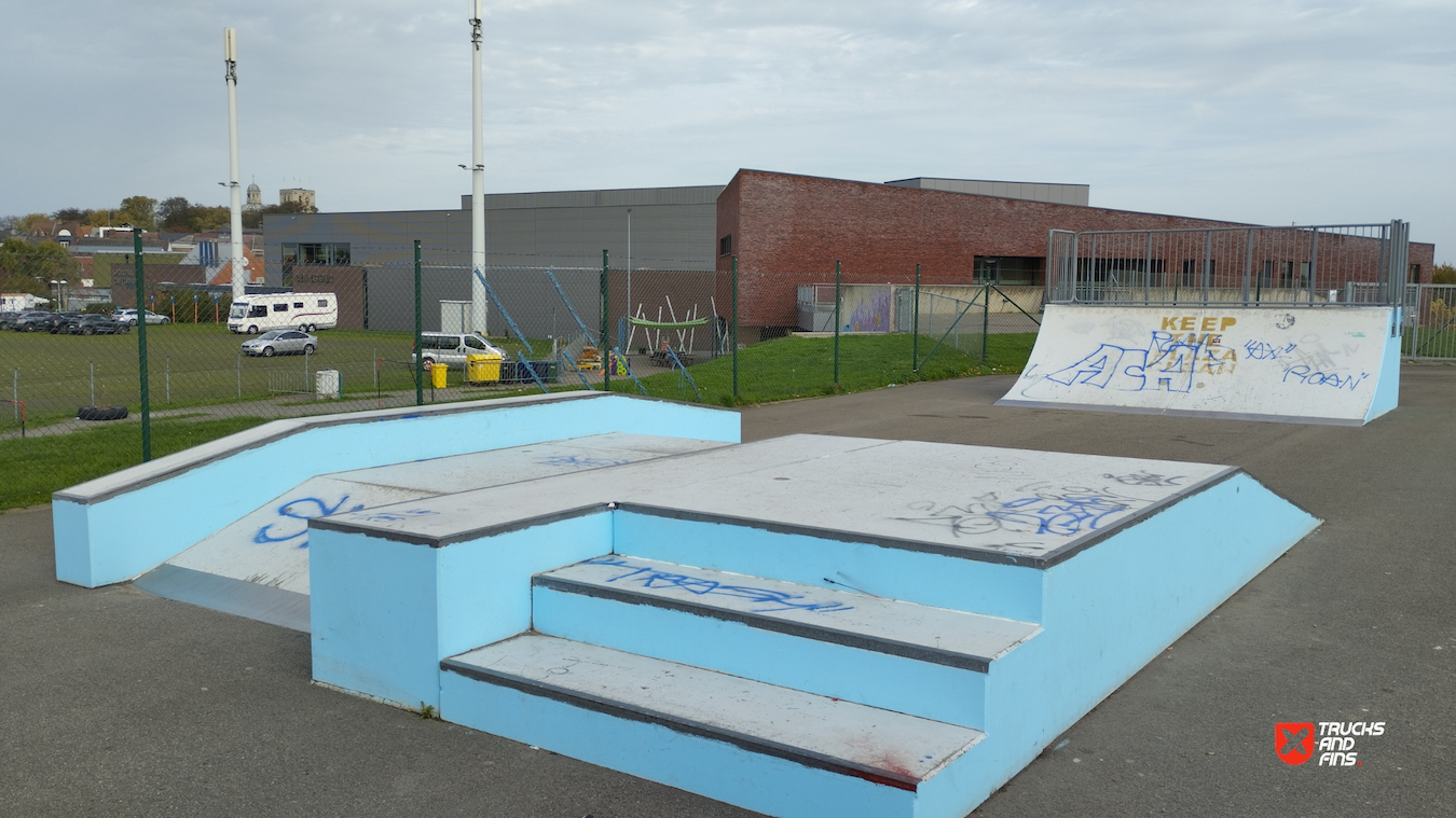 Scherpenheuvel skatepark is made up of a back and forth run with a quarter pipe and flat bank on the sides of a funbox.