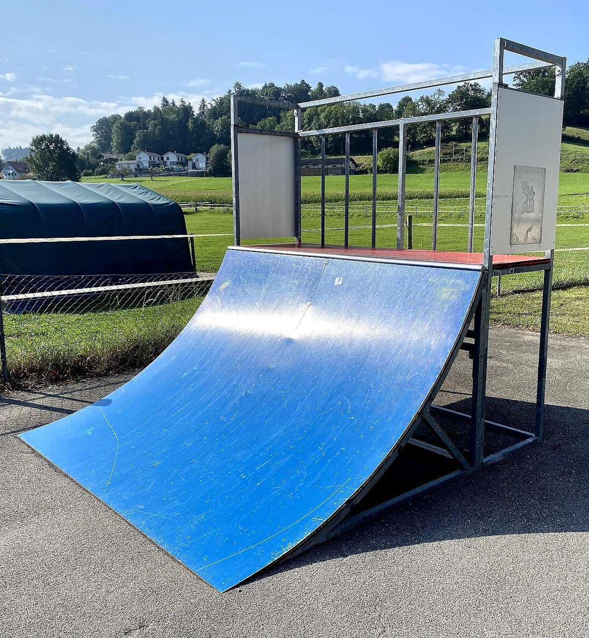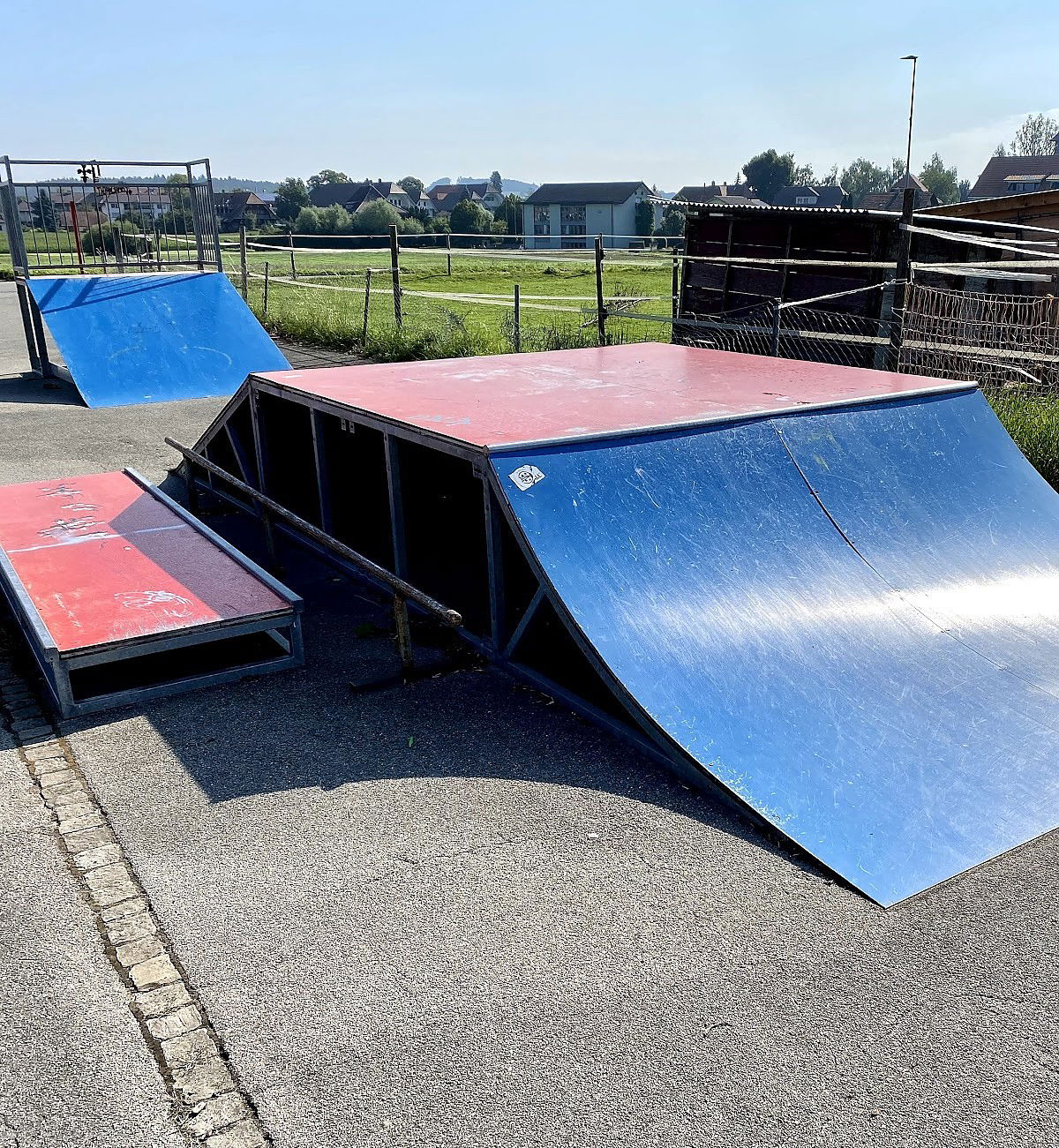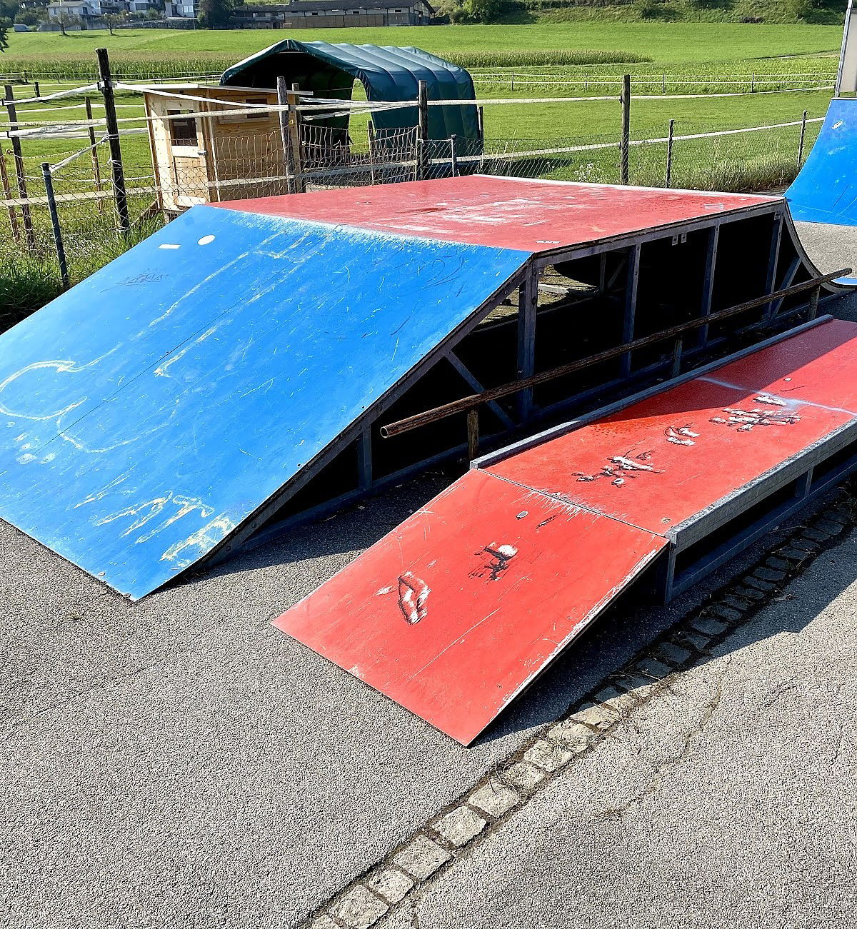 Schüpfen skatepark is made up of a back and forth run with a quarter pipe and bank on the sides of a jumpbox.