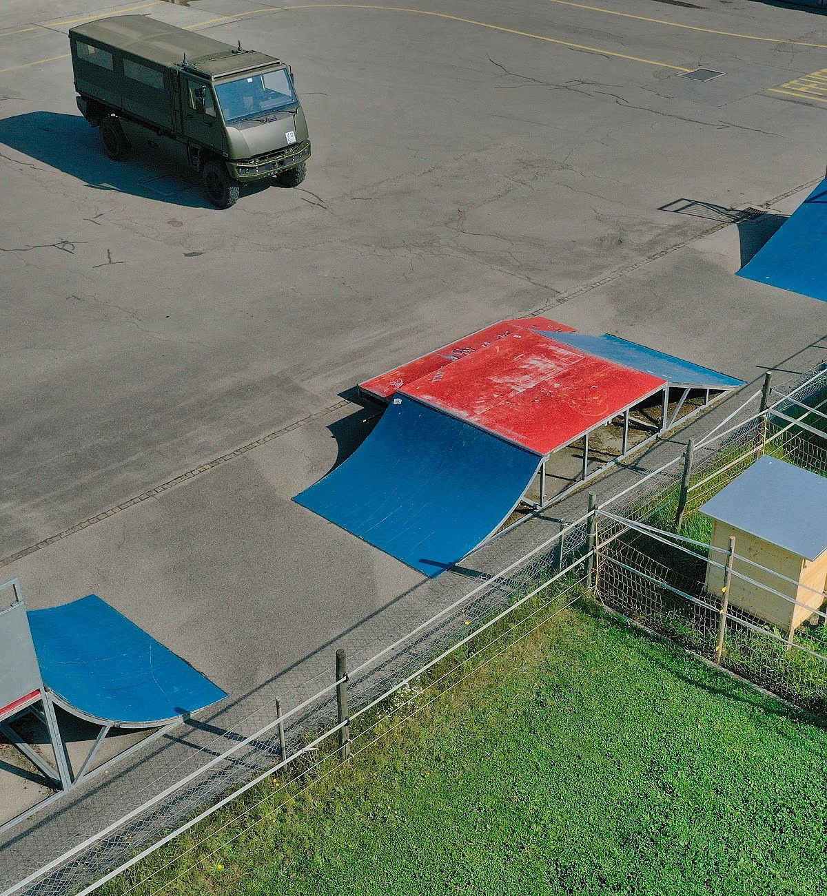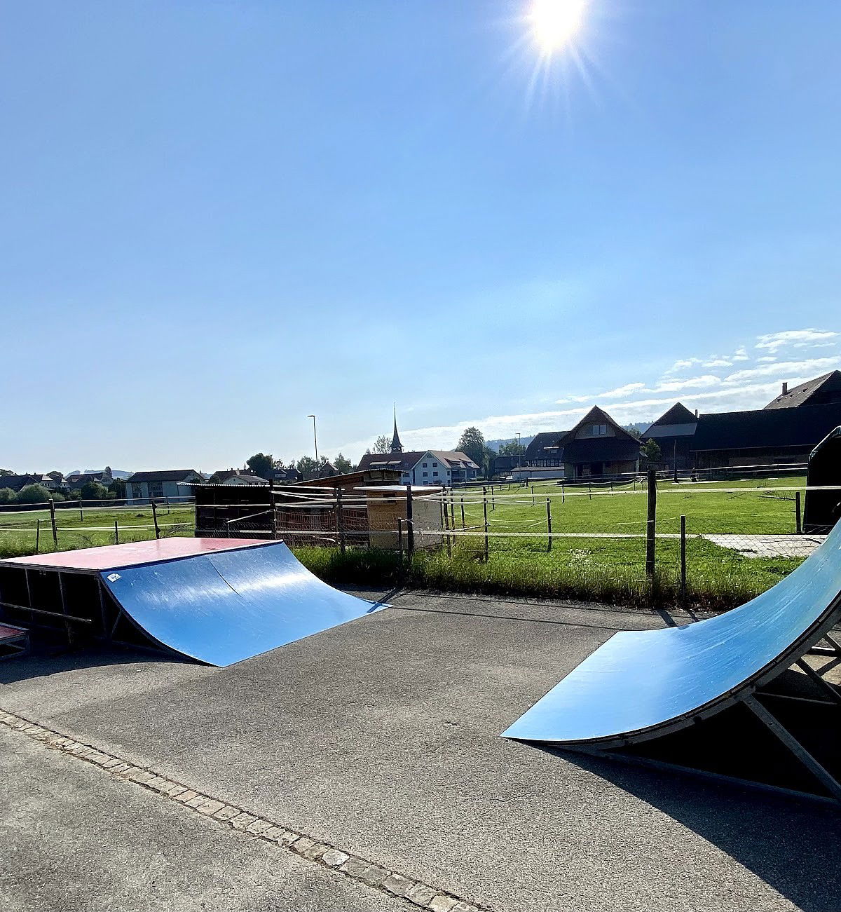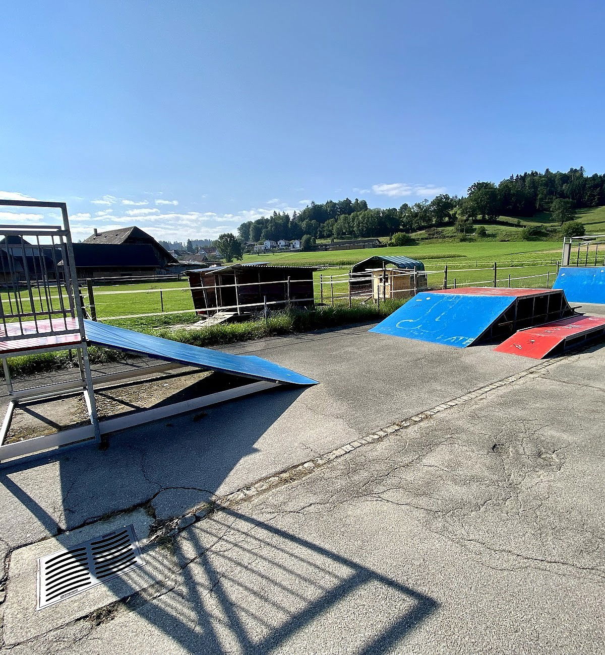 Schüpfen skatepark is made up of a back and forth run with a quarter pipe and bank on the sides of a jumpbox.