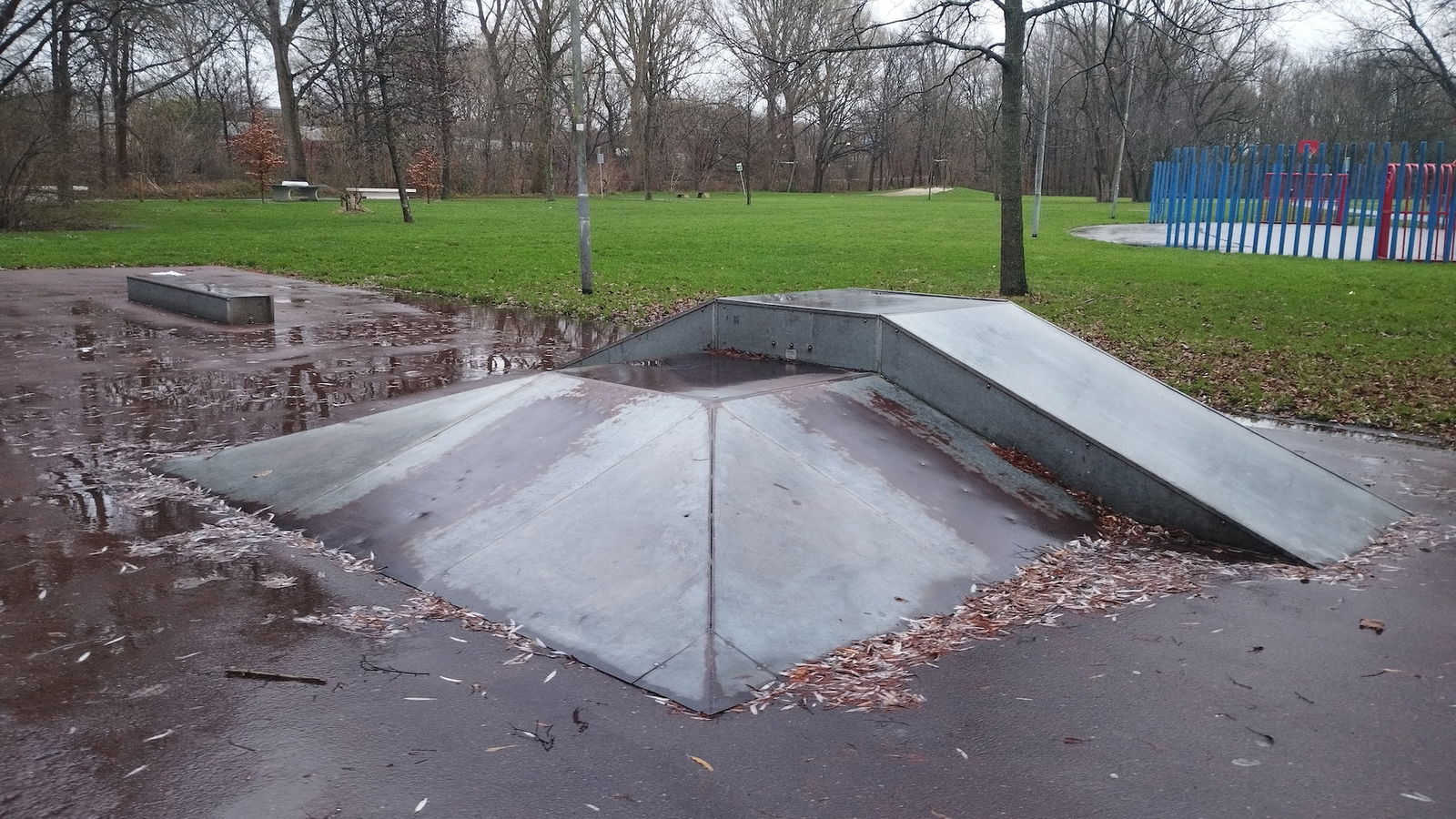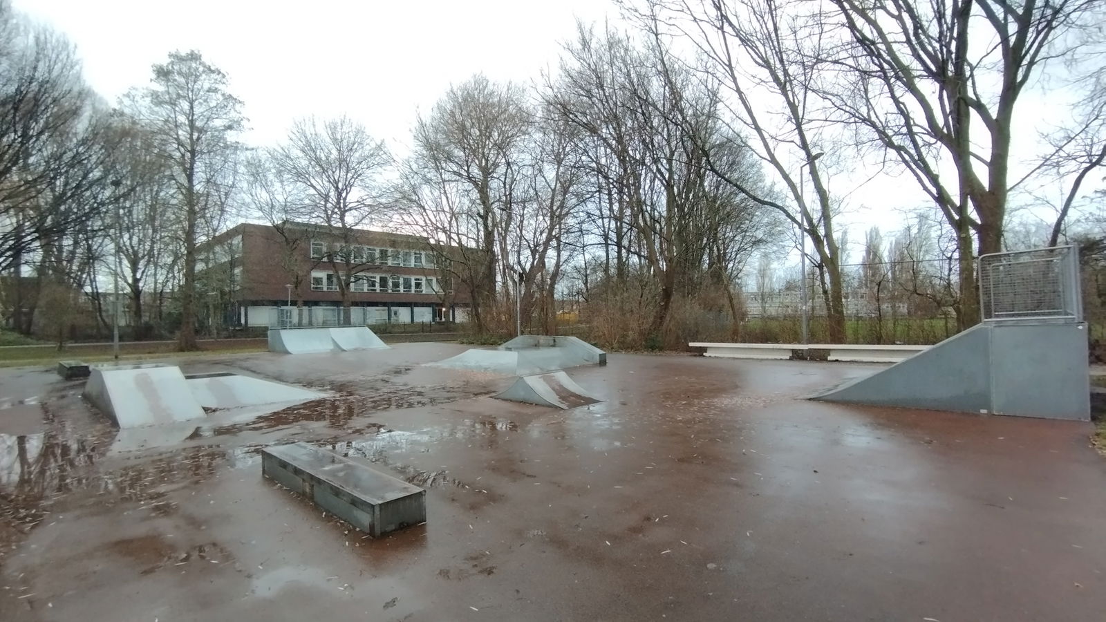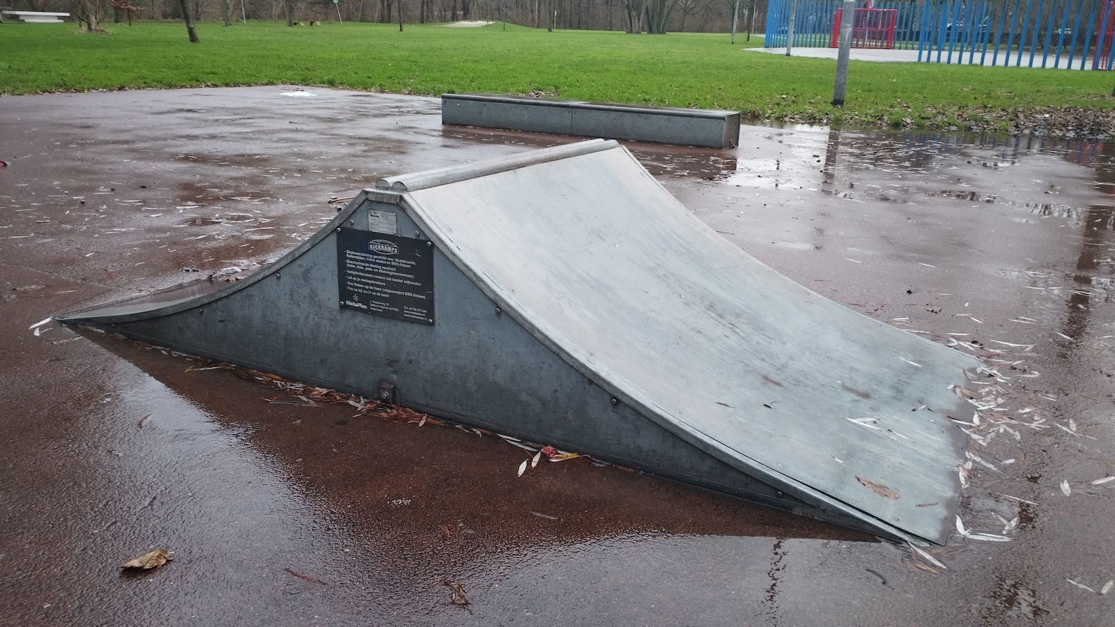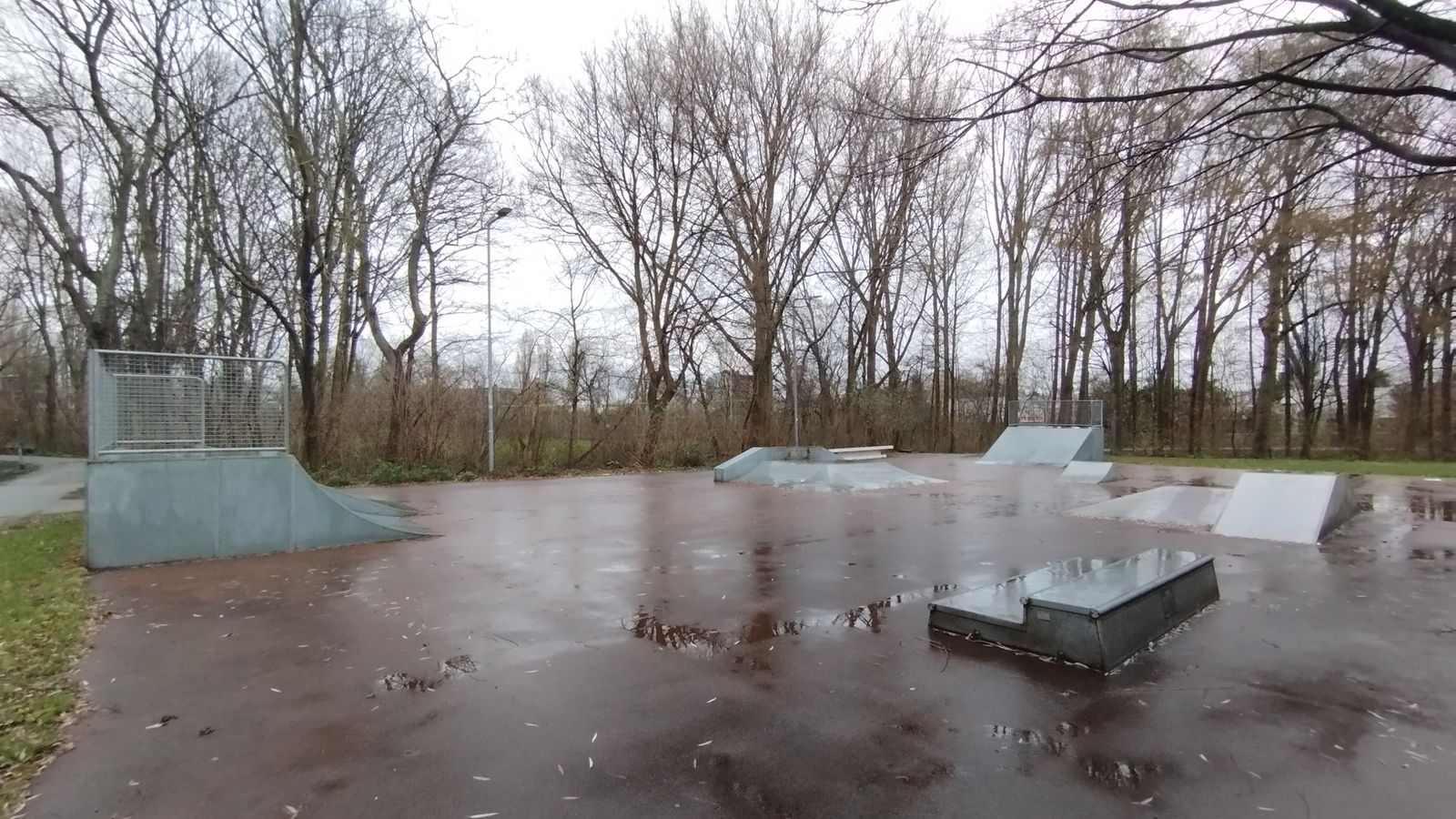 Sidelingepark skatepark is made up of a back and forth run with a quarter pipe and flat bank on either side of a funbox.