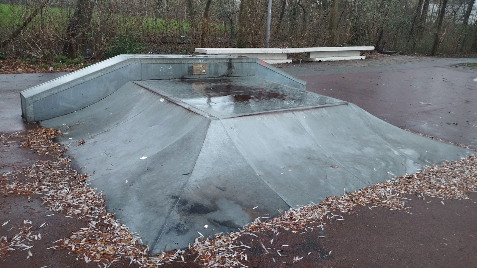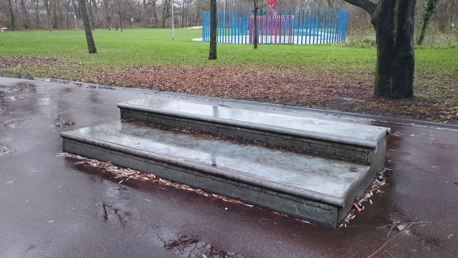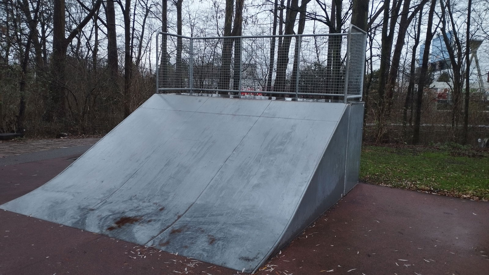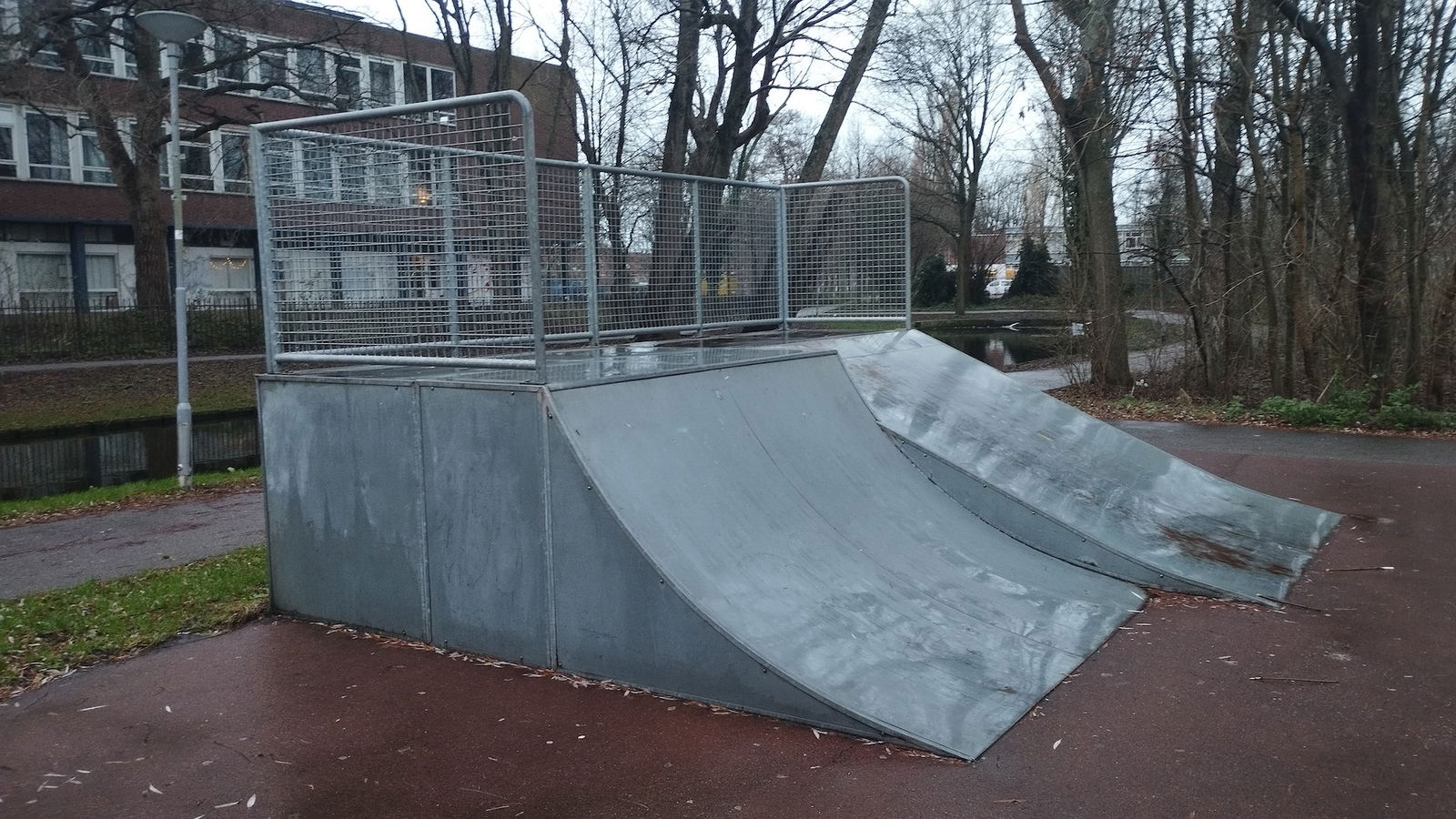 Sidelingepark skatepark is made up of a back and forth run with a quarter pipe and flat bank on either side of a funbox.