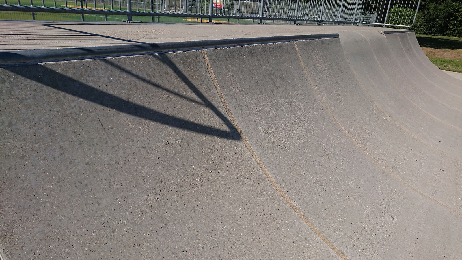 Concrete skatepark which is seemingly built by someone who doesn't know anything about skateboarding, because it is made up of different concrete sections with a concrete joint between them that is lower...