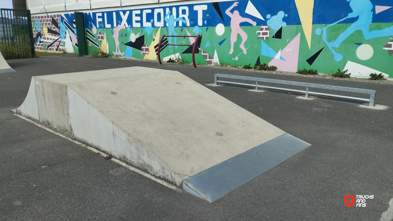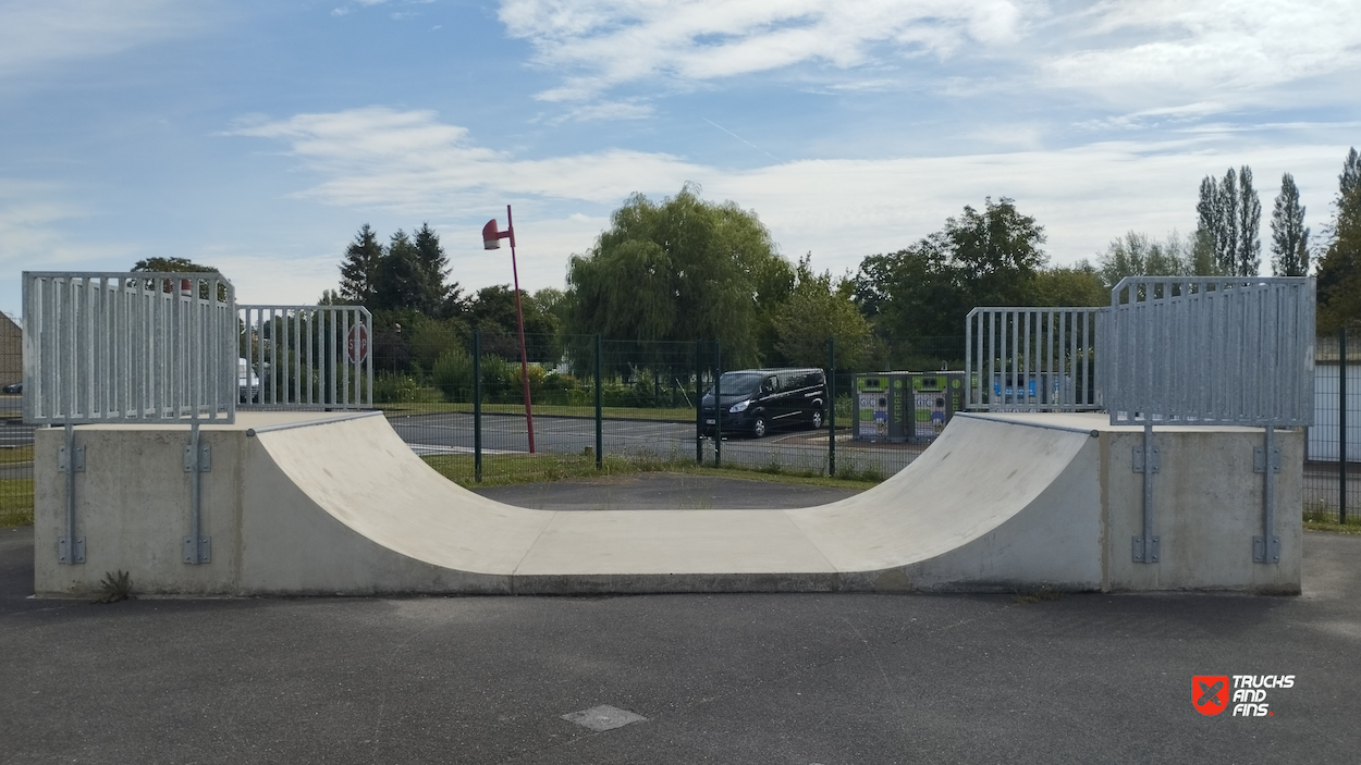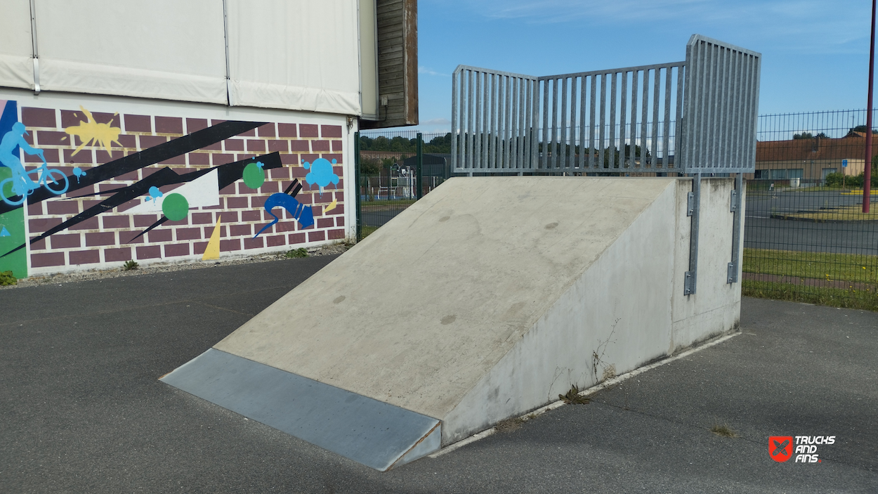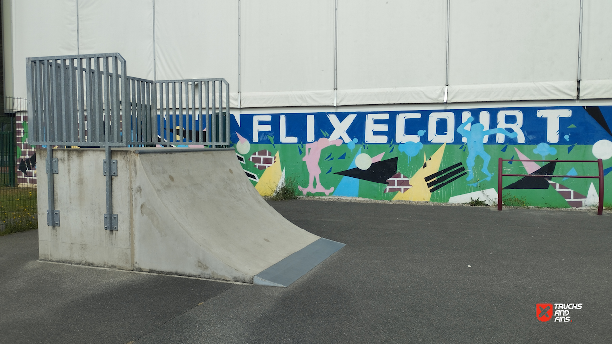 Flixecourt skatepark is made up of a back and forth run with a quarter pipe and flat bank on either side of a jumpbox. The skatepark also features a miniramp.