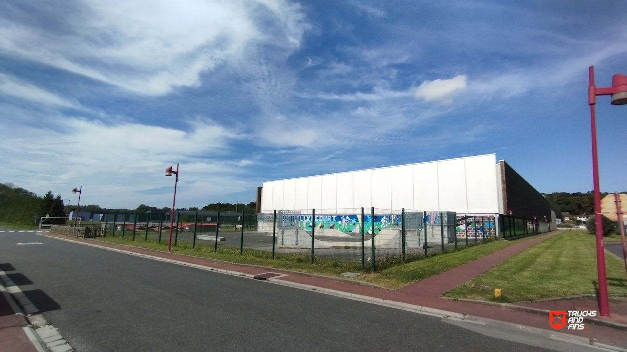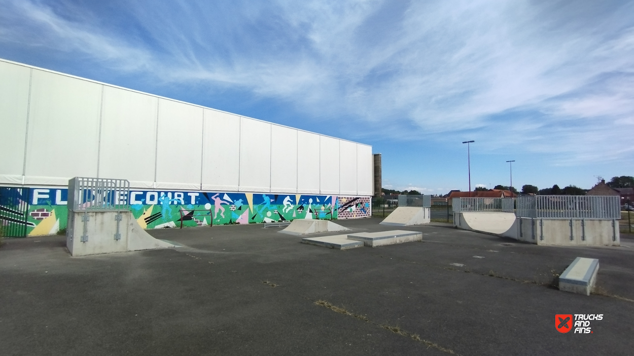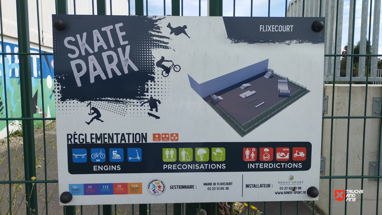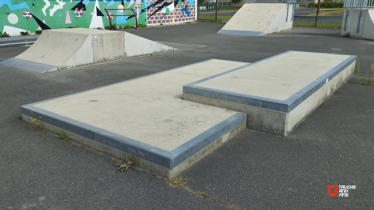 Flixecourt skatepark is made up of a back and forth run with a quarter pipe and flat bank on either side of a jumpbox. The skatepark also features a miniramp.