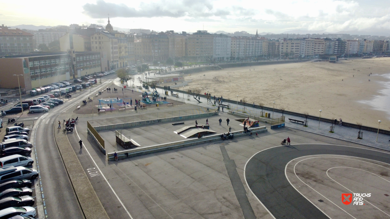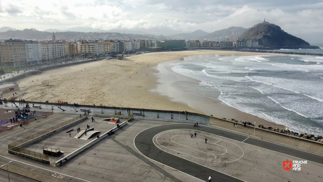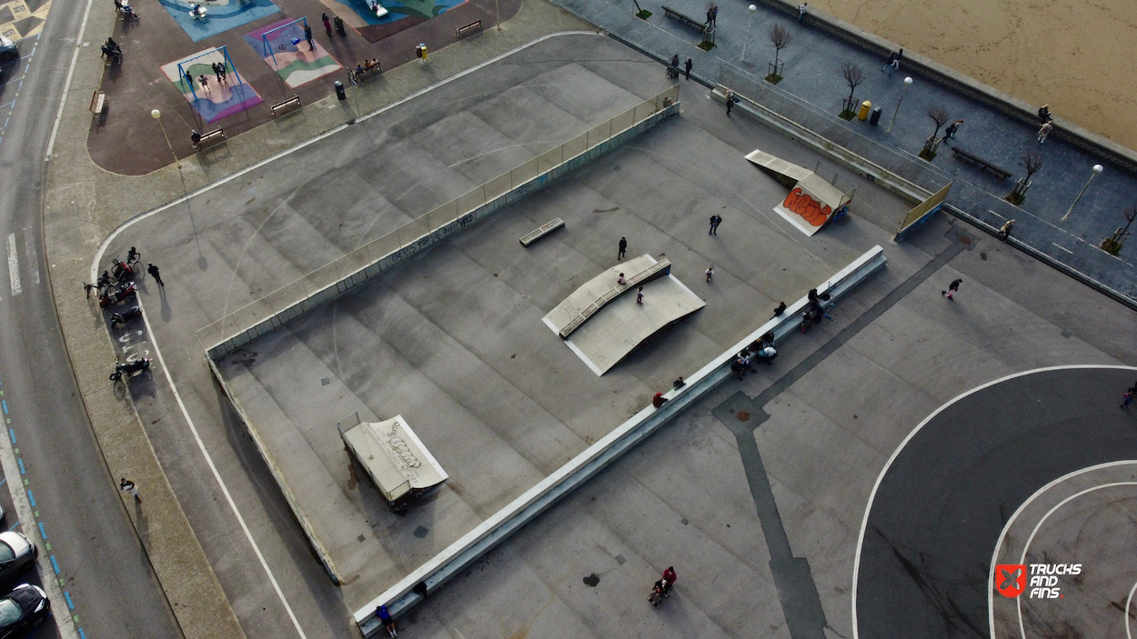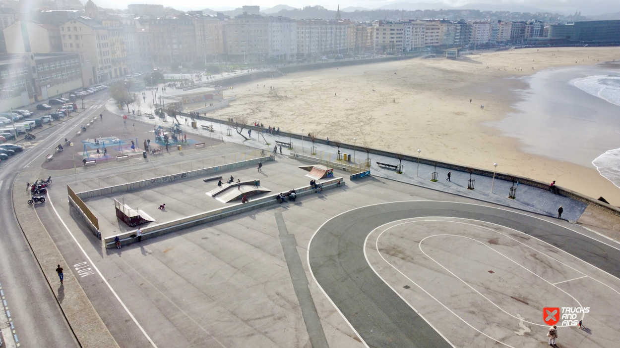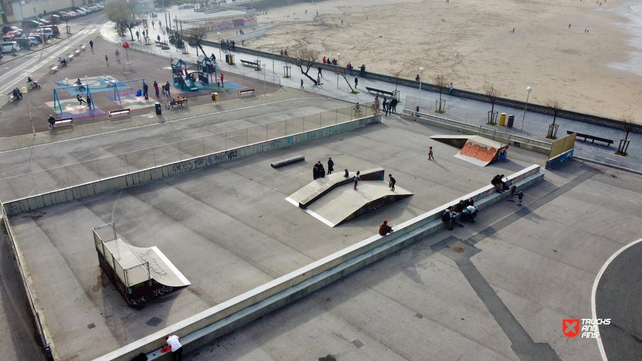 Skatepark Sagües is made up of a back and forth run with a quarter pipe and bank on the sides of a funbox. The skatepark is located at the beach. So bring your surfboard!