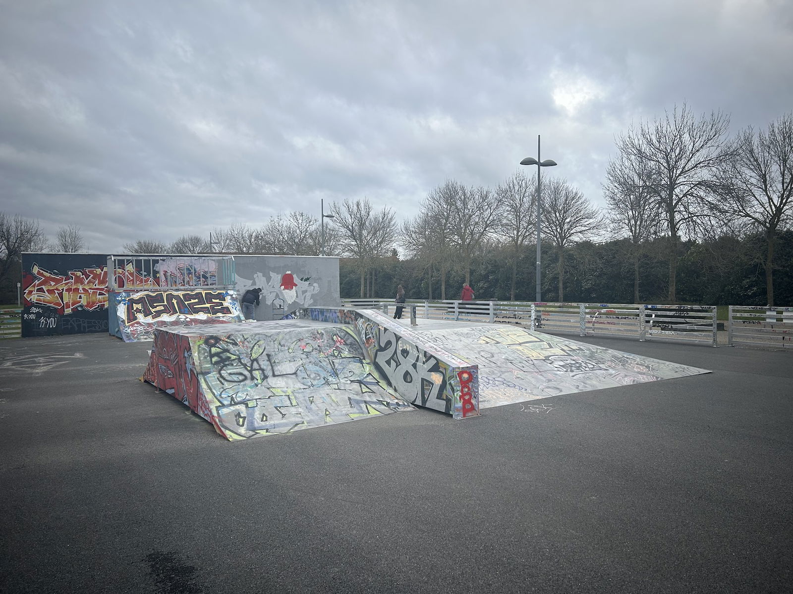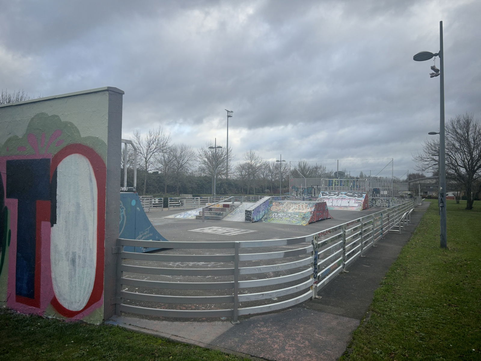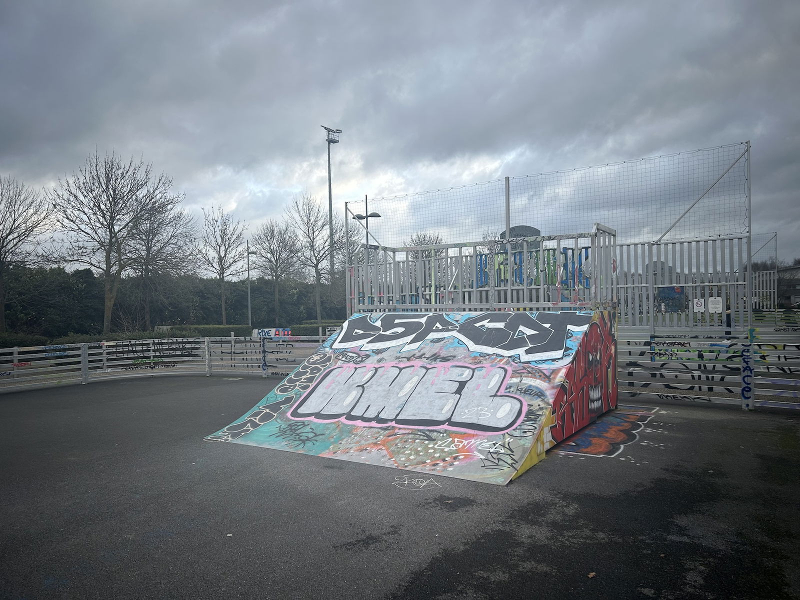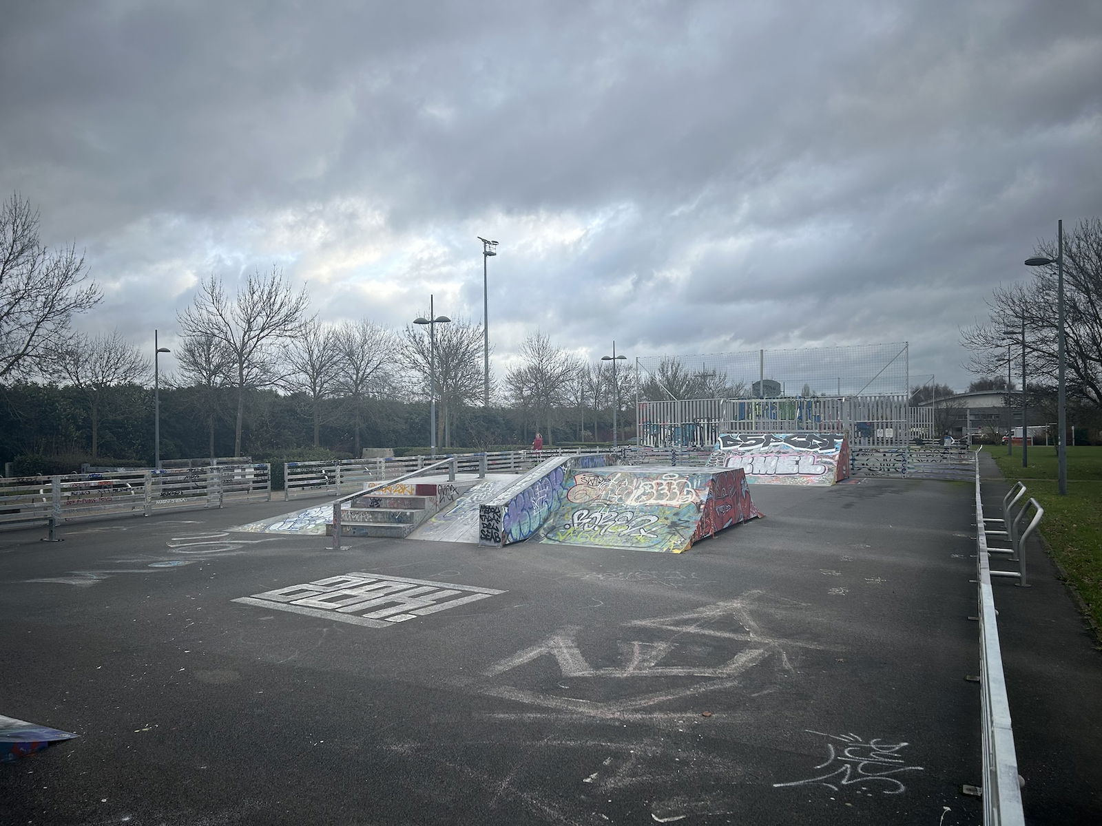 Skatepark de Lezennes is made up of a back and forth run with a quarter pipe and bank on the sides of a funbox. The skatepark has lights.