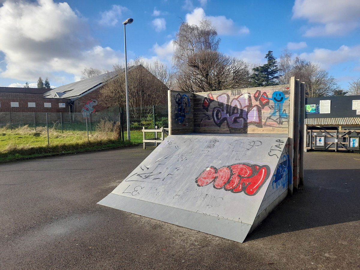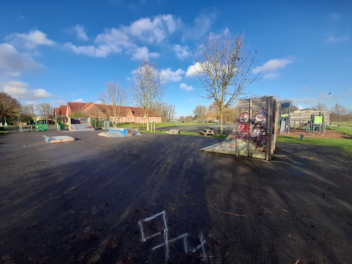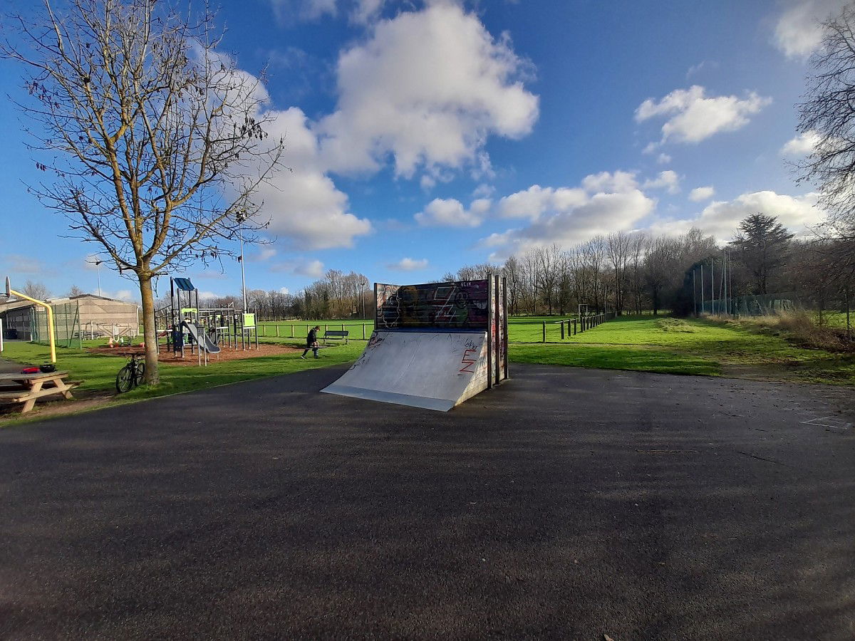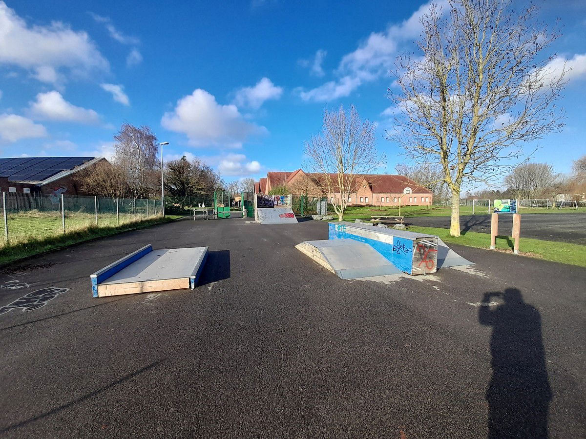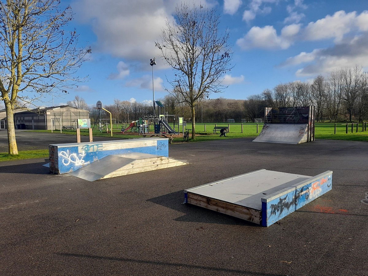 Tressin skatepark is made up of a back and forth run with a quarter pipe and bank on the sides of a funbox.