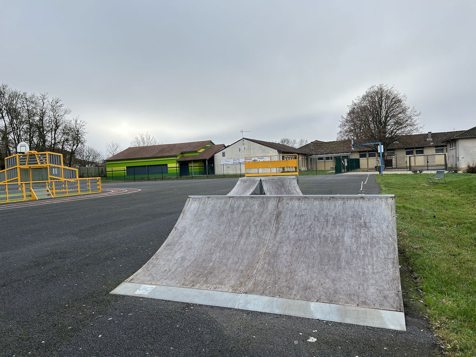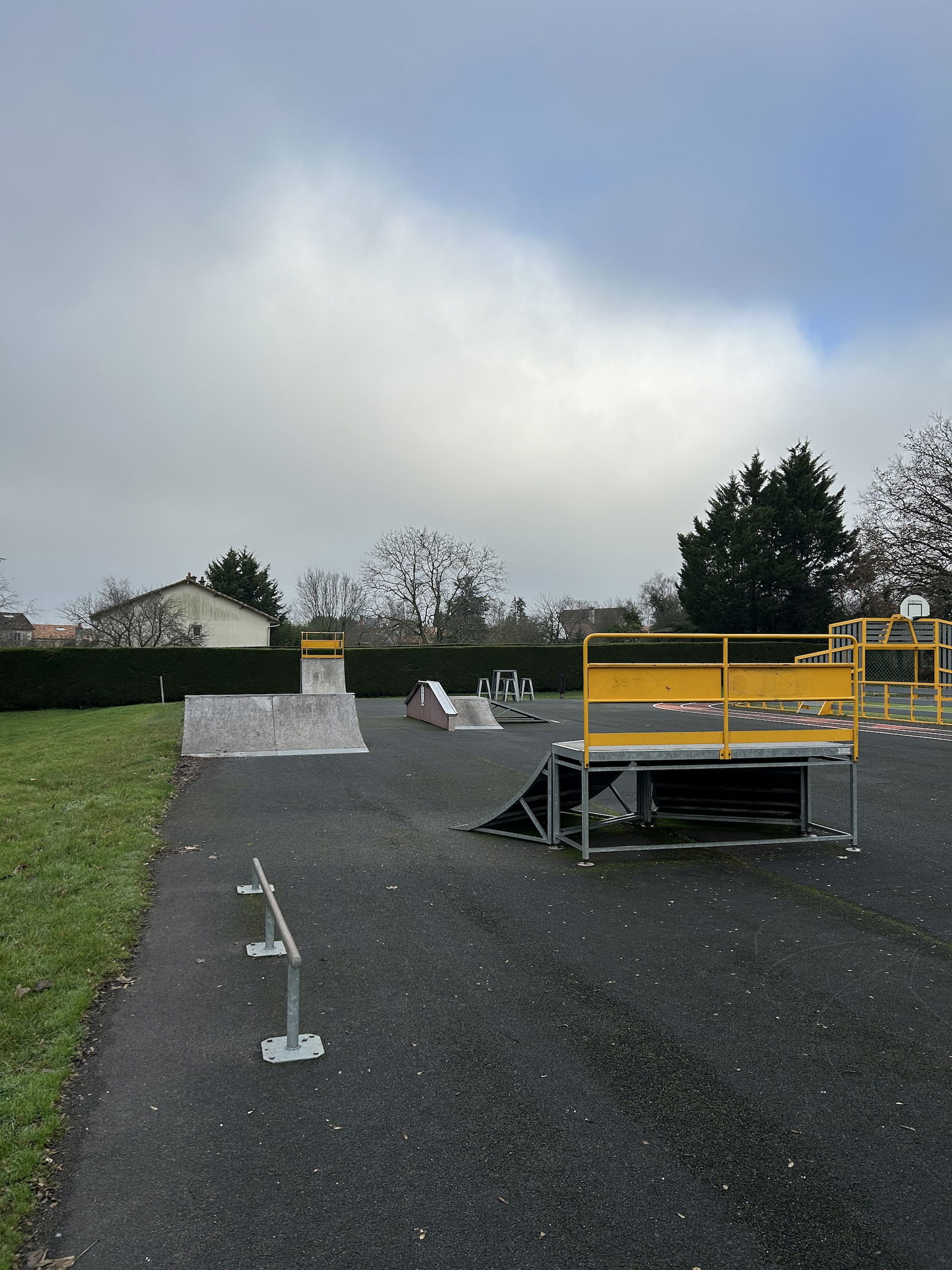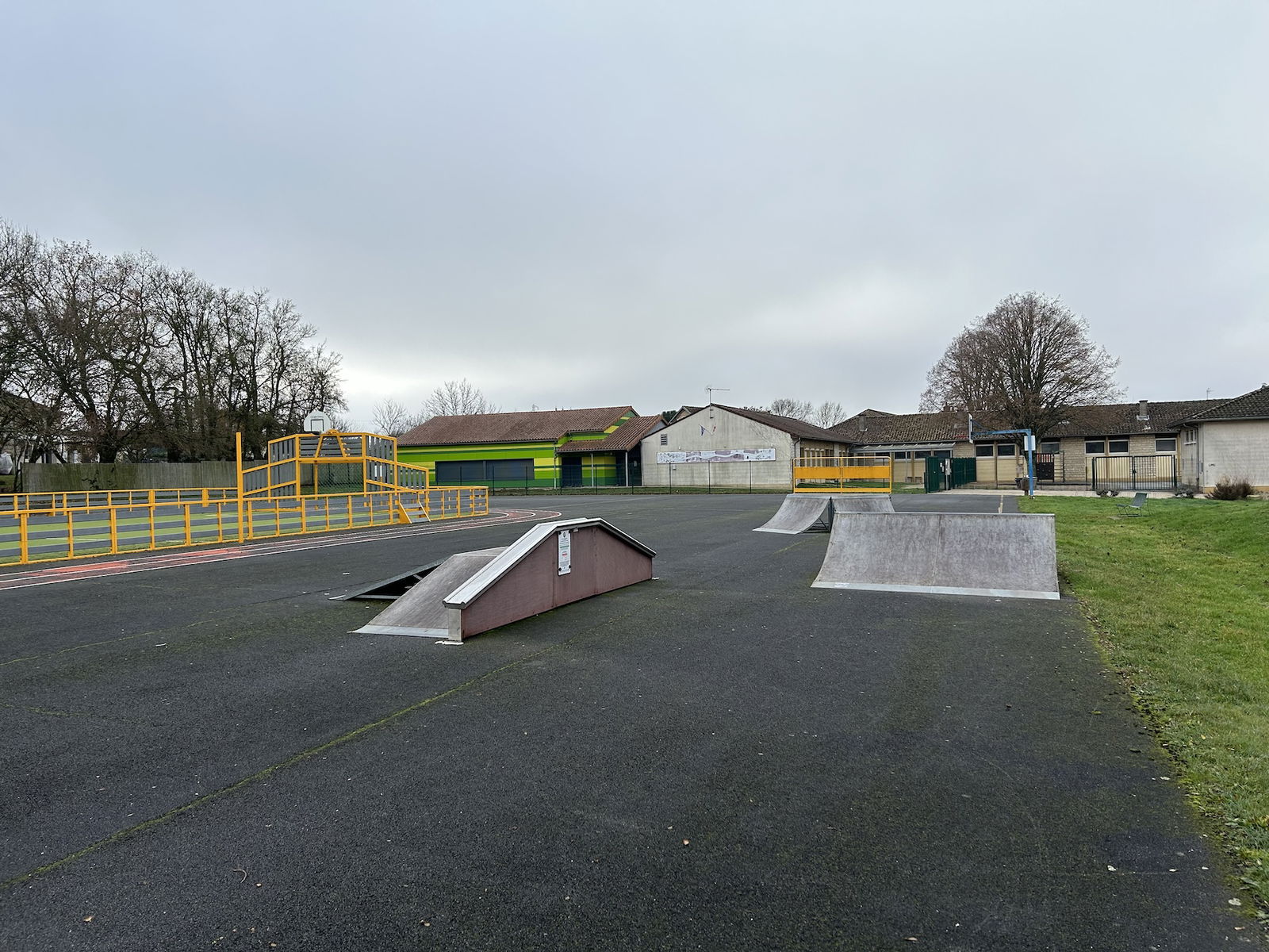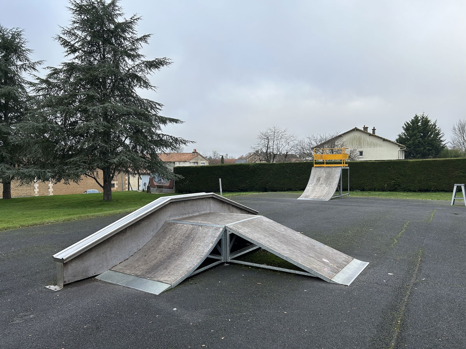 Smarves skatepark is made up of a back and forth run with a quarter pipe on both sides of a funbox.