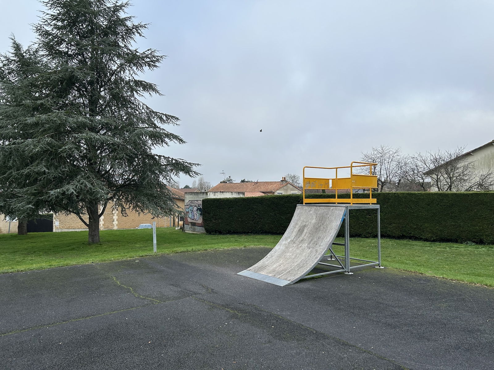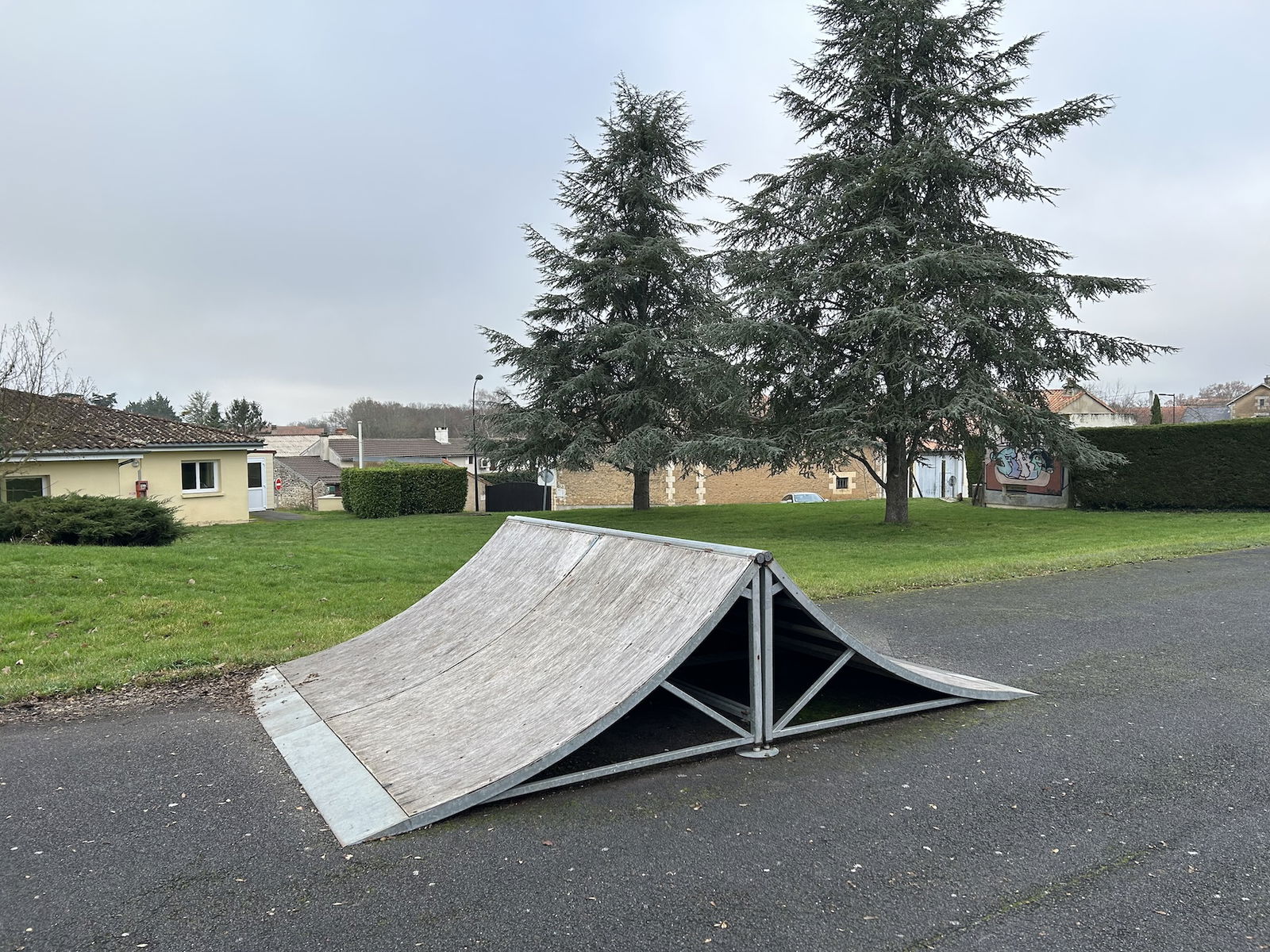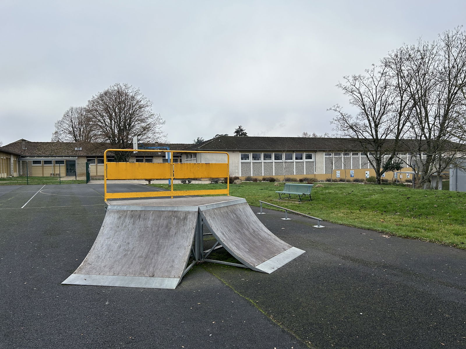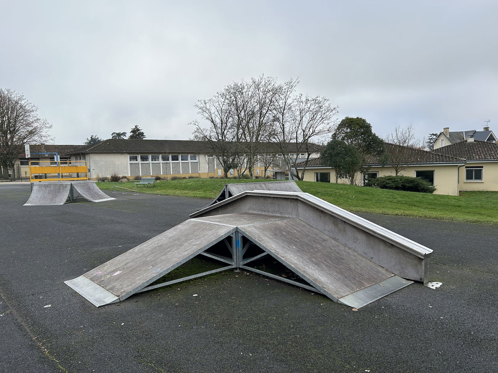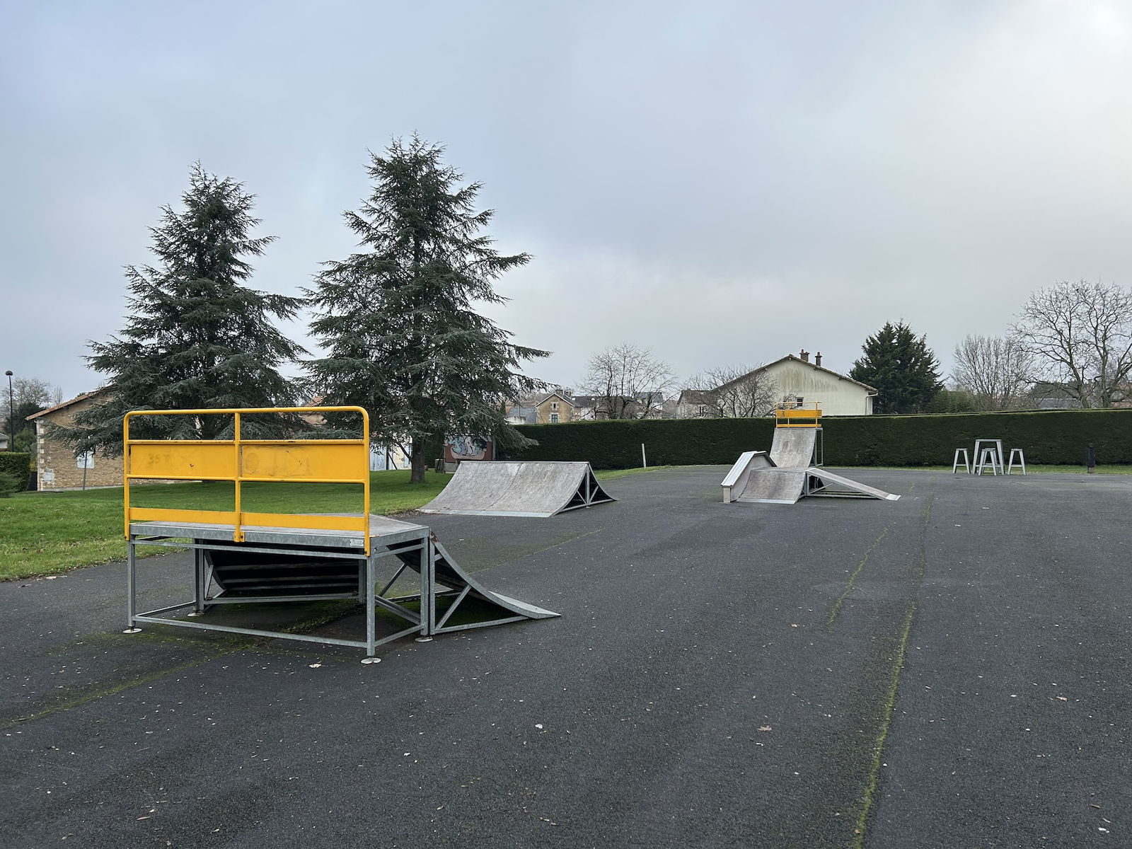 Smarves skatepark is made up of a back and forth run with a quarter pipe on both sides of a funbox.