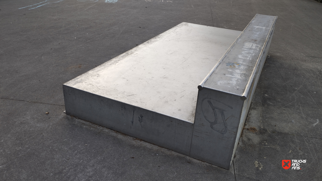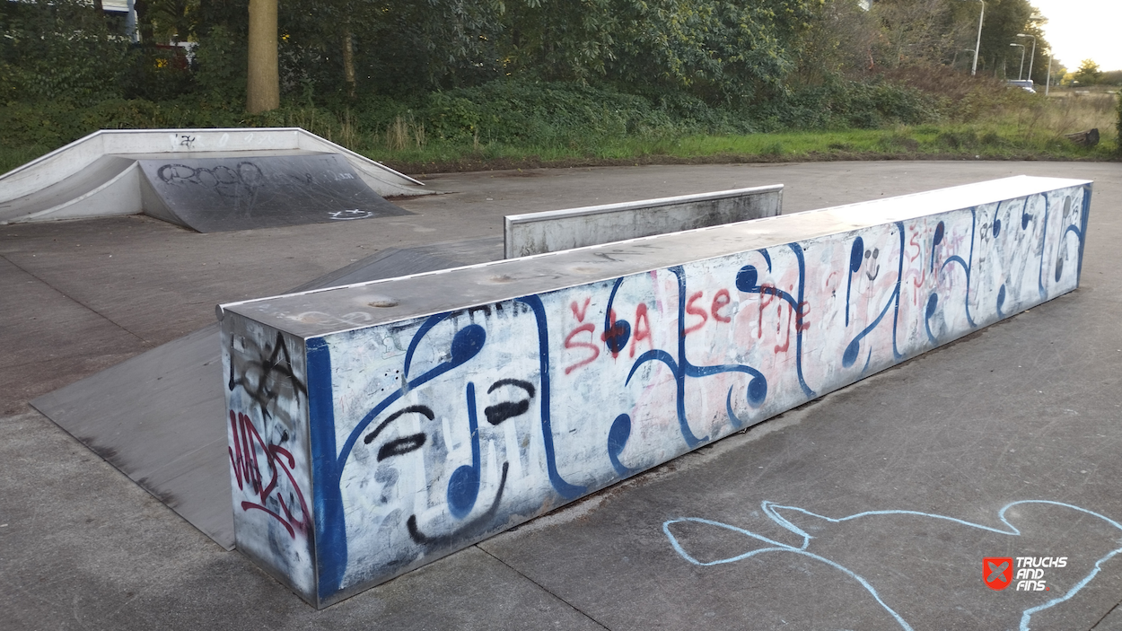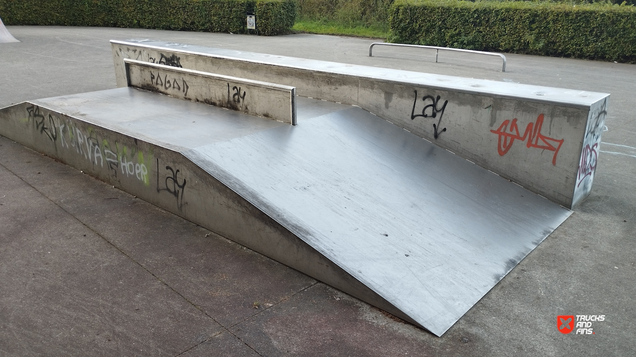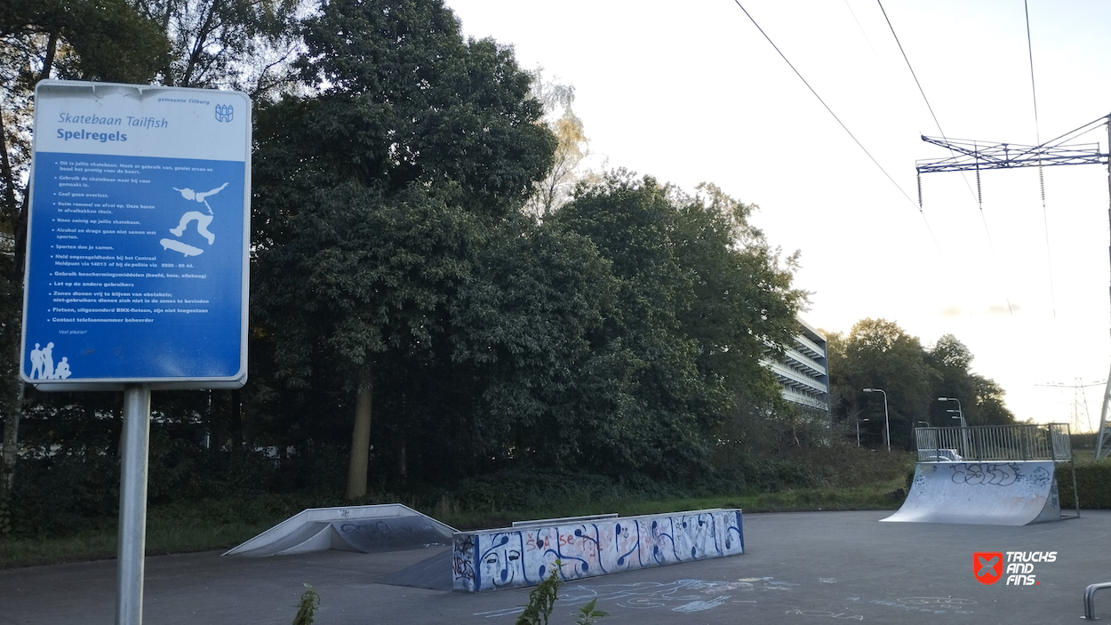 Tailfish skatepark is made up of a back and forth run with a quarter pipe and bank on the sides of a funbox.