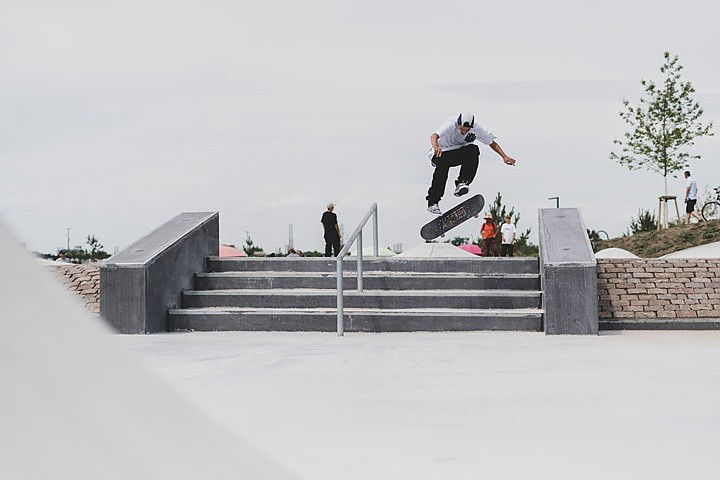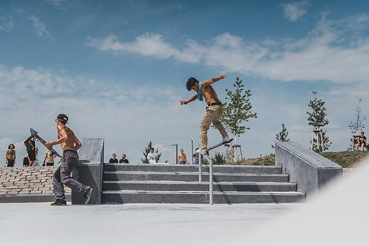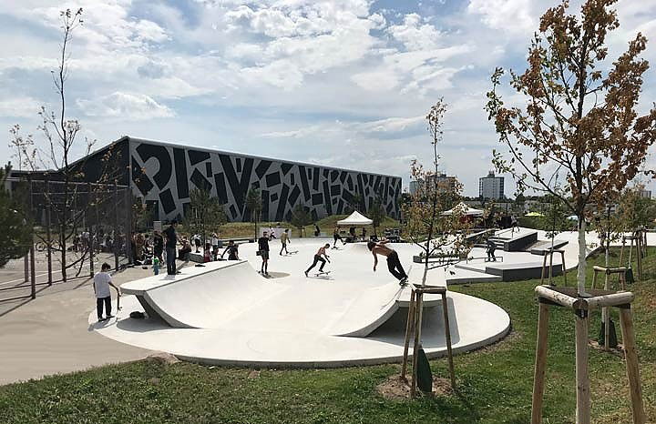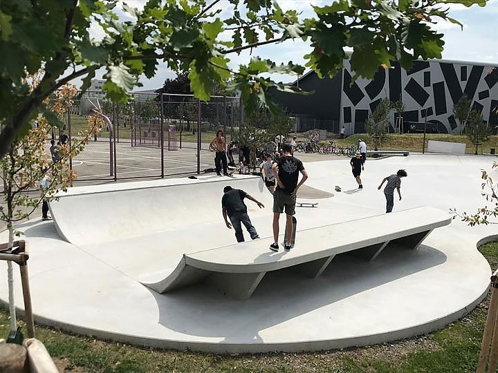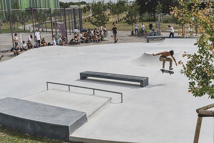 The skatepark features a street-plaza layout with a variety of obstacles, such as a volcano, spine, hubbas, and quarterpipes, making it suitable for different styles of skating. The park includes manual pads, ledges, stairs, handrails, and a miniramp, catering to both advanced and beginner skaters. Its design emphasizes blending seamlessly with the surrounding park, offering skaters a dynamic urban environment.