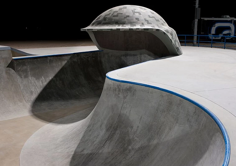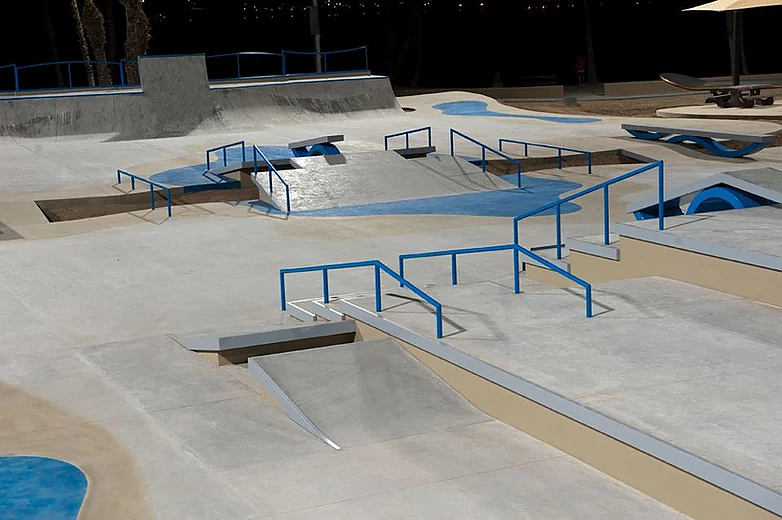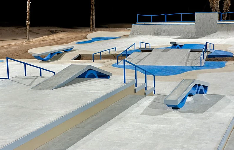 The park's construction was spearheaded by California Skateparks, a renowned skatepark design and construction firm, with the design heavily influenced by the Street League Skateboarding (SLS) courses, specifically taking inspiration from the 2013 X Games in Foz do Iguaçu, Brazil. The upper portion of the park features a backyard-style bowl, a flow course, and a wall ride around a palm tree, while the lower section is dedicated to street skating with stairs, rails, and other technical obstacles. One unique feature is a bowl shaped like a military helmet, a powerful symbol dedicated to Patrick Tinnell.