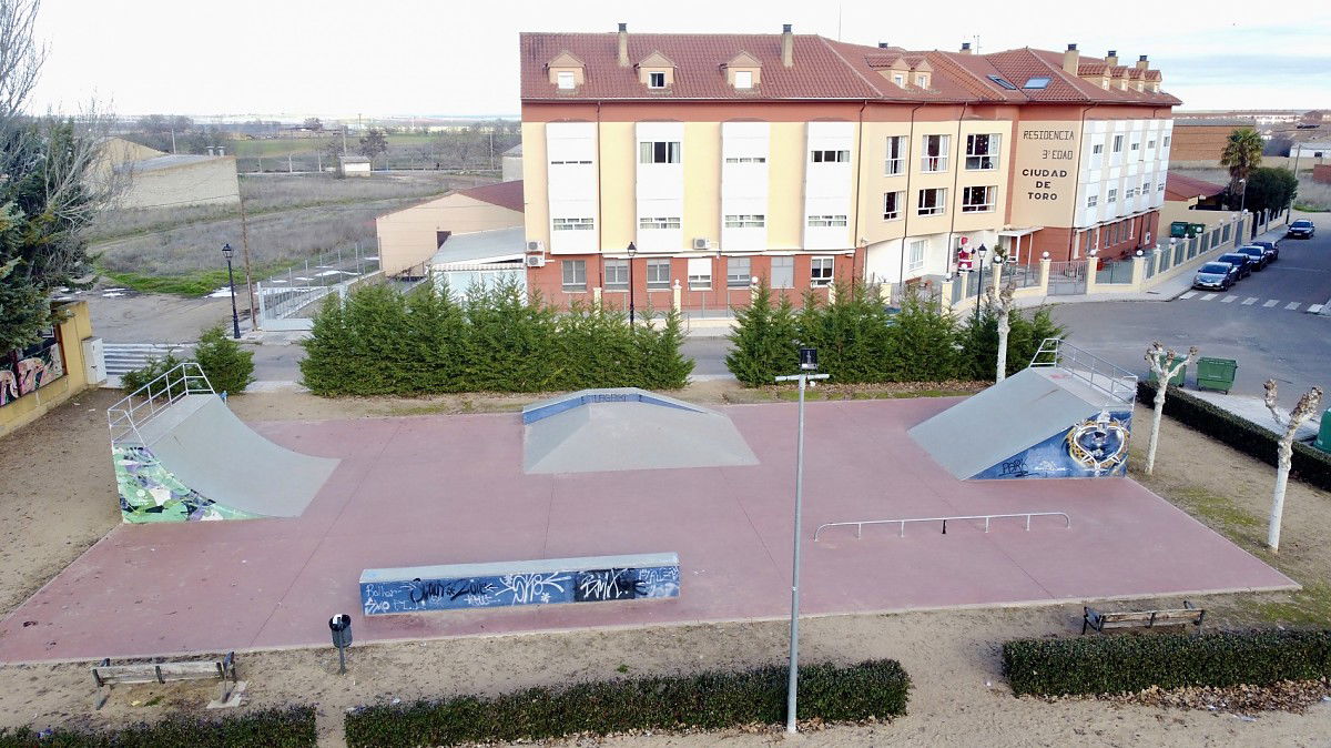 Toro skatepark is made up of a back and forth run with a quarter pipe and bank on the sides of a funbox.