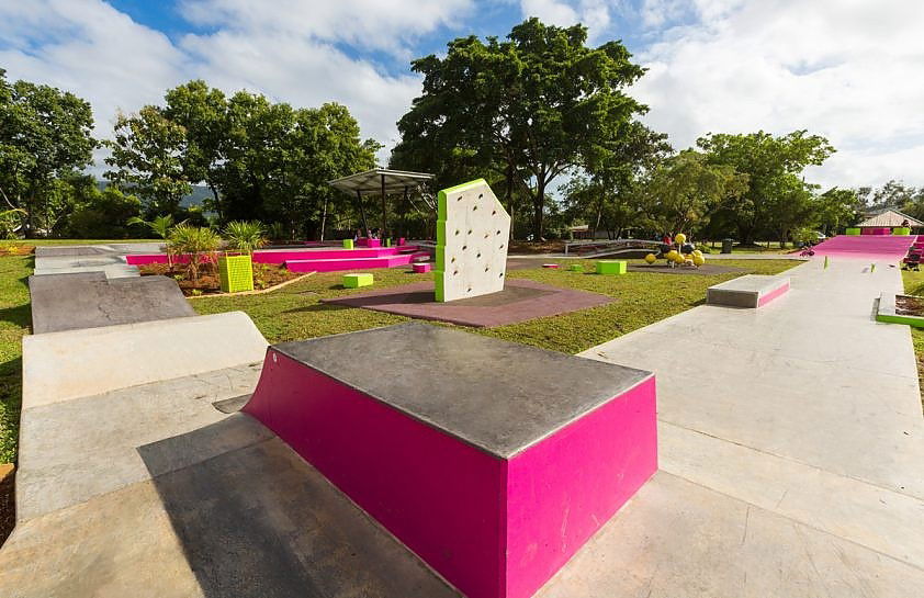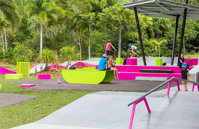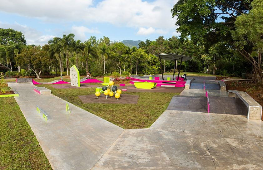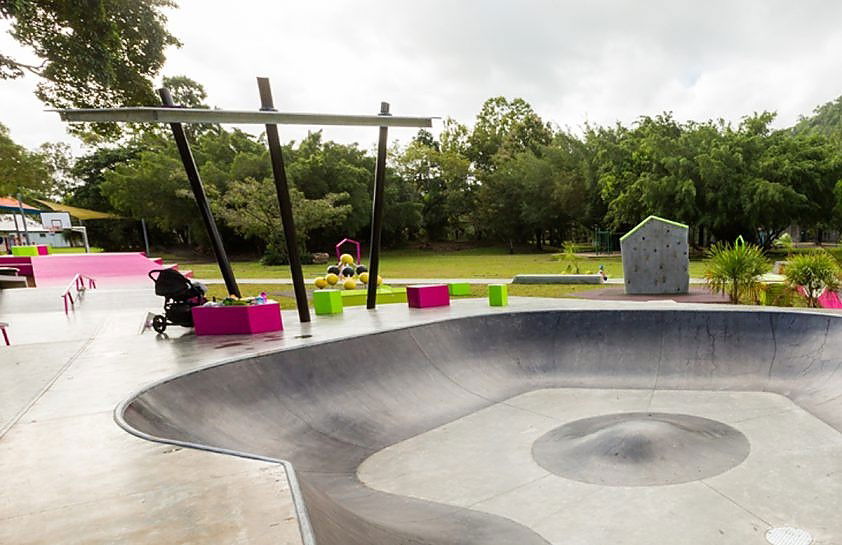 The Trinity Skatepark, also known as Coast Watchers Skatepark, is located in Trinity Beach, Queensland. Opened in 2016, this skatepark was designed and constructed by Convic Skateparks, one of Australia’s leading skatepark builders. The park spans approximately 950 square meters and includes several key features that cater to skaters of all skill levels. These include a concrete bowl, flat banks, unique speed bumps resembling a pump track, and additional recreational features such as a half-court, bouldering wall, and parkour elements. The vibrant, tropical-themed design makes it a standout facility in the Cairns area.