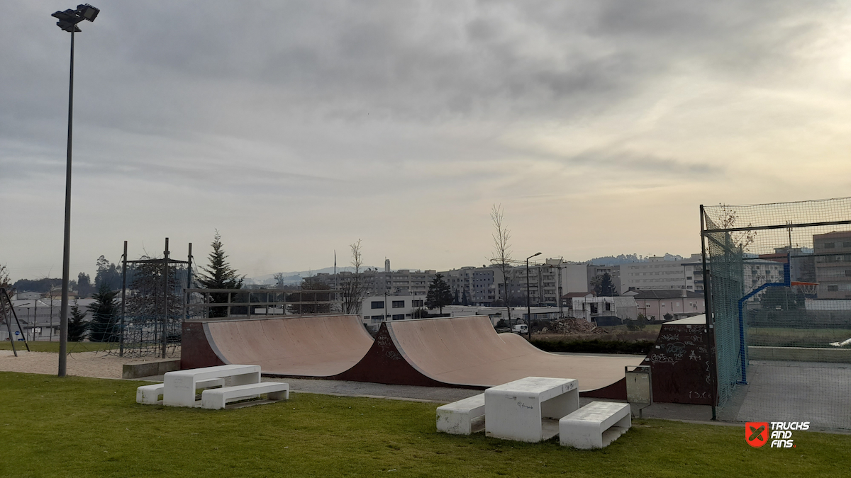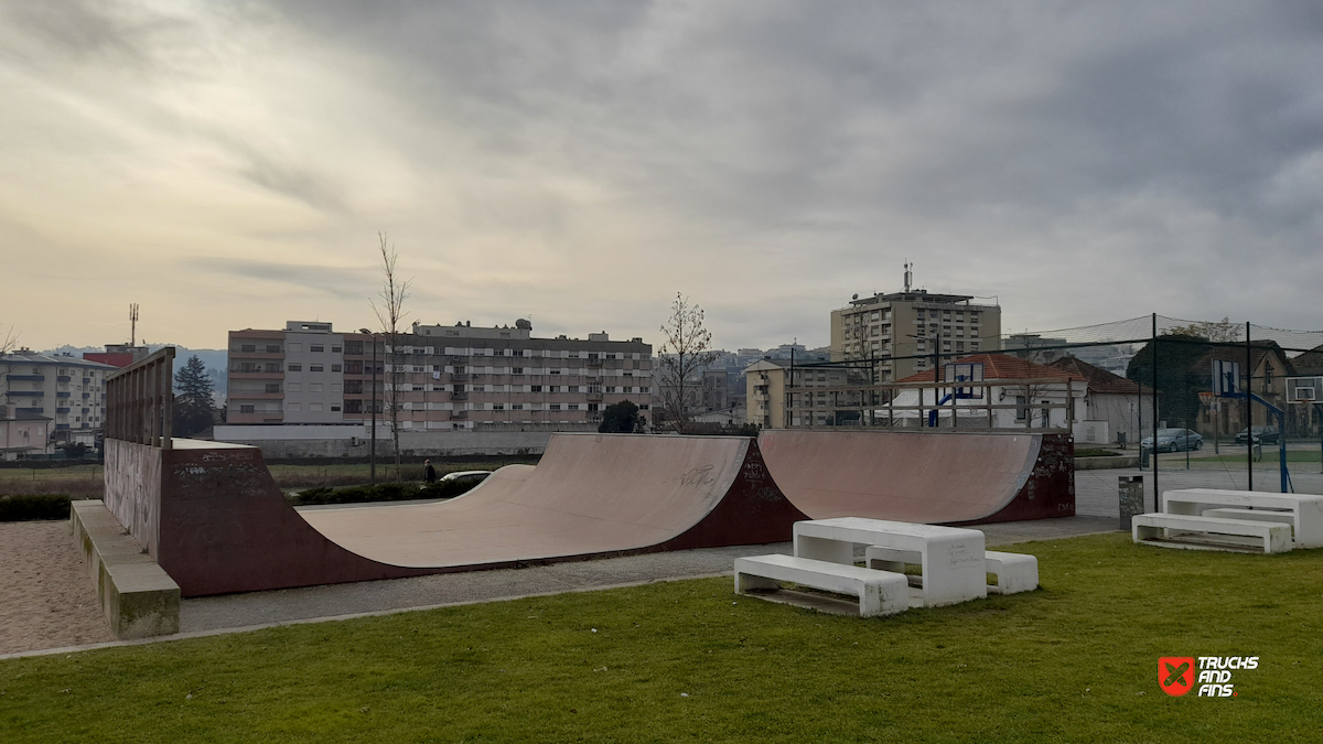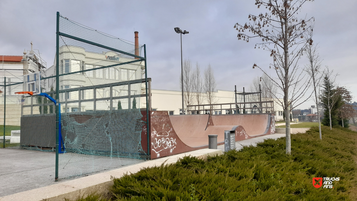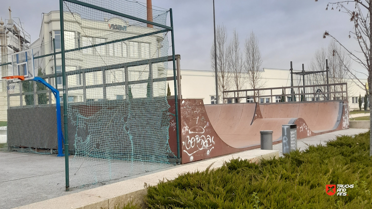 The skatepark features a wooden miniramp with spine with a speedbump.